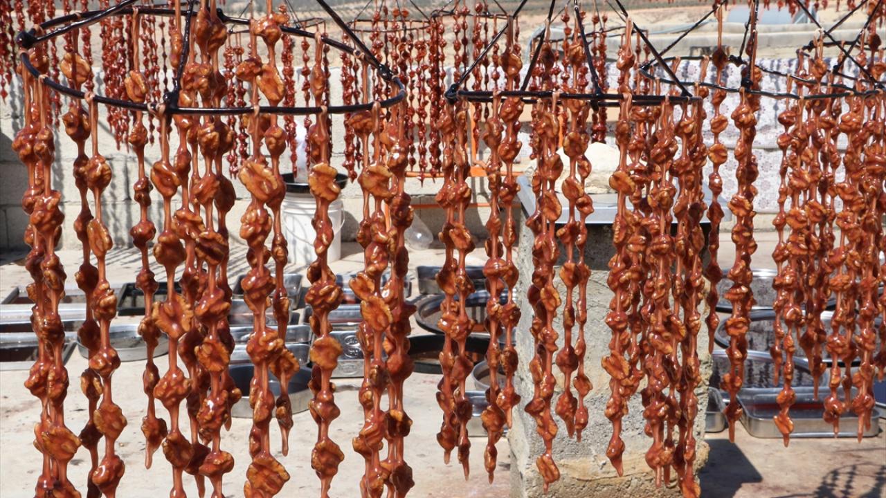 Daha önce ipe dizilip kurutulan ceviz içleri bu karışıma batırıldıktan sonra tekrar kurutulmaya bırakılıyor.