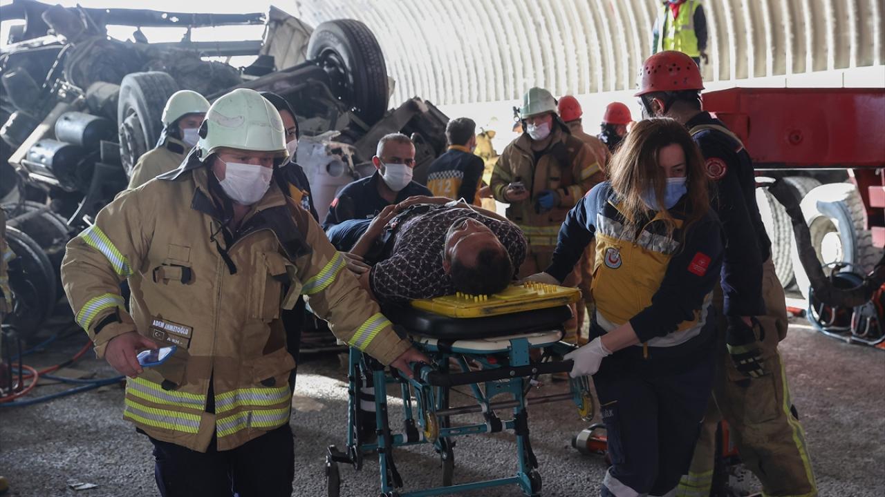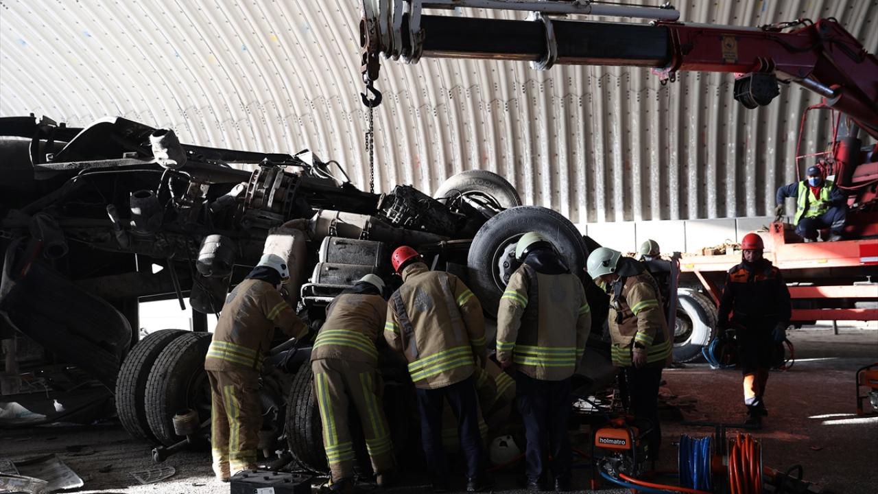 İtfaiye ekipleri, devrilen tırda sıkışan sürücüyü kurtarmak için uzun süre çalışma yaptı.