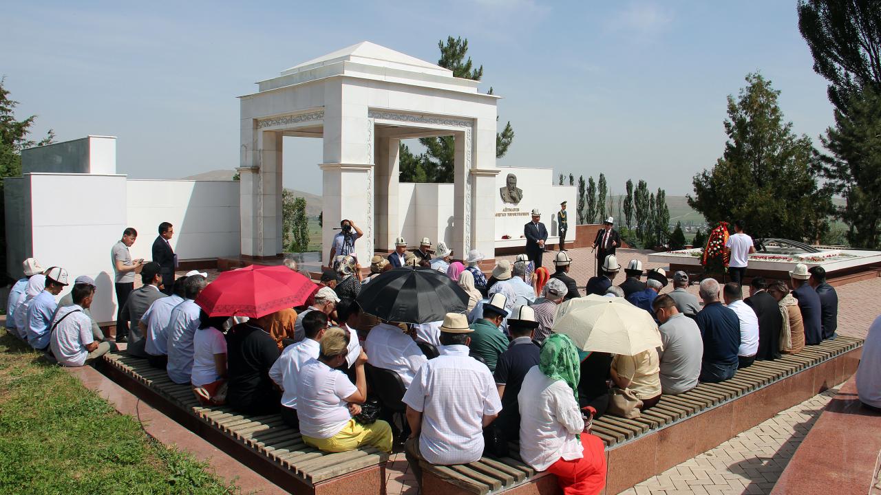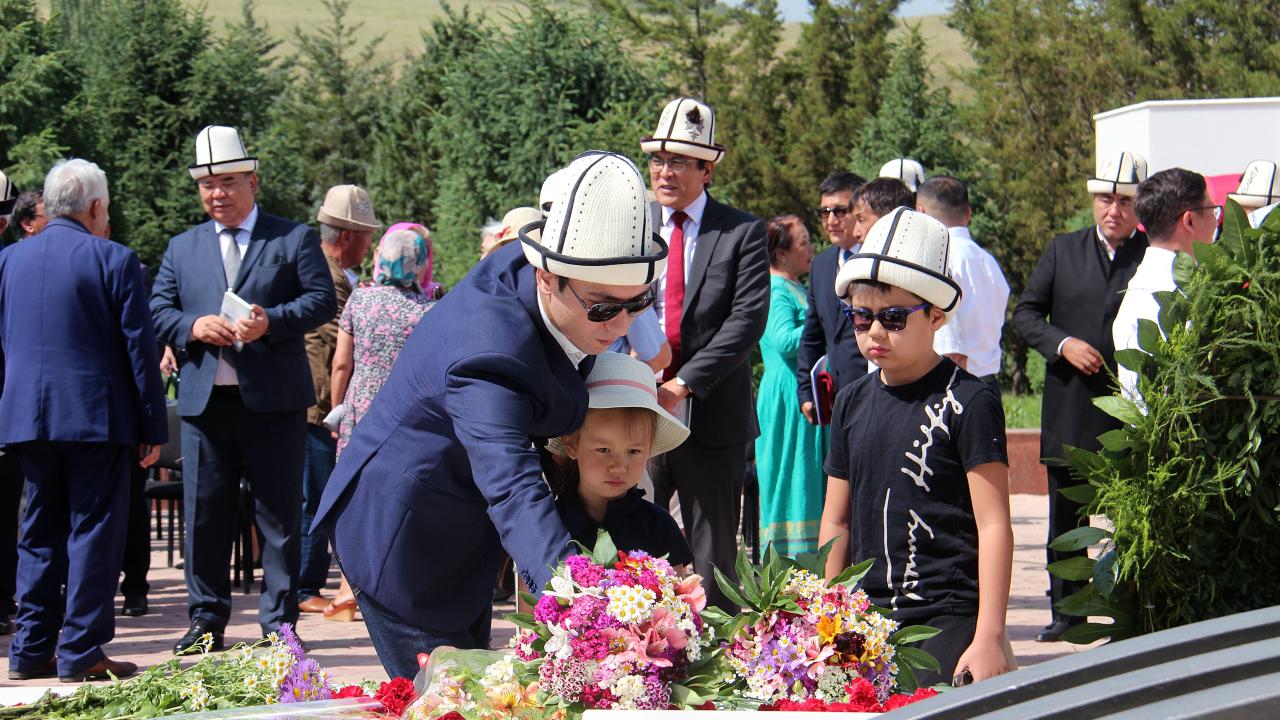 Aytmatov`un kabrine Cumhurbaşkanı Sadır Caparov`un adına çelenk ve çiçekler bırakılırken Kur`an-ı Kerim okundu, dualar edildi ve yazarla anılar paylaşıldı.