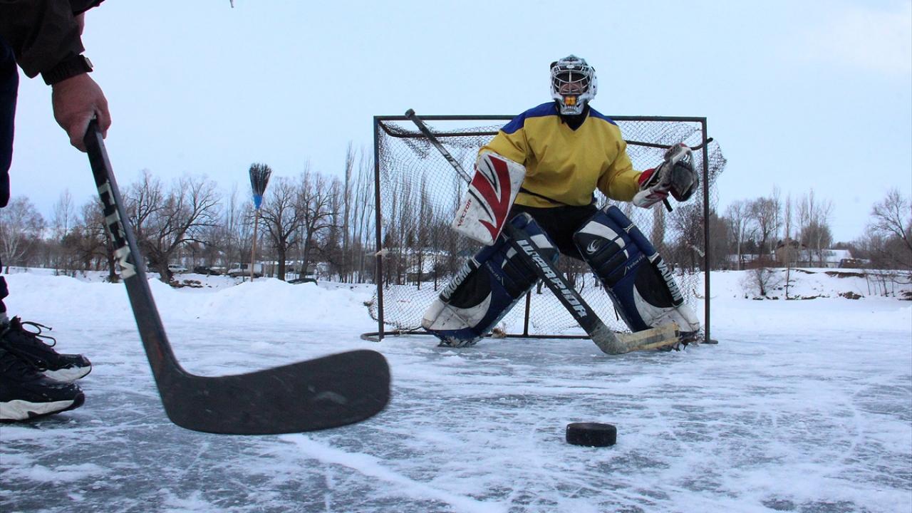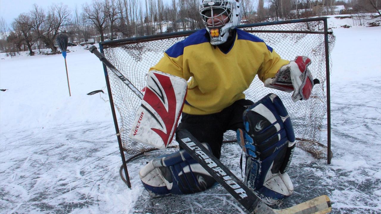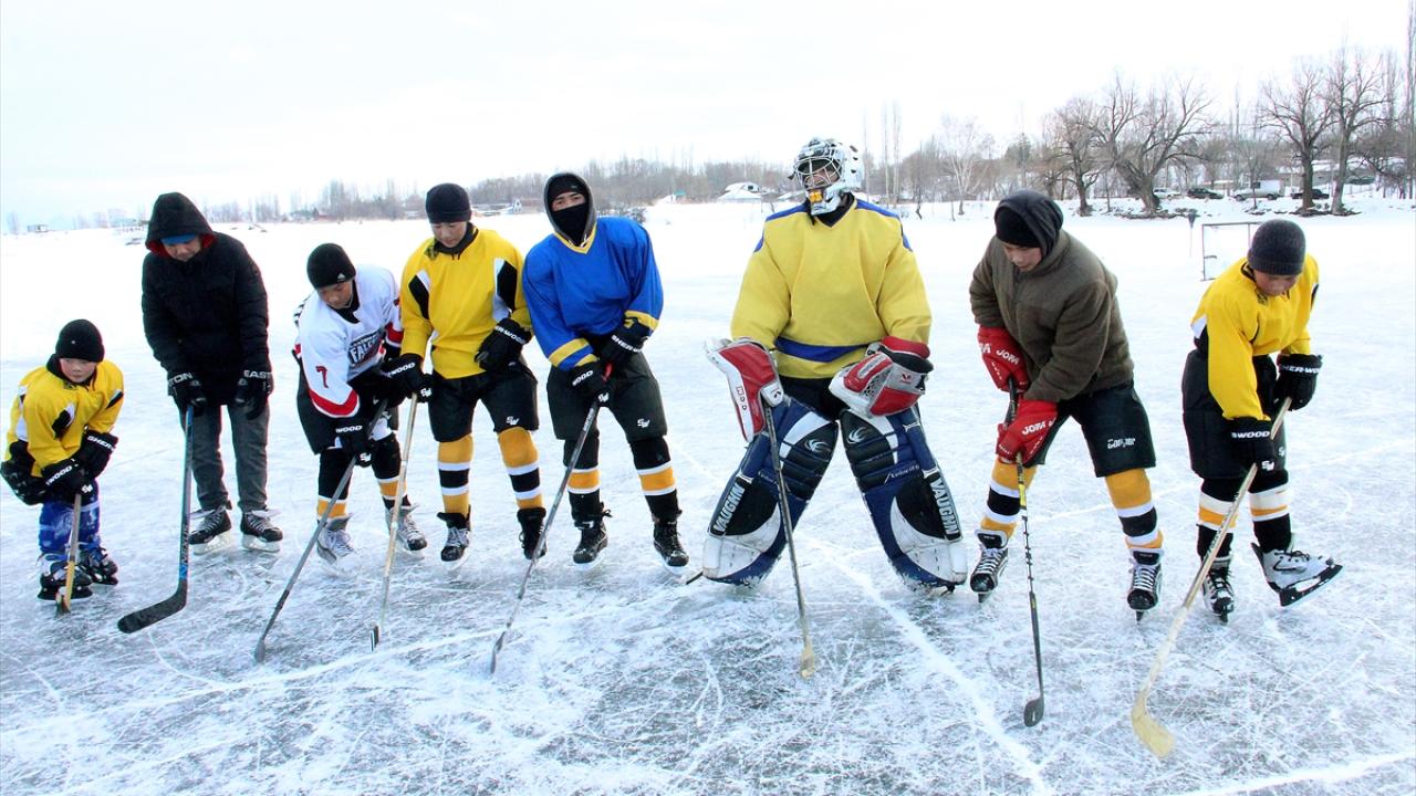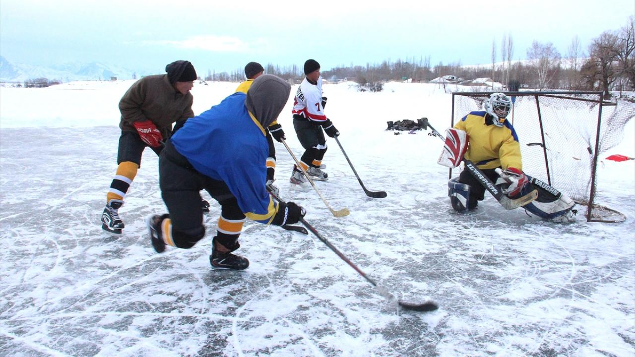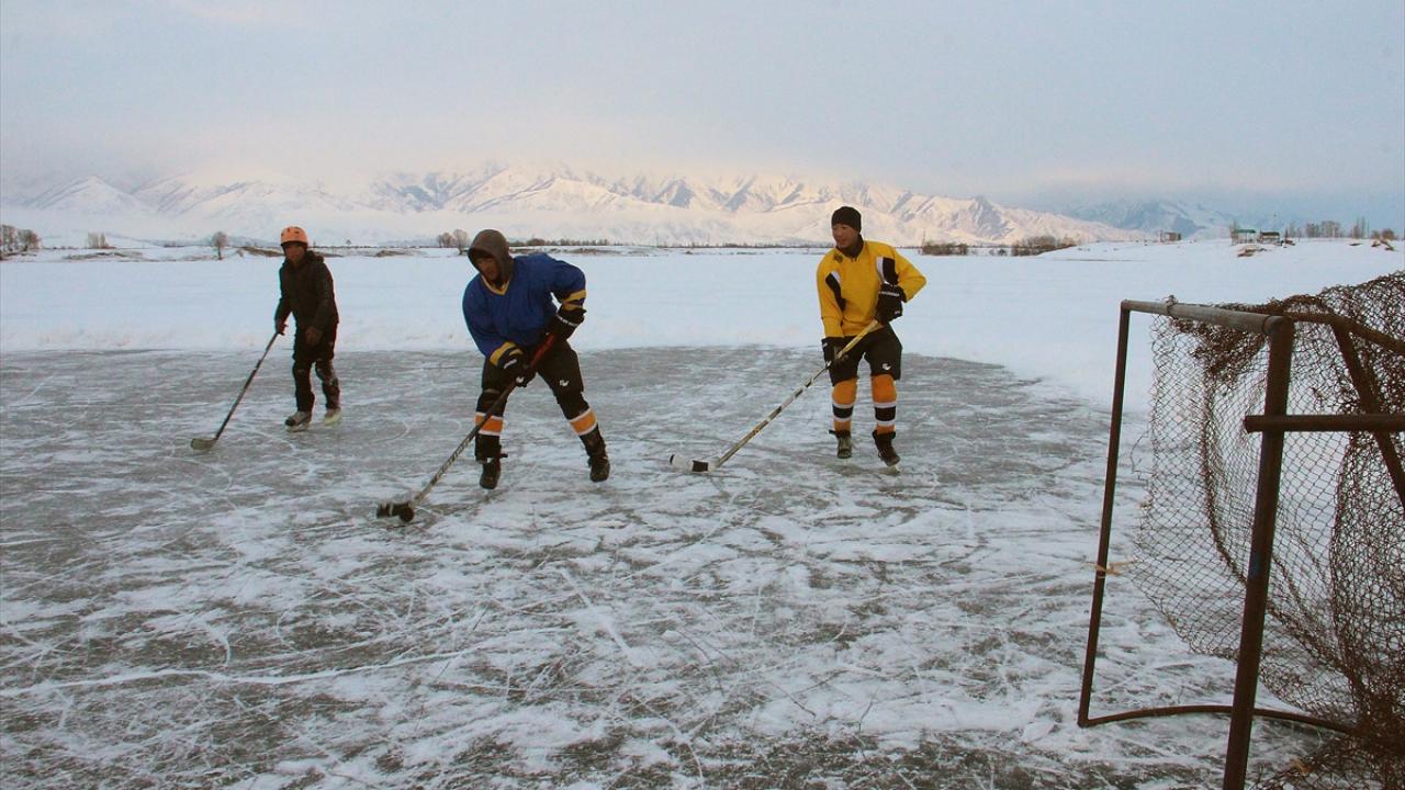 Tanrı Dağı`nın eteklerinde yer alan; uzunluğu 2,5 kilometre, genişliği 350 metre, derinliği 30 metre olan Dolon Gölü`nün tamamen donan yüzeyinin bir bölümünü saha olarak kullanan köylüler, buz hokeyine büyük ilgi gösteriyor.