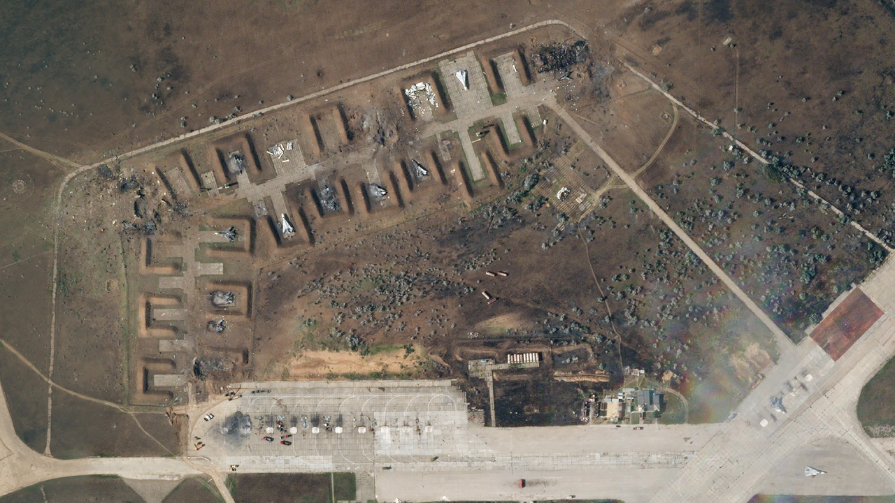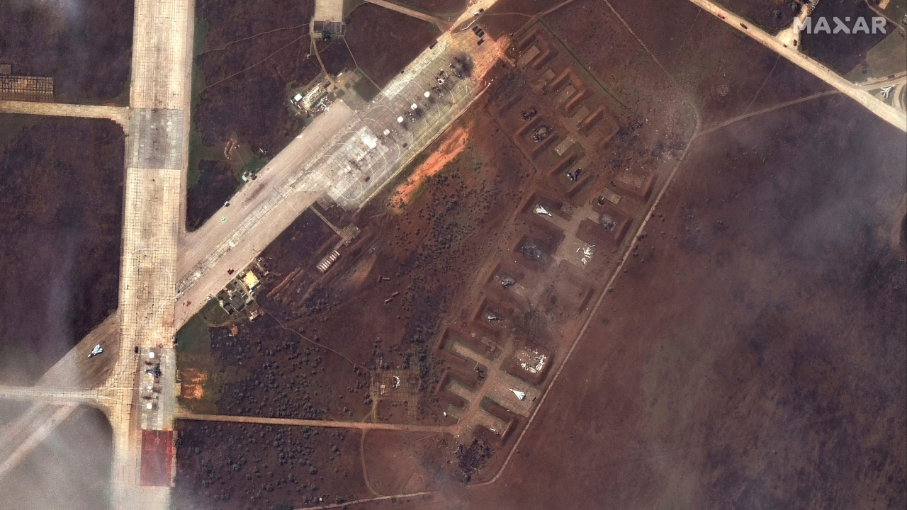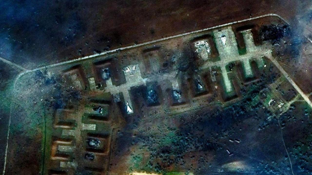 Novofedorivka yerleşim alanındaki Saki Askeri Havaalanı`nda yaşanan patlamanın ardından olaya ait uydu fotoğrafları ortaya çıktı. Çekilen fotoğraflardan üste en az 8 uçağın imha edildiği ve üste patlamaların ardından büyük bir alanın yandığı görüldü.