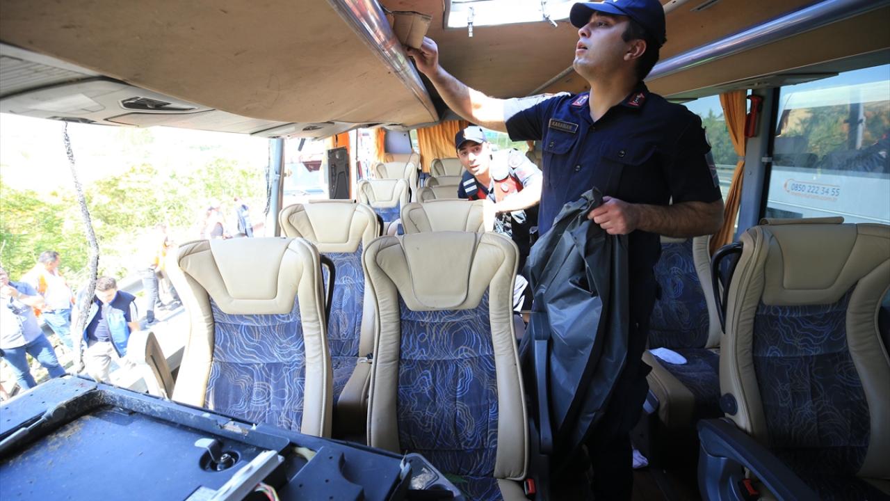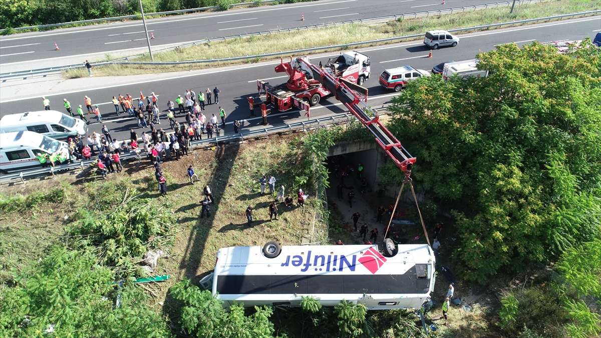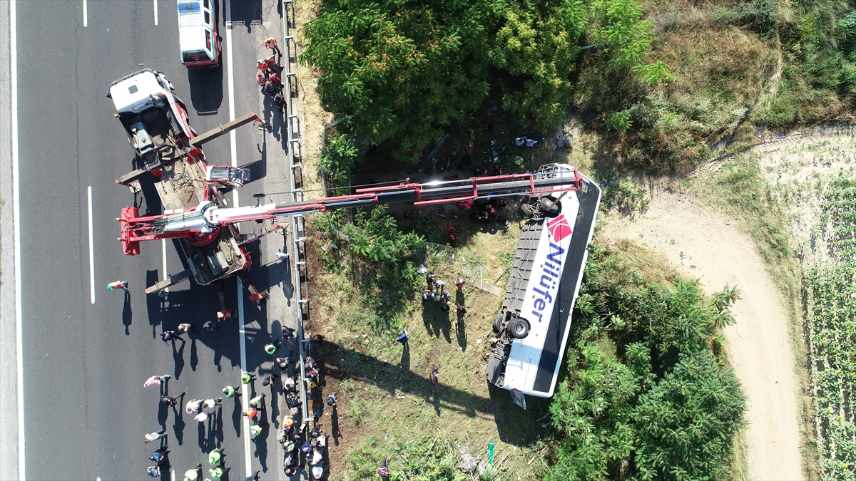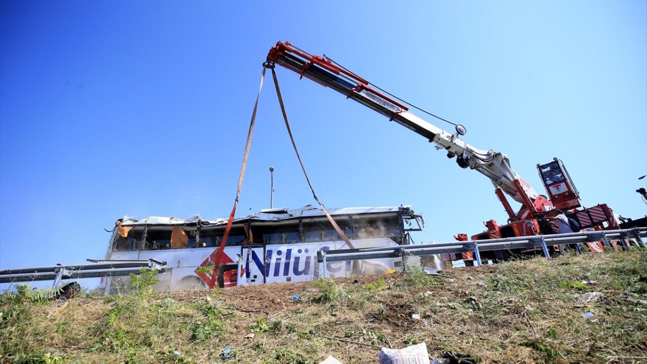 Kaza yapan otobüs vinç yardımıyla yoldan kaldırıldı.