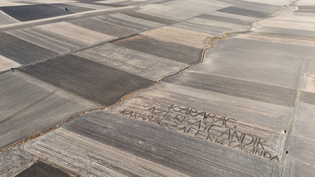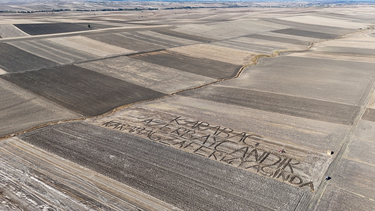 Kırklarelili çiftçi, Karabağ Zaferi'nin 4'üncü yıl dönümü dolayısıyla tarlasına pullukla iz bırakarak "Karabağ Azerbaycan'dır, Karabağ Zaferi 4 Yaşında" yazdı.