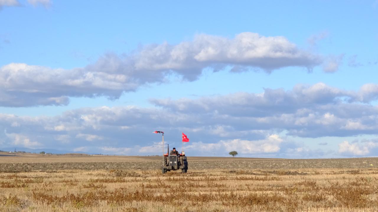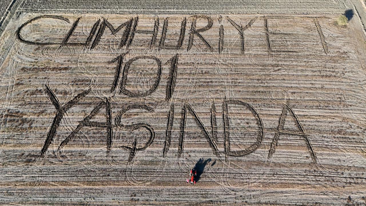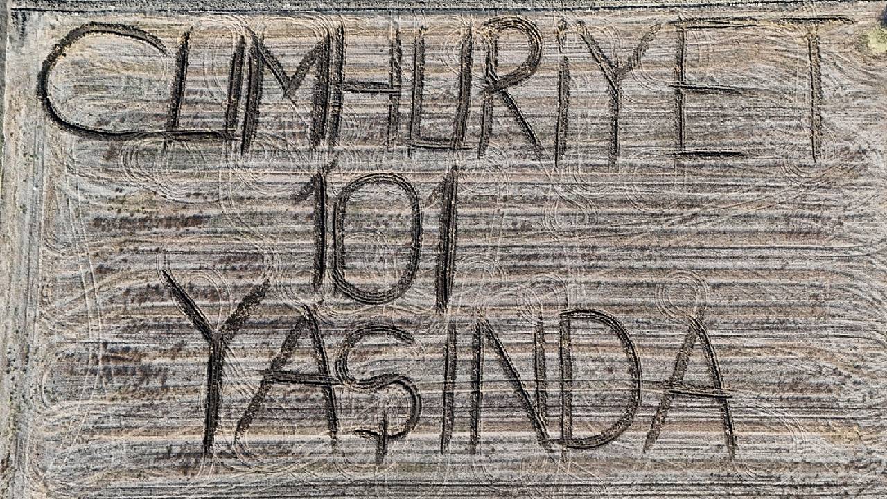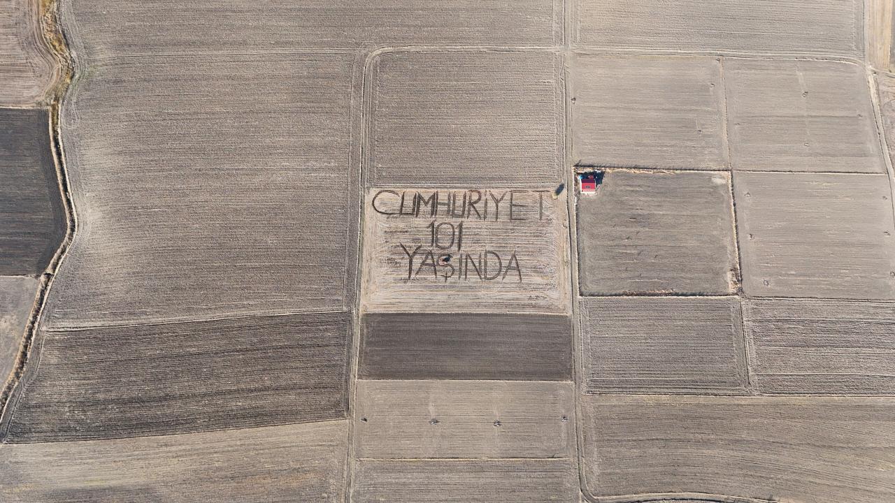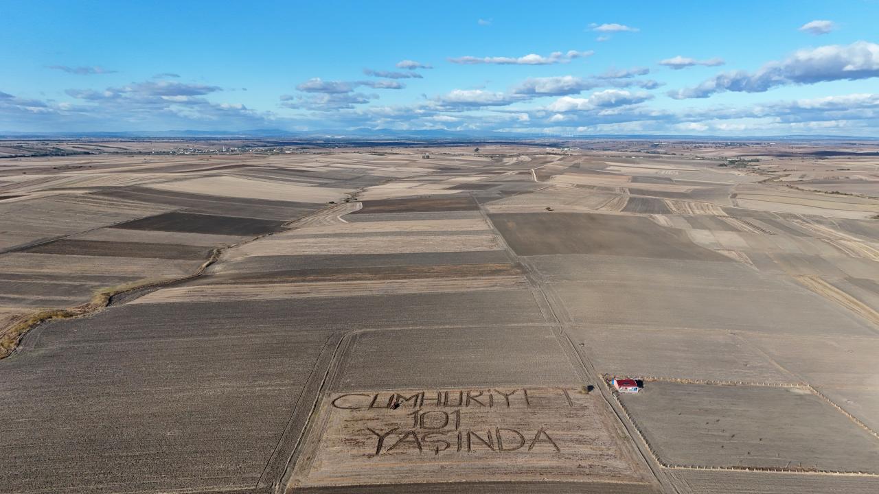 Tunçkol, tarlasına traktörün pulluğu ile toprakta iz bırakarak "Cumhuriyet 101 yaşında" yazdı.