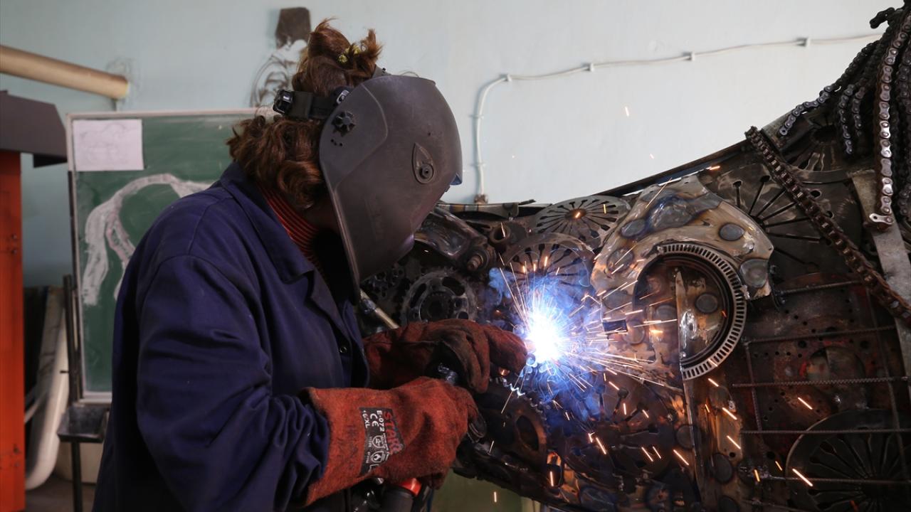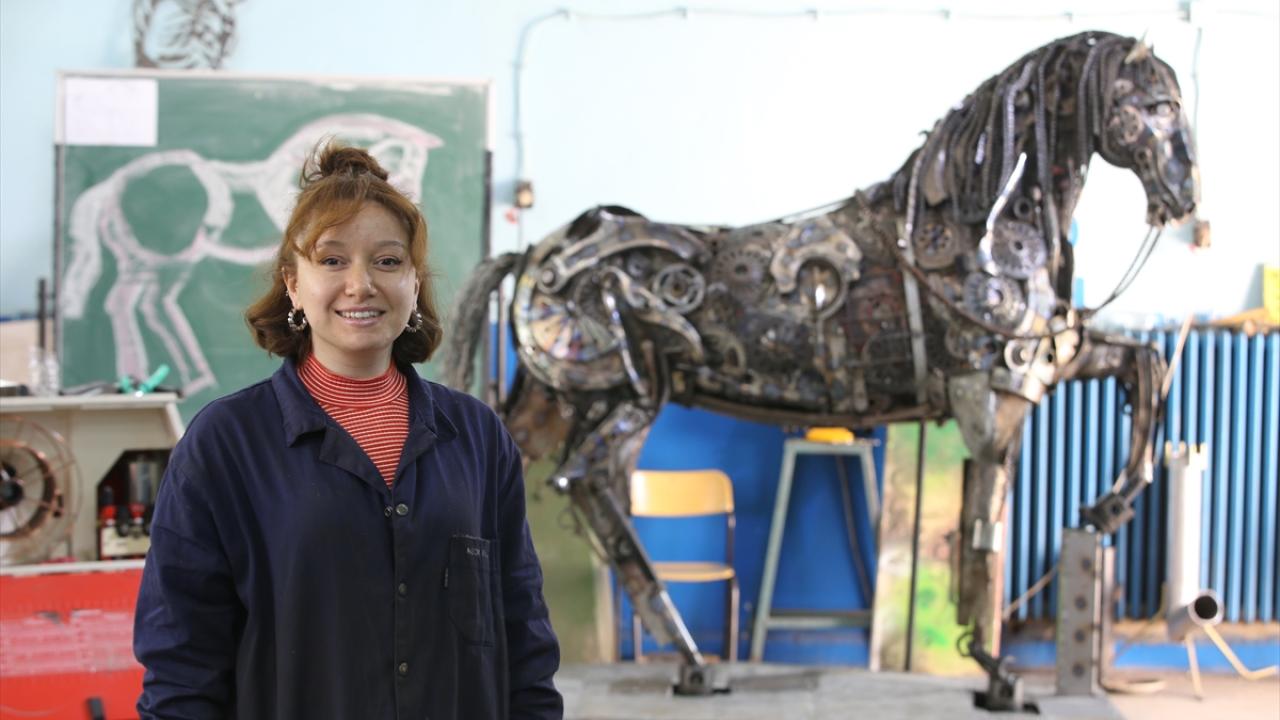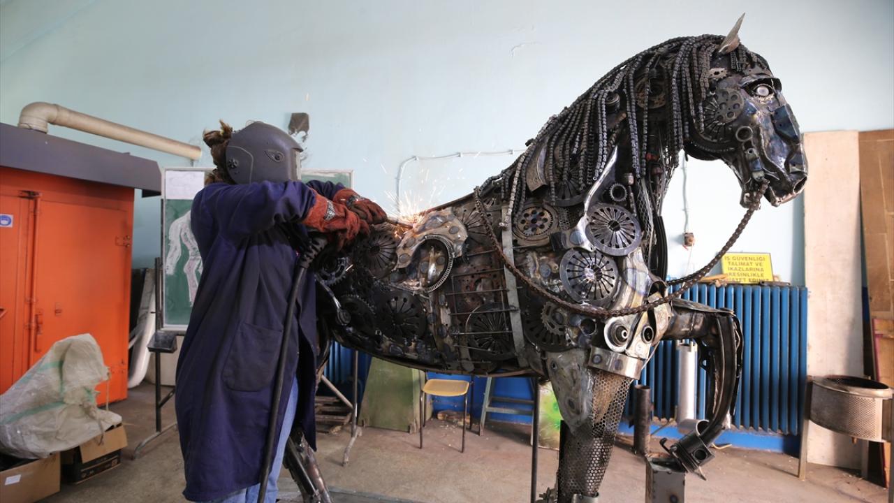 Mimar Sinan Mesleki ve Teknik Anadolu Lisesi metal atölyesinde atın iskeletini oluşturan Can, topladığı malzemeleri atın görünümüne uygun olacak şekilde kaynattı.