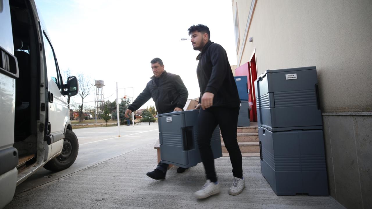 Sabaha karşı aşçıların mesaiye başlamasıyla hazırlanan yemekler, sabahın ilk ışıklarıyla termal kutulara konularak okullara dağıtılıyor.