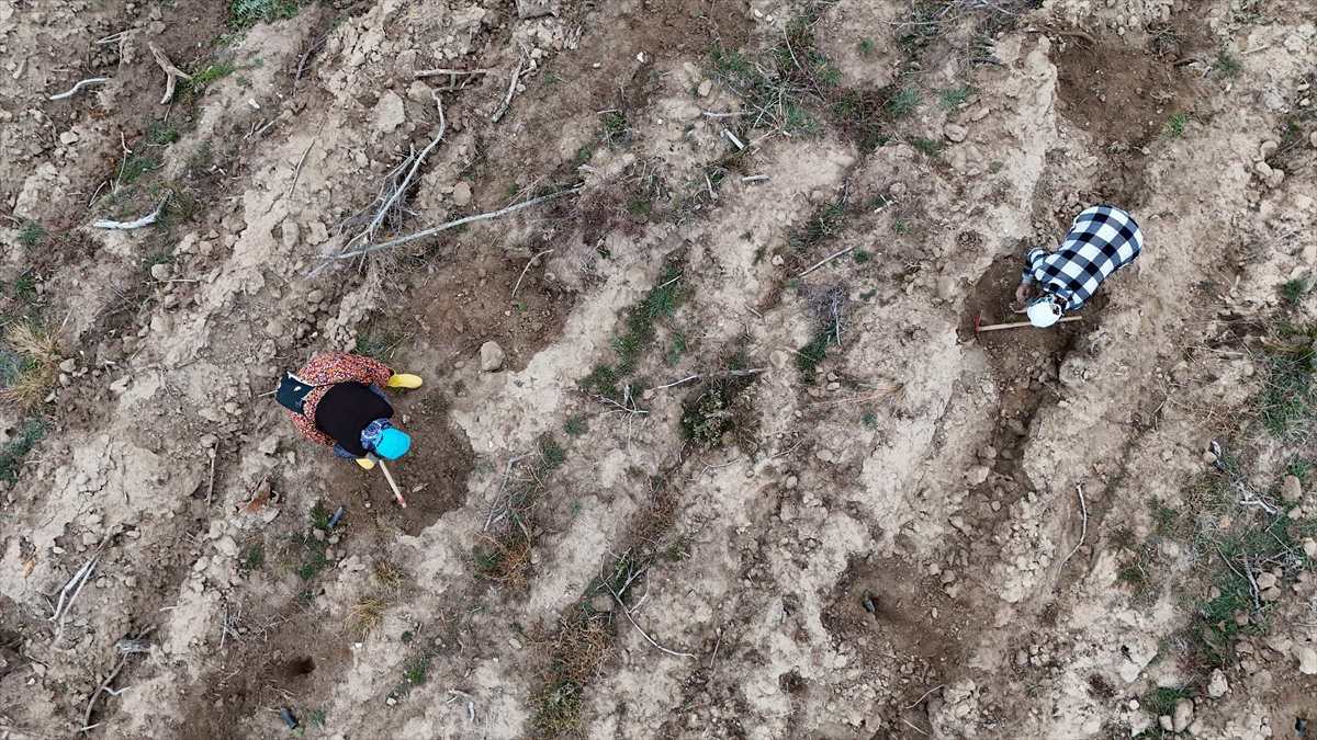 Kadınlar burada ikişerli gruplara ayrılıyor. Kadınlardan biri çapa ile fidanın dikileceği yeri hazırlarken, diğeri de Orman İşletme tarafından üretilen çam fidanlarını toprakla buluşturuyor.