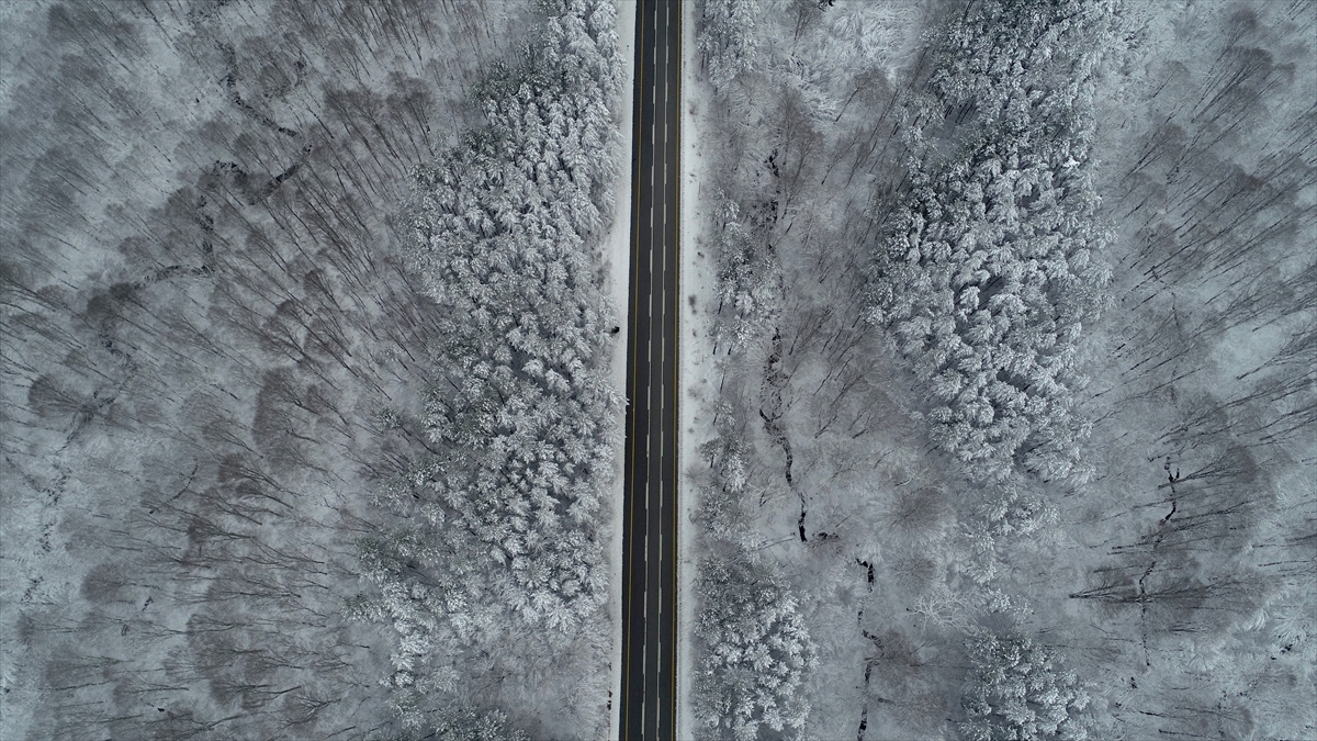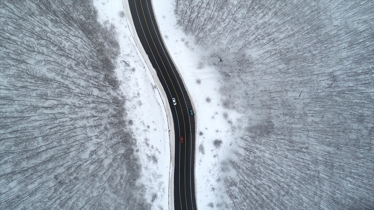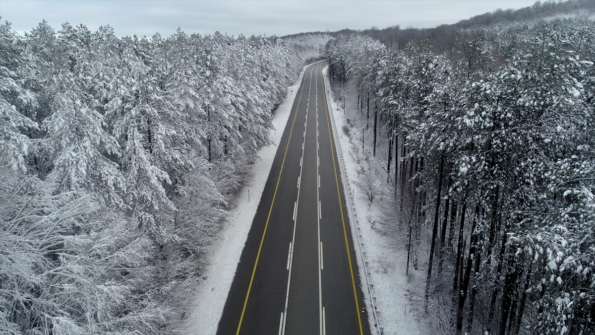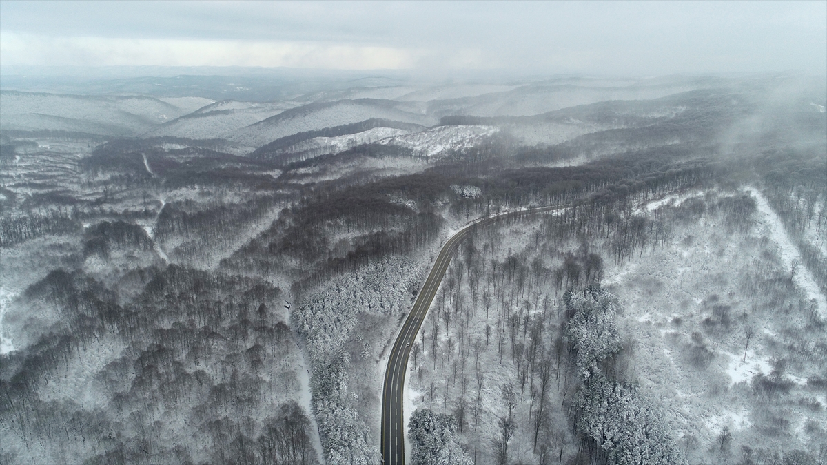 Trakya'nın Karadeniz kıyılarındaki meşe ve çam ağaçlarından oluşan Istranca Ormanları'nda kar yağışının oluşturduğu güzel manzara havadan görüntülendi.