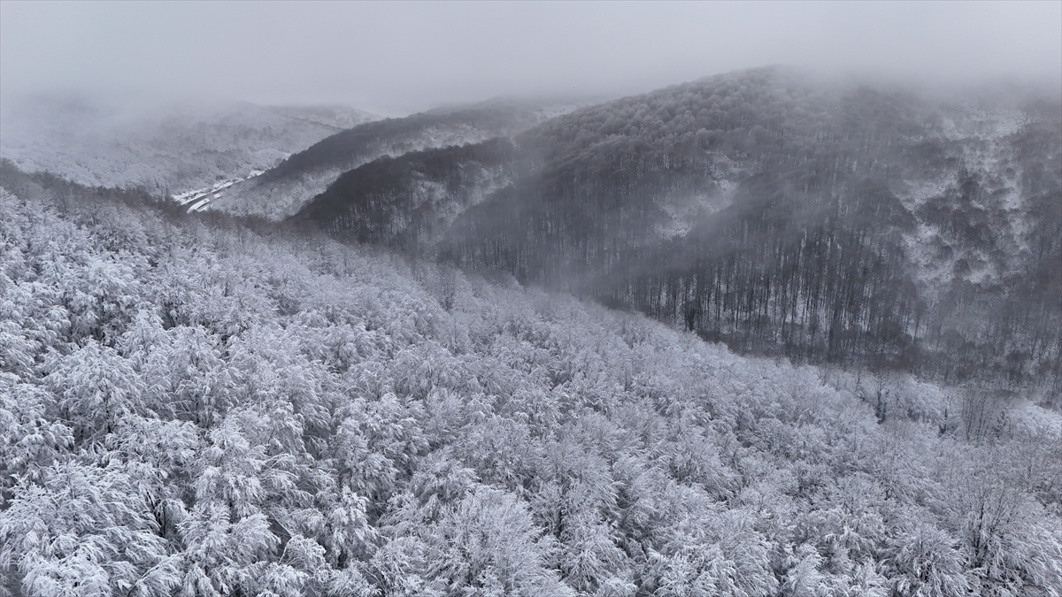 Kar örtüsü altındaki ormanlar dronla görüntülendi.