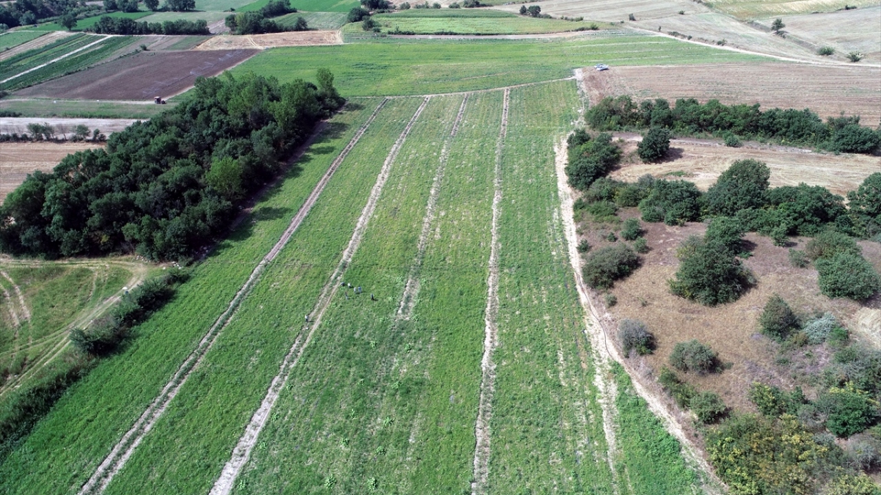 Bu yıl dönüm başına 10 ton verim beklenen köyde, sezonun ilk hasadı, AA tarafından drone ile görüntülendi.