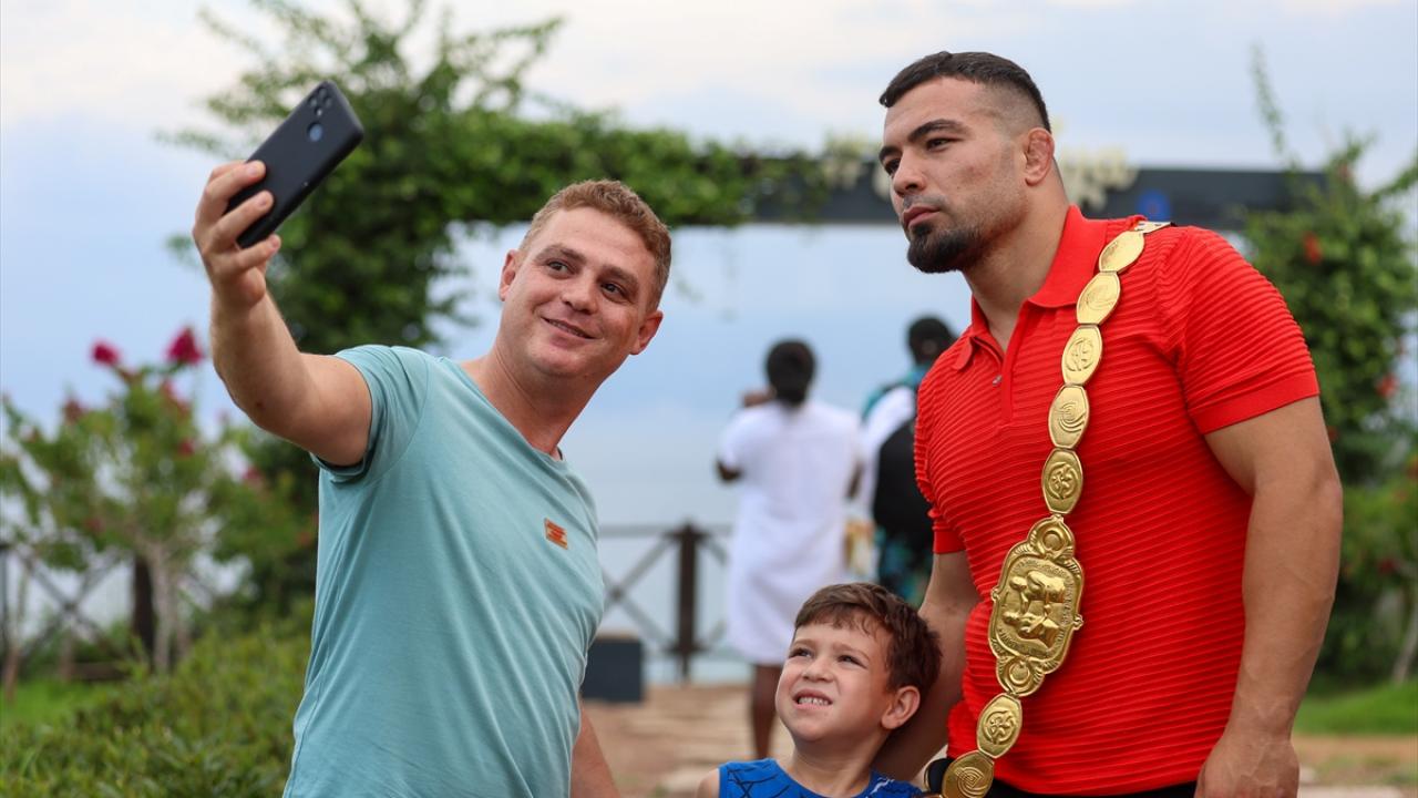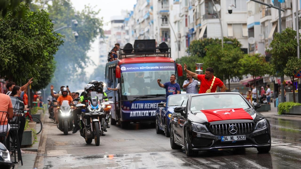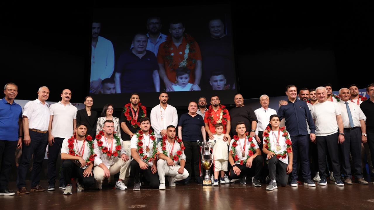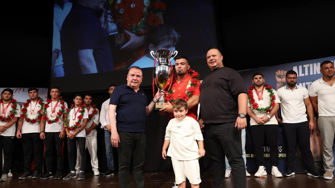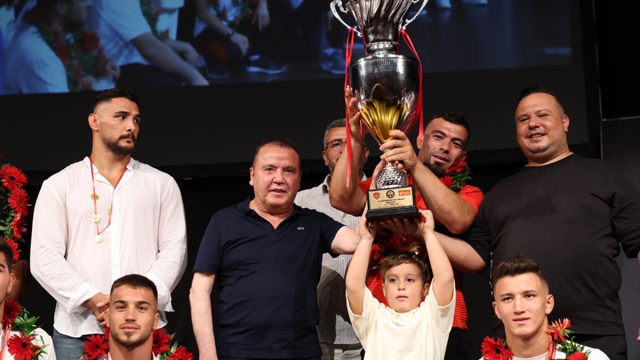 Atatürk Kültür Merkezi Aspendos Salonu`nda gerçekleştirilen törende Antalya Büyükşehir Belediye Başkanı Muhittin Böcek, başpehlivan Zeybek ve ikinci Mustafa Taş ile Kırkpınar`da derece yapan diğer pehlivanlara hediye verdi.