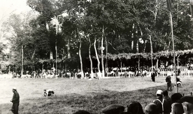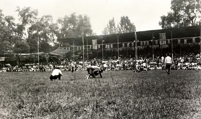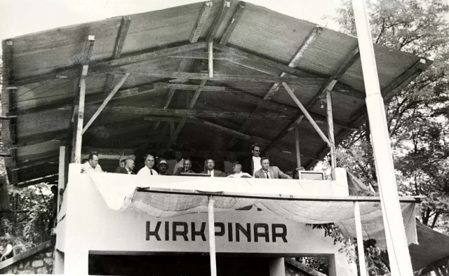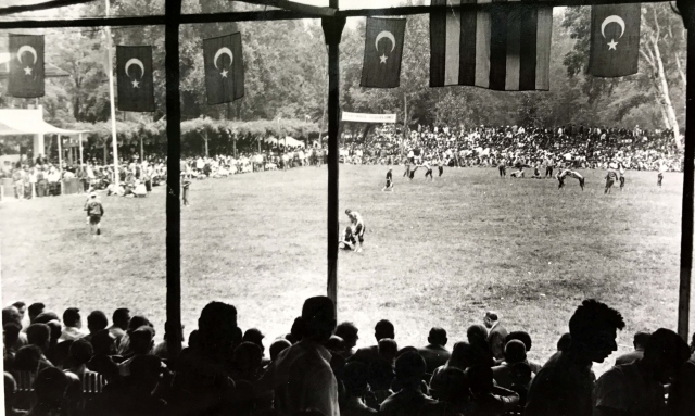 Edirne Müzesi envanterine kayıtlı Kırkpınar Yağlı Güreşleri siyah-beyaz fotoğrafları, tarihi güreşlerin geçmişine götürüyor. Fotoğrafta kule hakemleri görülüyor.