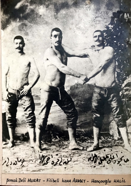 Edirne Müzesi envanterine kayıtlı Kırkpınar Yağlı Güreşleri siyah-beyaz fotoğrafları, tarihi güreşlerin geçmişine götürüyor. Fotoğrafta Pomak Deli Murat (solda), Filibeli Kara Ahmet (ortada) ve Hançooğlu Halil görülüyor.