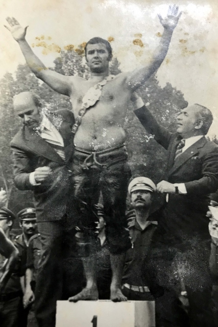 Edirne Müzesi envanterine kayıtlı Kırkpınar Yağlı Güreşleri siyah-beyaz fotoğrafları, tarihi güreşlerin geçmişine götürüyor. Fotoğrafta galip olan bir pehlivanın hakemlerce galibiyeti ve yanlarında yağcı görülüyor.