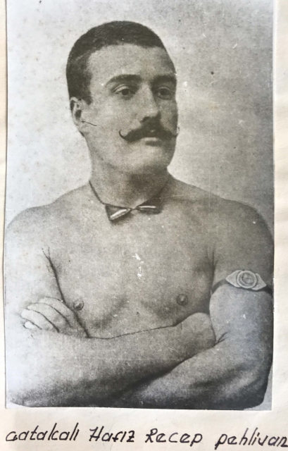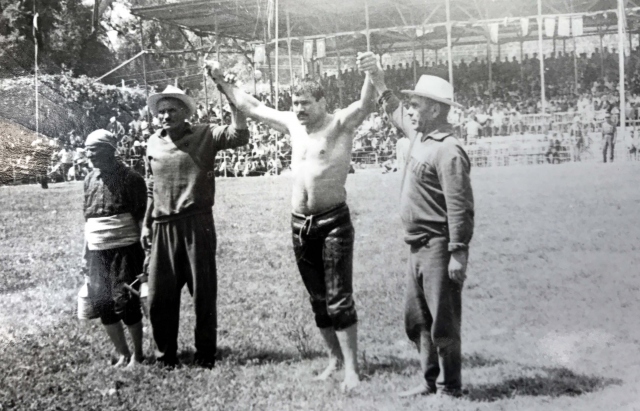 Edirne Müzesi envanterine kayıtlı Kırkpınar Yağlı Güreşleri siyah-beyaz fotoğrafları, tarihi güreşlerin geçmişine götürüyor. Fotoğrafta Çatalcalı Hafız Recep görülüyor.