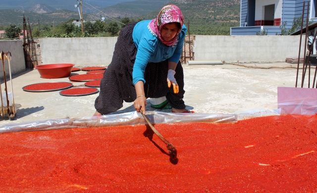 Hatay'da, yemeklerin vazgeçilmezleri arasında yer alan biber salçası, bin bir emekle hazırlanarak sofralara ulaşıyor.