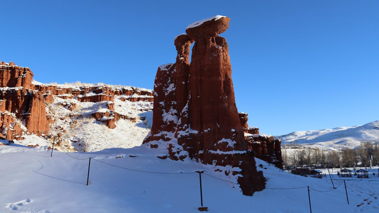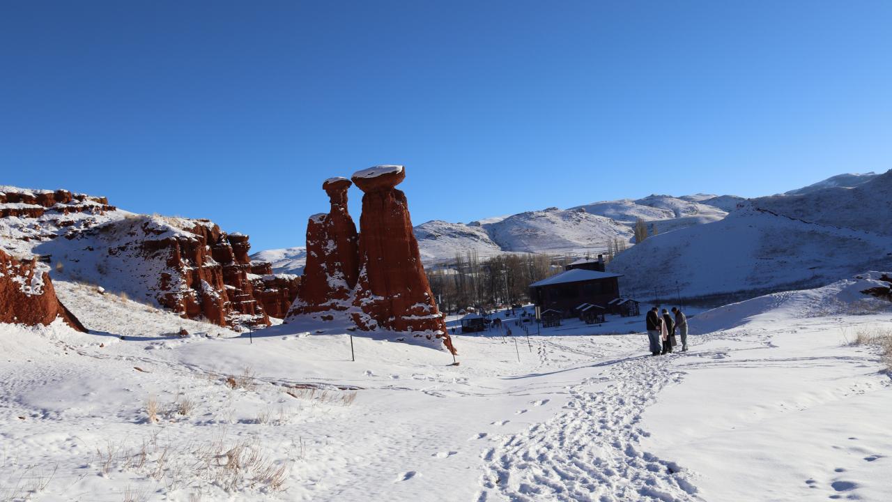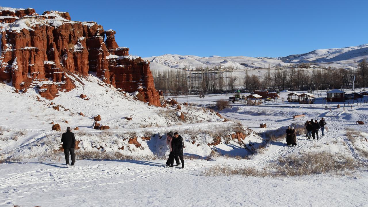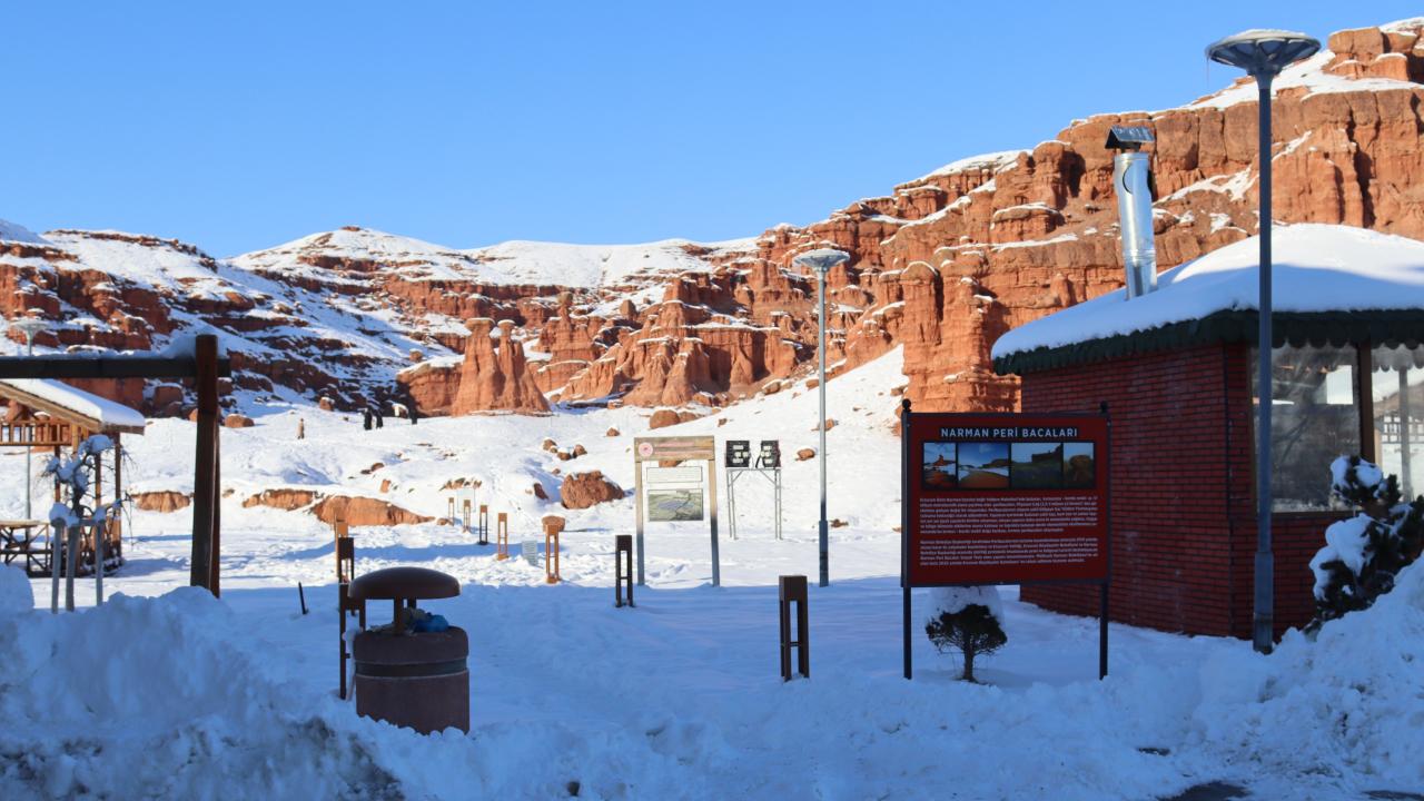 Erzurum'un Narman-Pasinler otoyolunun 7'nci kilometresinde yer alan ve halk arasında "Kırmızı periler diyarı" olarak da bilinen Narman Peri Bacaları'na mevsimin ilk karı yağdı. Peribacaları ve çevresi kar yağışı ile beyaza büründü.