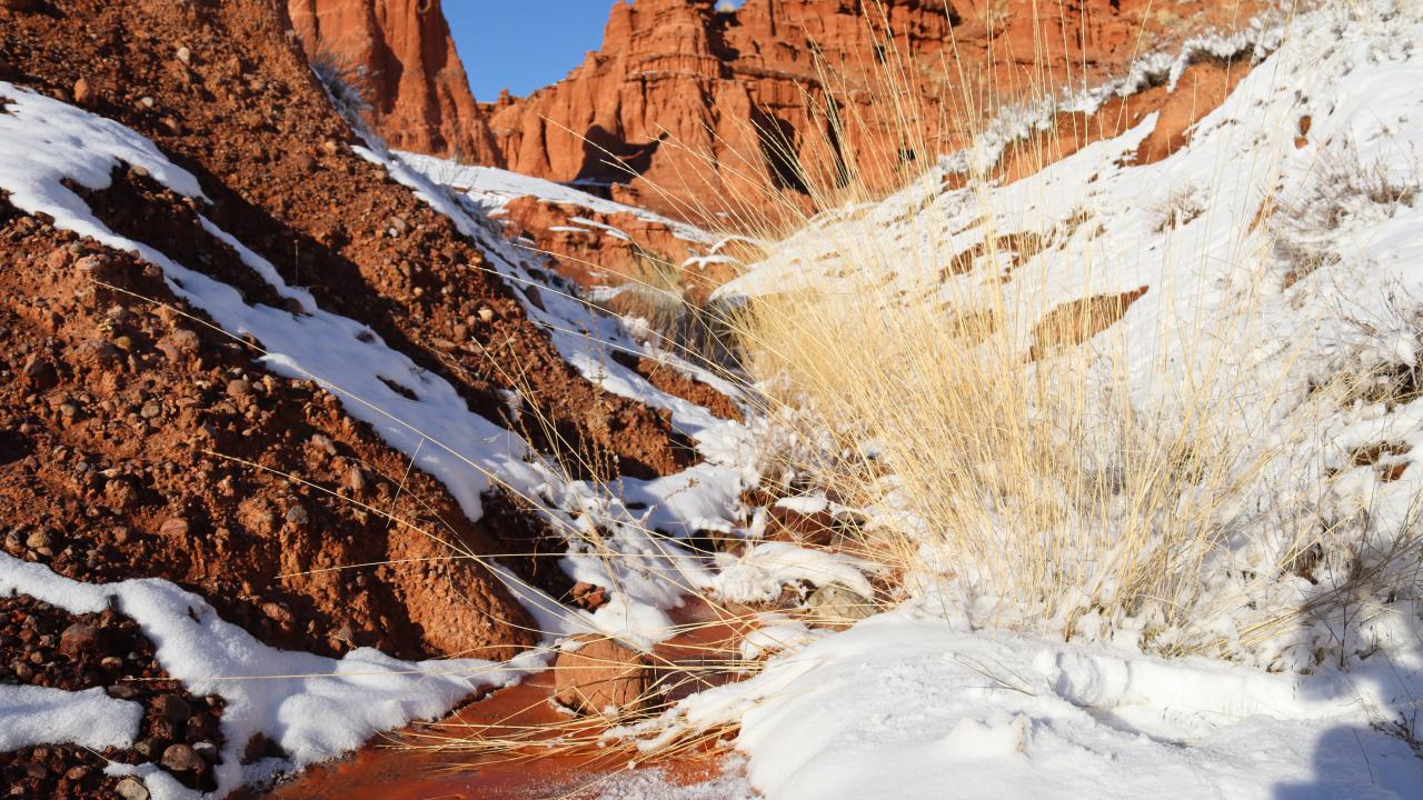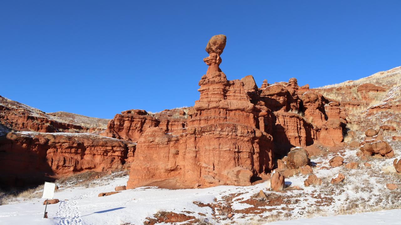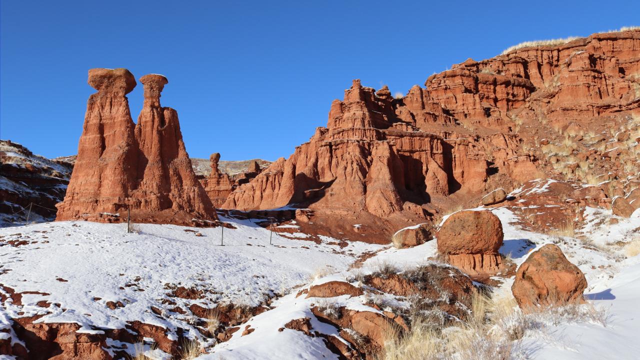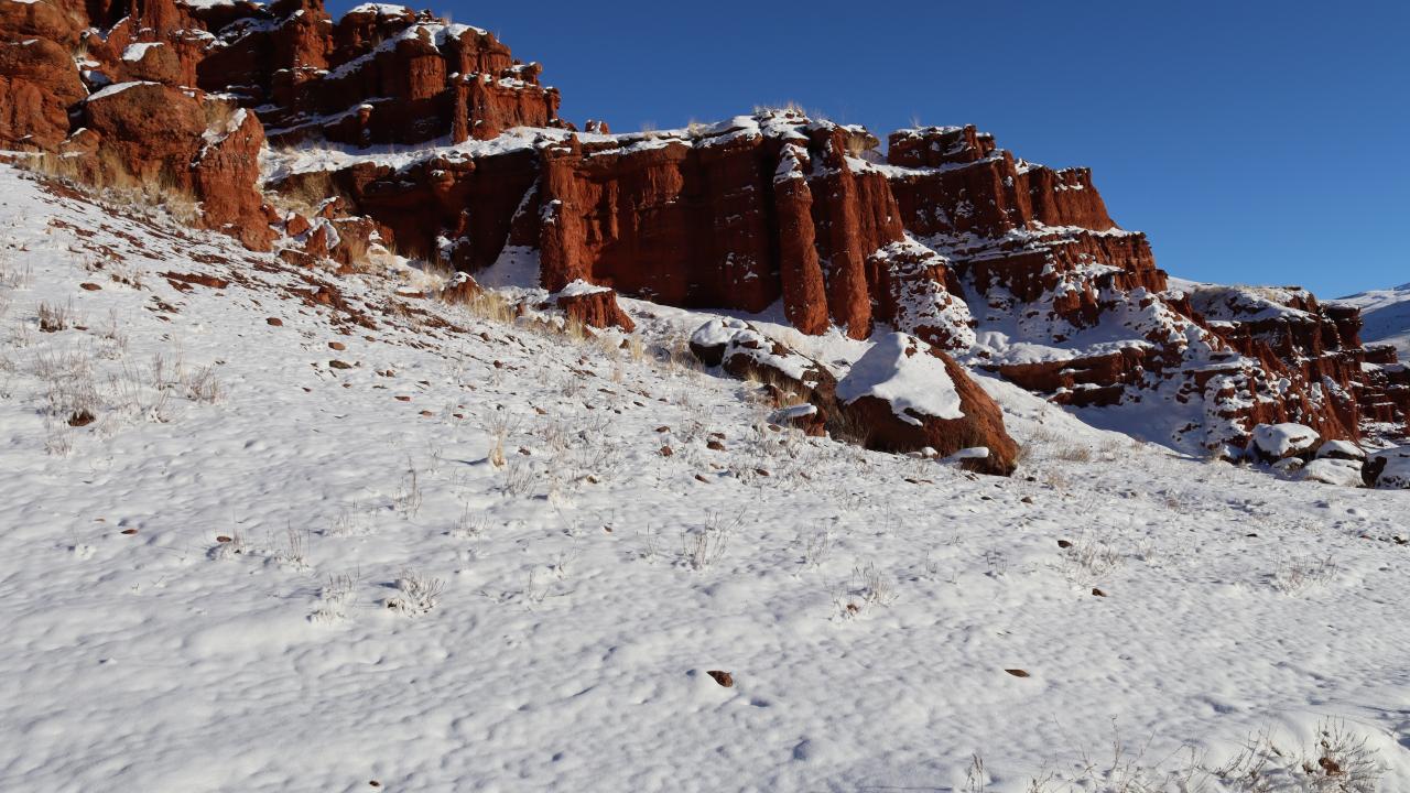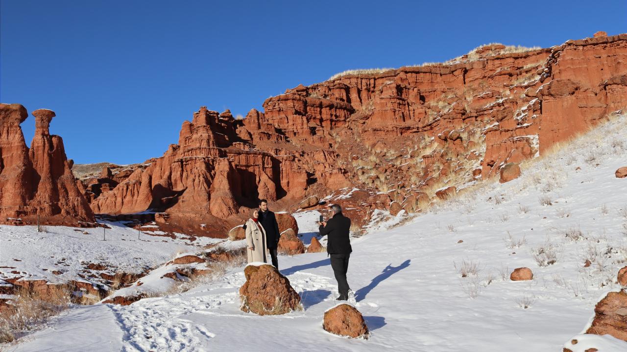 Erzurum'un Narman-Pasinler otoyolunun 7'nci kilometresinde yer alan ve halk arasında "Kırmızı periler diyarı" olarak da bilinen Narman Peri Bacaları'na mevsimin ilk karı yağdı. Peribacaları ve çevresi kar yağışı ile beyaza büründü.