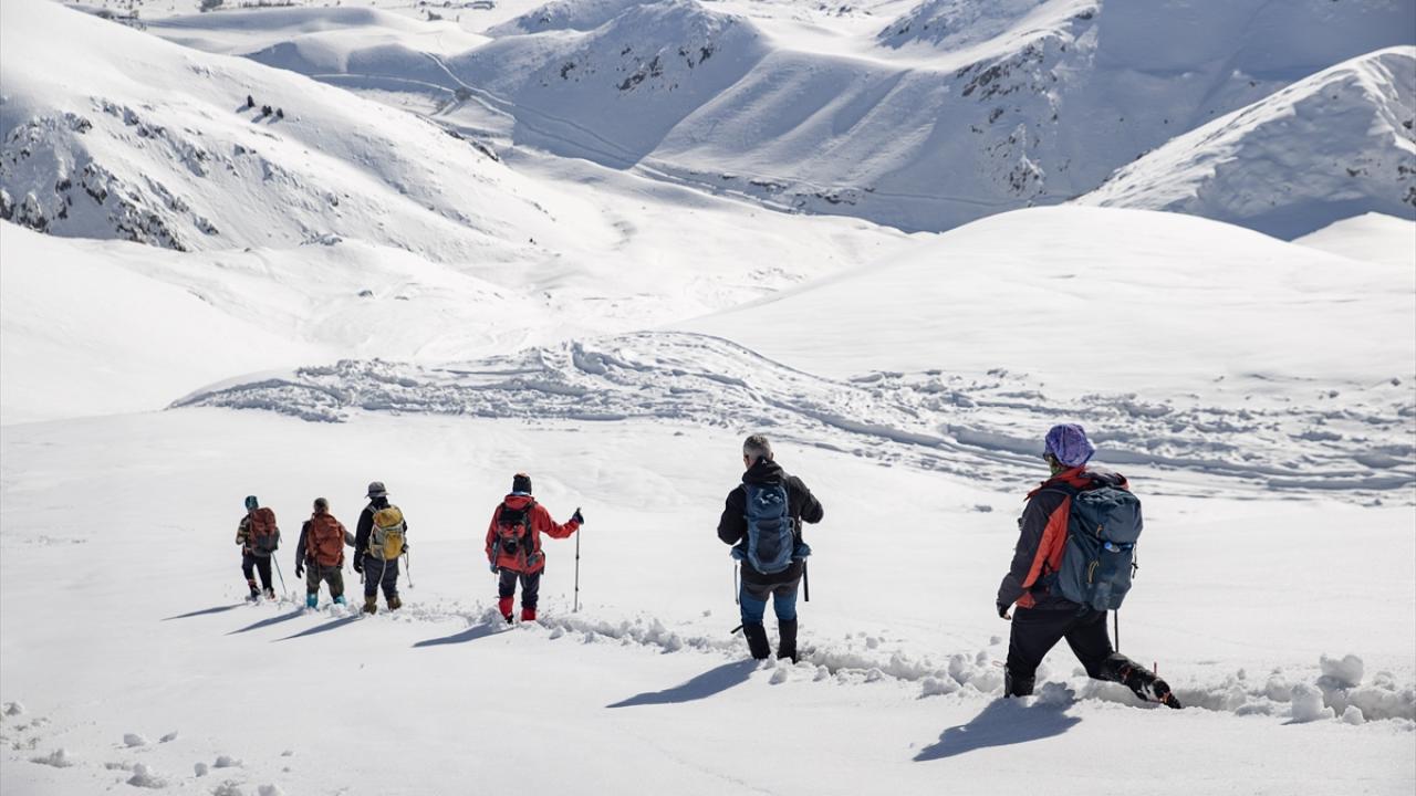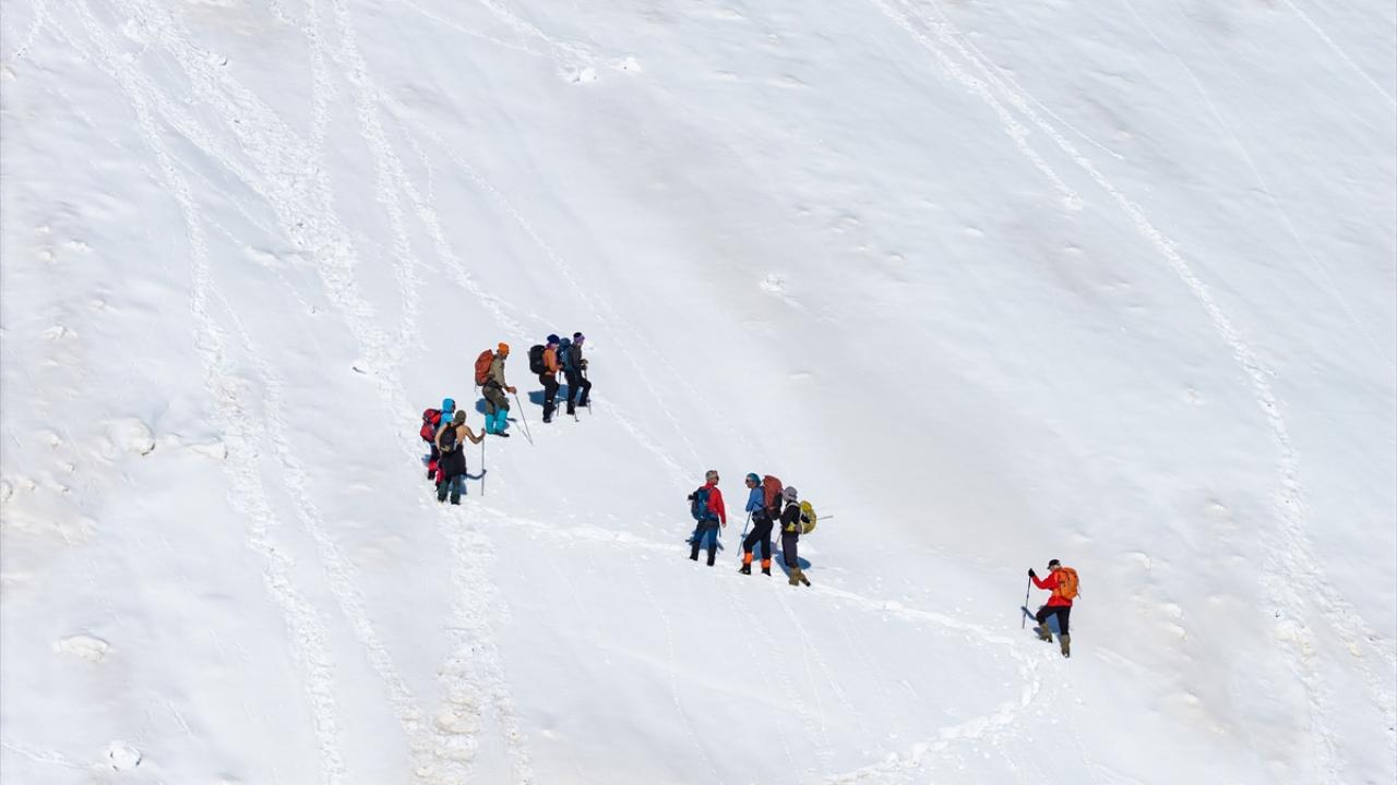 Kar kalınlığının 3 metreyi aştığı parkurlarda ilerleyen dağcılar, saatler süren yolculuklarının sonunda zirveye ulaşmayı başardı. Eşsiz manzaralarla karşılaşan dağcılar, çevreyi kuşbakışı izleyerek fotoğraf çekti.