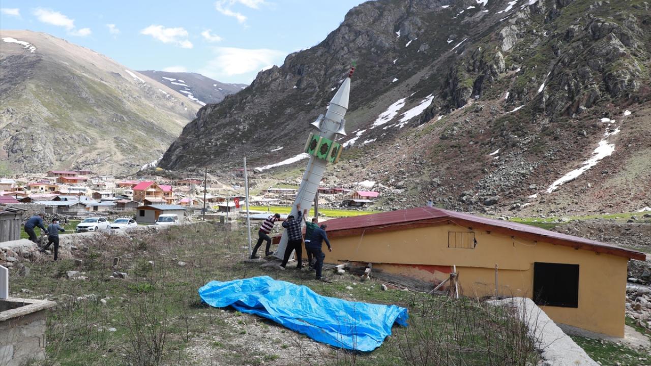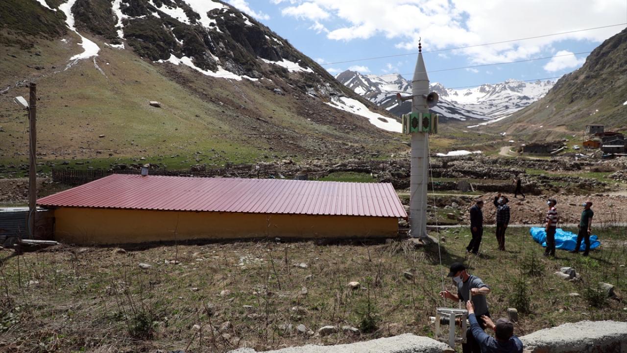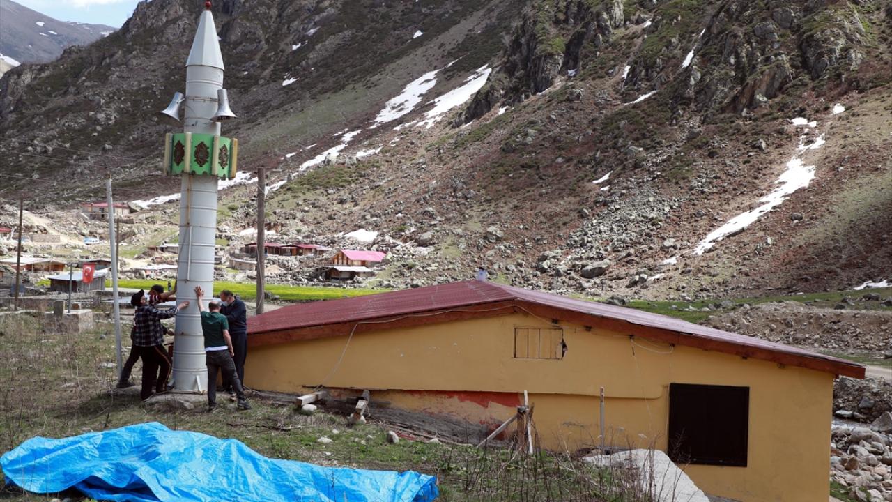Rize'nin İkizdere ilçesine bağlı 2 bin 124 metre rakımlı Garzavan Yaylası'nda, çelik varillerin birleştirilmesiyle oluşturulan 7 metrelik minareyi kışın çığdan zarar görmemesi için 'yatıran' yöre sakinleri, havaların düzelmesiyle yeniden kaldırdı.