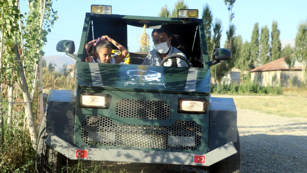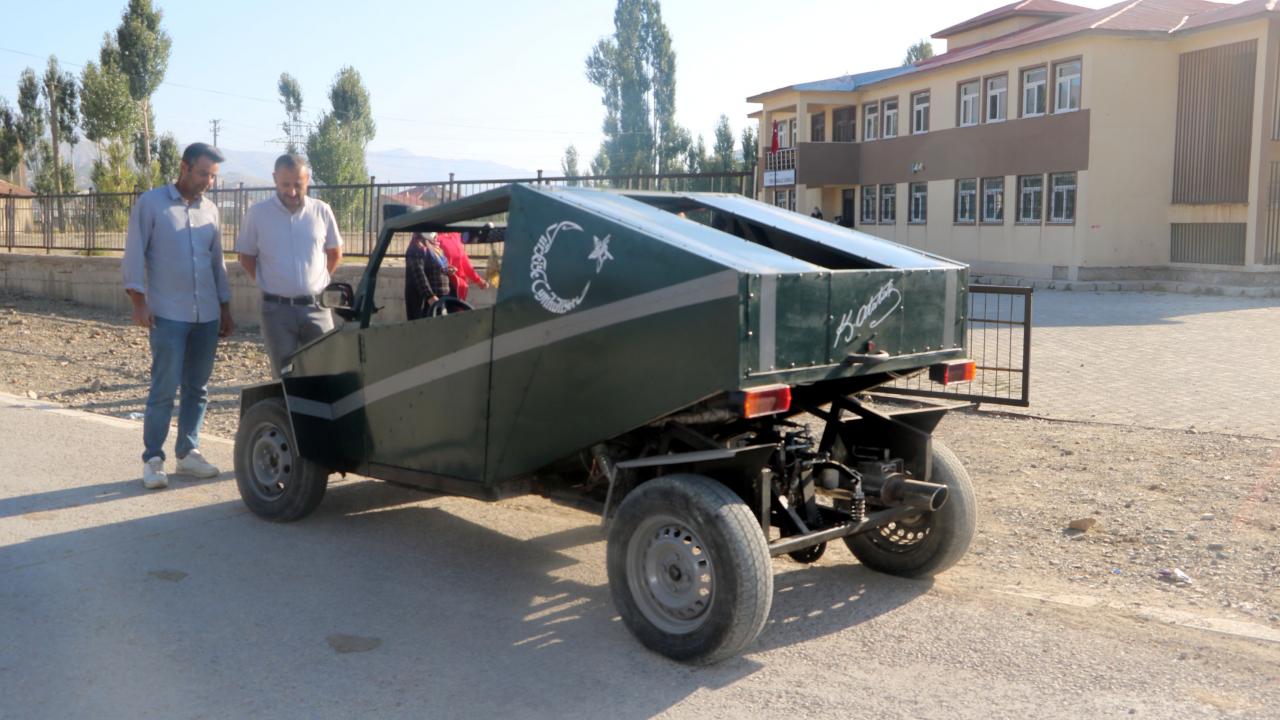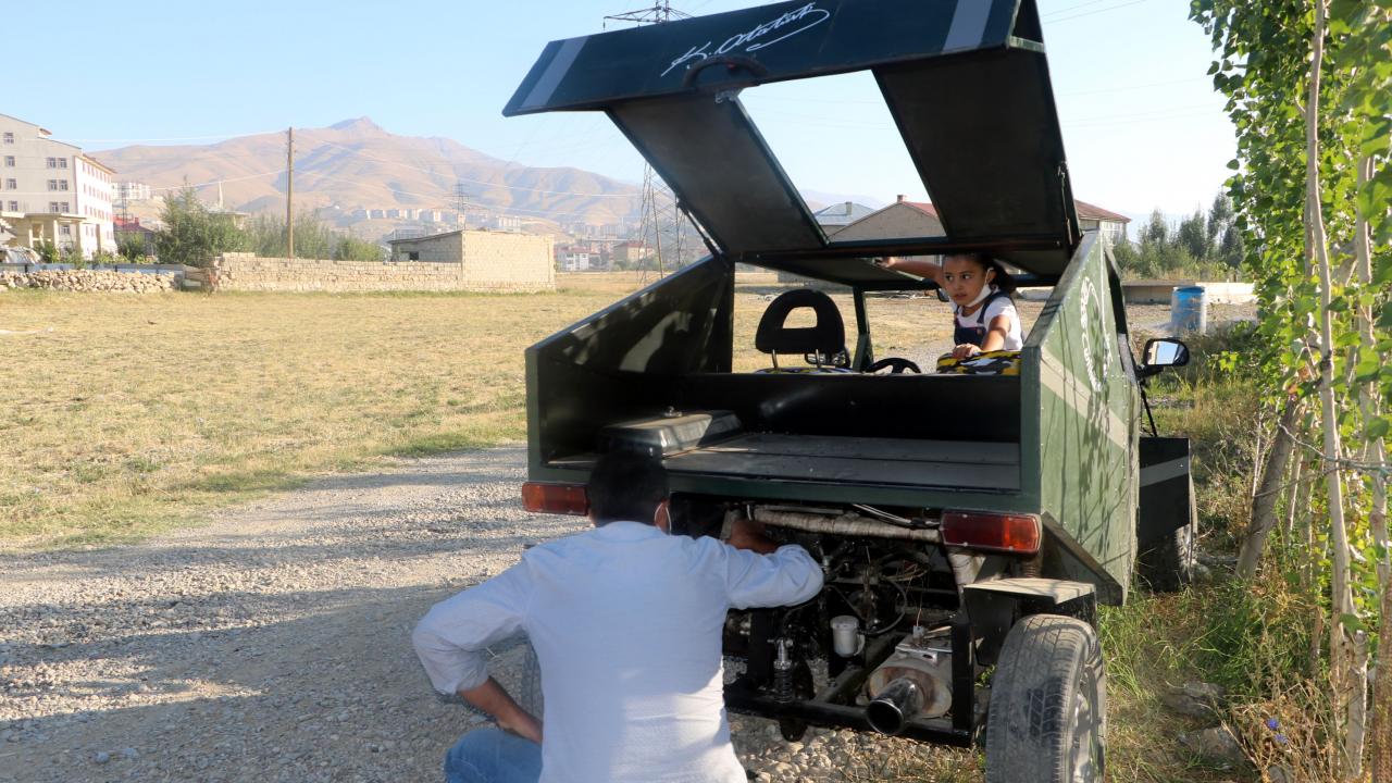 Hakkari`nin Yüksekova ilçesinde geçen yıl evinin bahçesine kızının görmeyi çok istediği Anıtkabir ve Aslanlı Yol`un kardan maketini yapan inşaat ustası Mehmet Şerif Karahan, şimdi de hurda malzemelerden yararlanarak benzinle çalışan araç yaptı.
