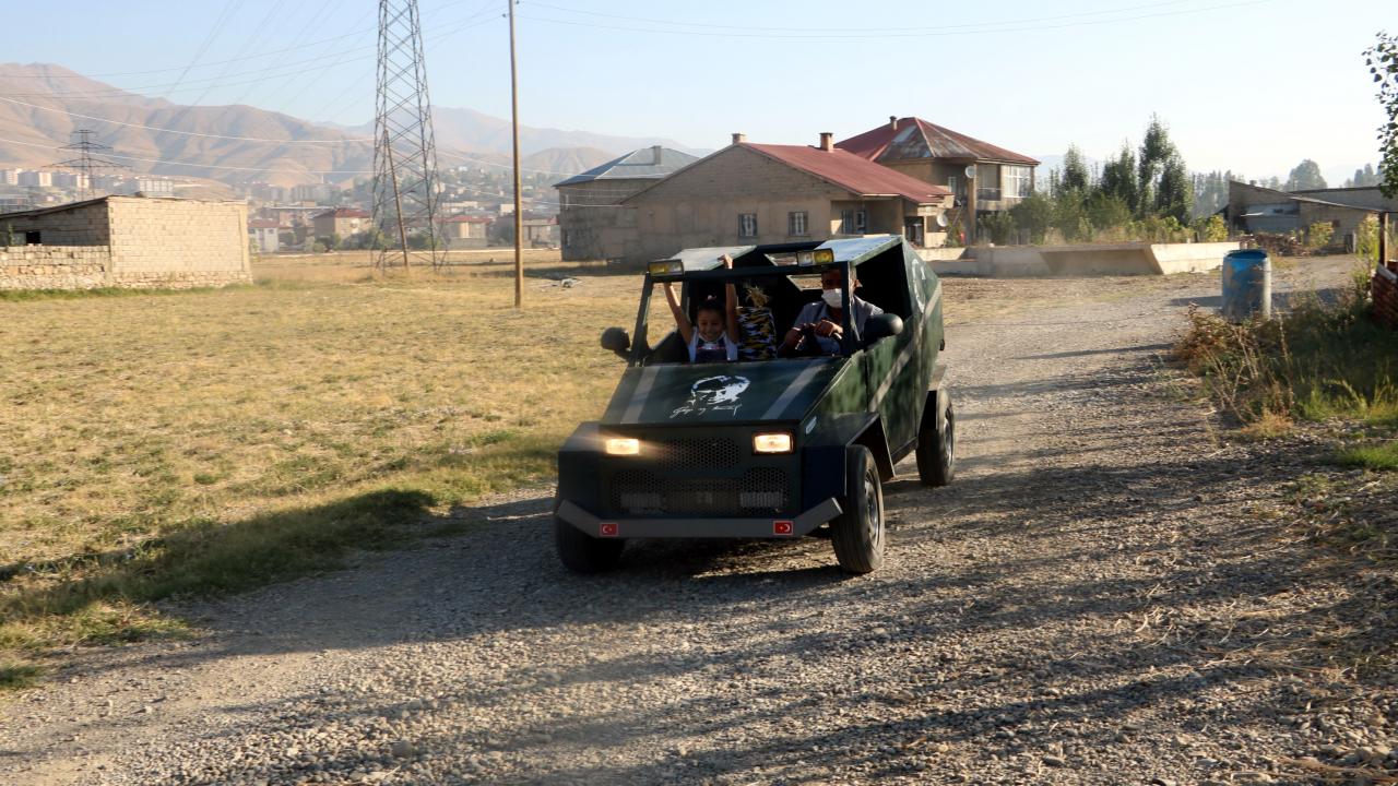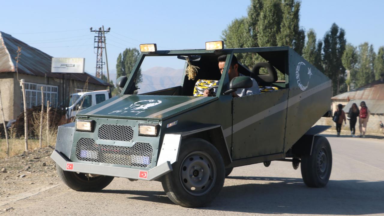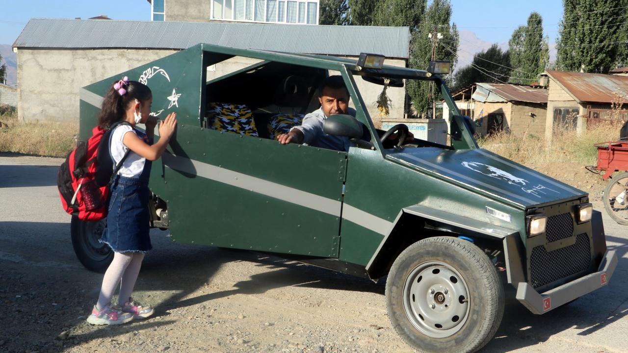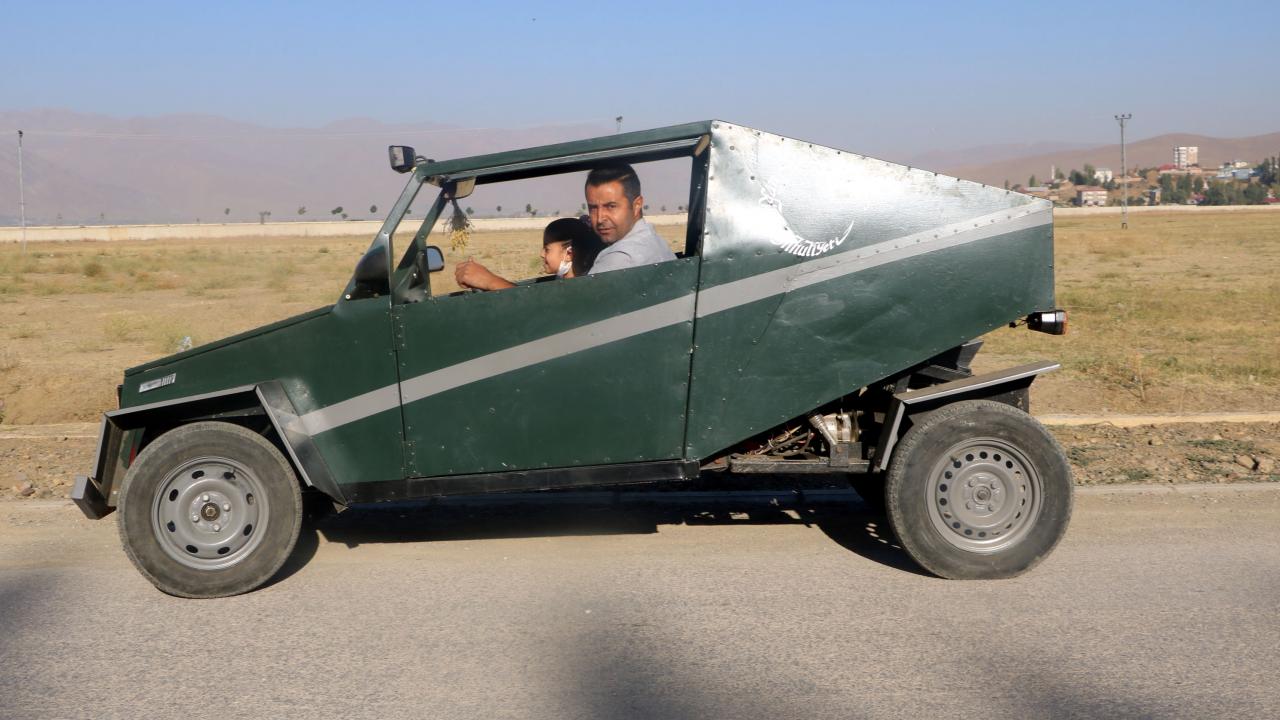 Hakkari`nin Yüksekova ilçesinde geçen yıl evinin bahçesine kızının görmeyi çok istediği Anıtkabir ve Aslanlı Yol`un kardan maketini yapan inşaat ustası Mehmet Şerif Karahan, şimdi de hurda malzemelerden yararlanarak benzinle çalışan araç yaptı.