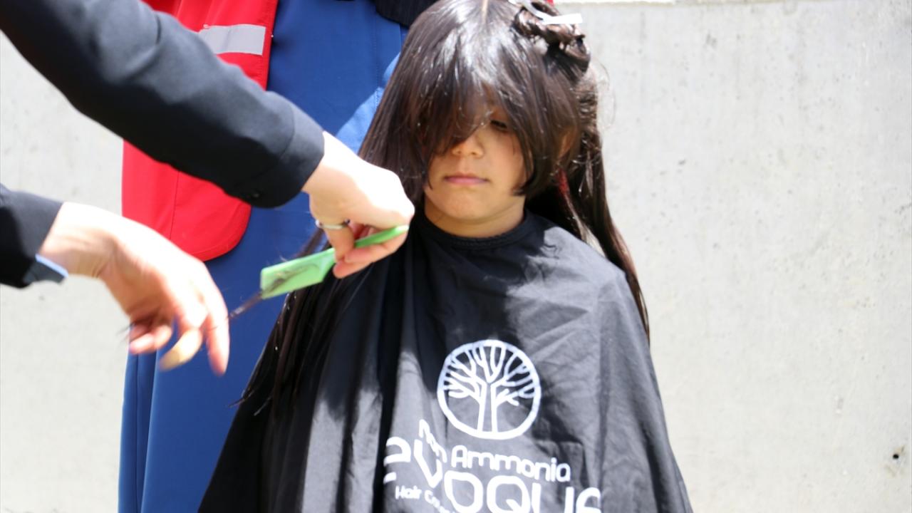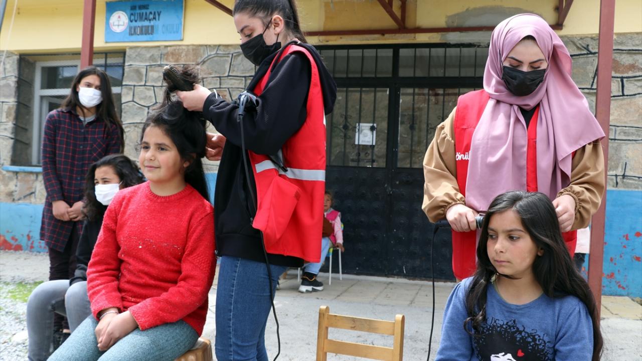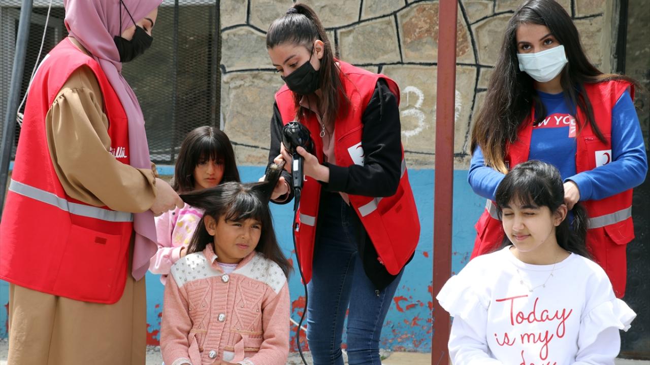 Ağrı'da Kızılay gönüllüleri, kadın kuaförlerle ziyaret ettikleri köylerdeki kız çocuklarının bayramlık saç bakımını yaparak onlara kıyafet hediye etti.