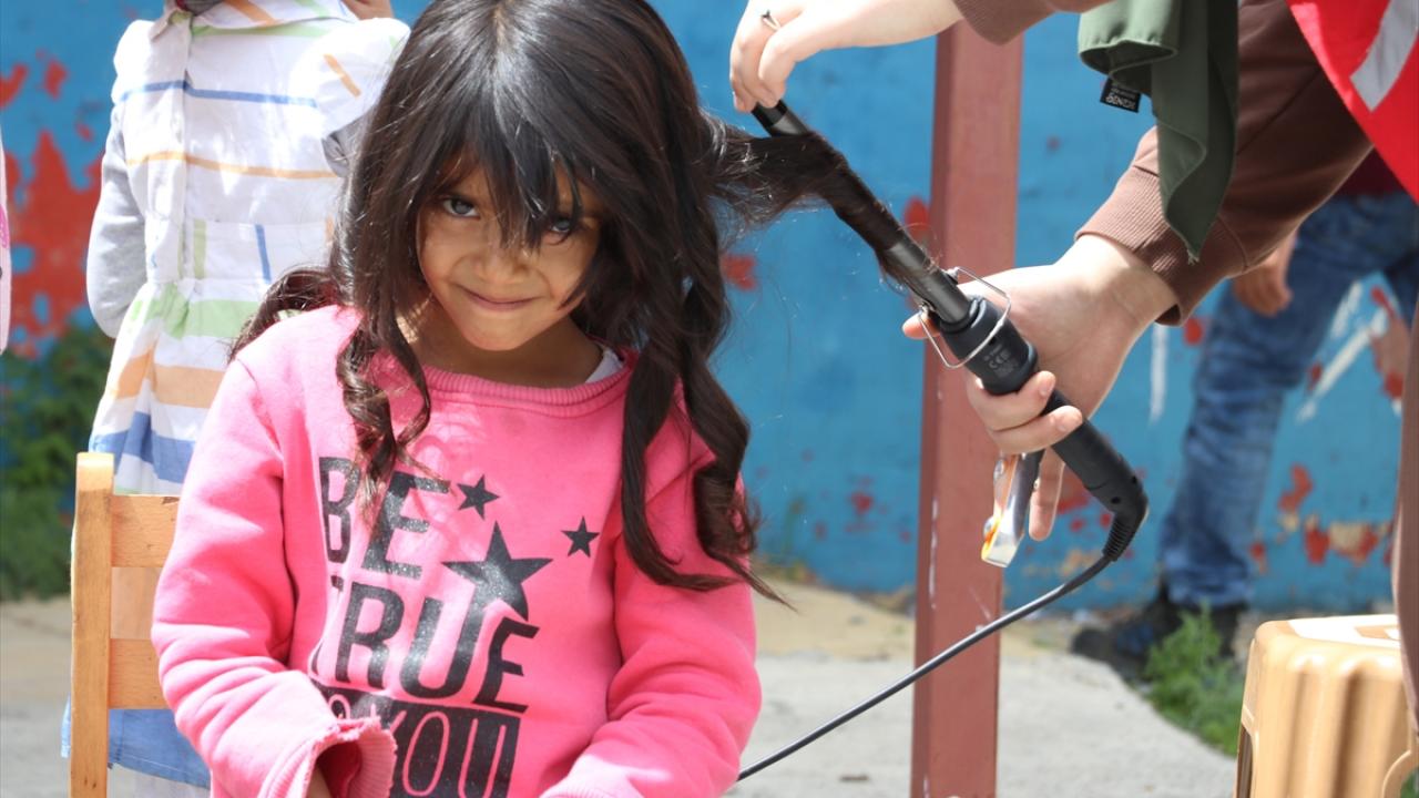 Çeşitli oyunlar oynayarak eğlendirdikleri çocukların bayramlık saç bakımını da yapan gönüllüler, hediyelerle sevindirdikleri miniklerden ihtiyacı olanlara da kıyafet hediye etti.