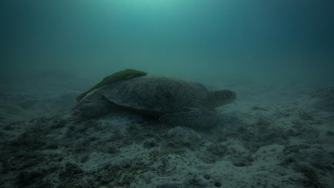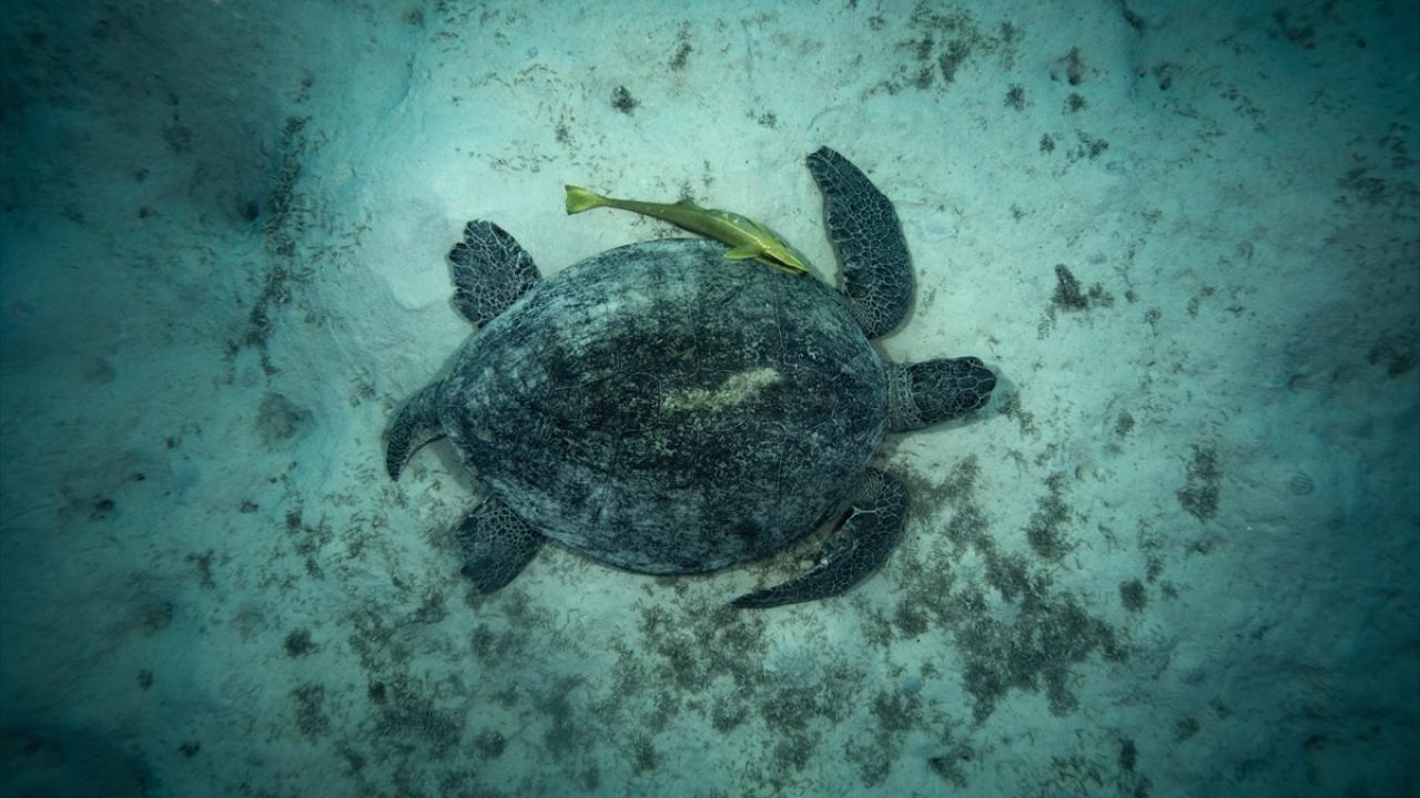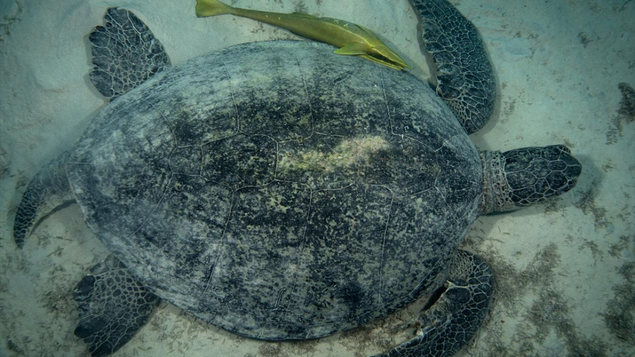 Nesli tehdit altındaki şahin gagalı deniz kaplumbağası resif çevresinde beslenirken, yeşil deniz kaplumbağasının yanında ise remora balığının yüzdüğü görüldü.