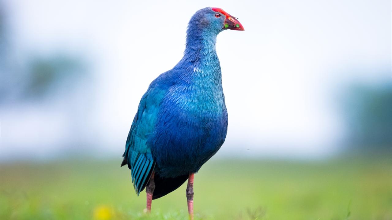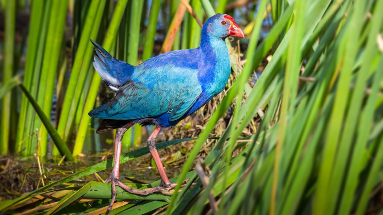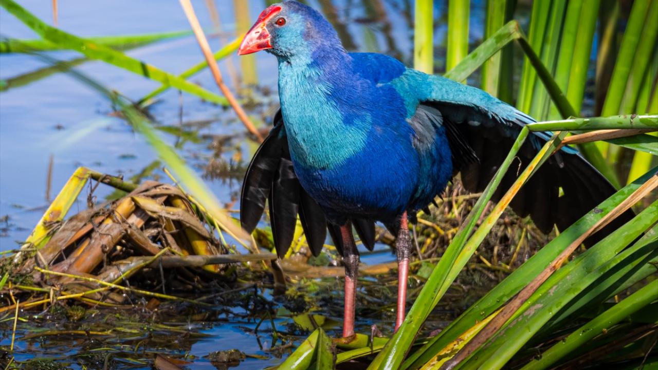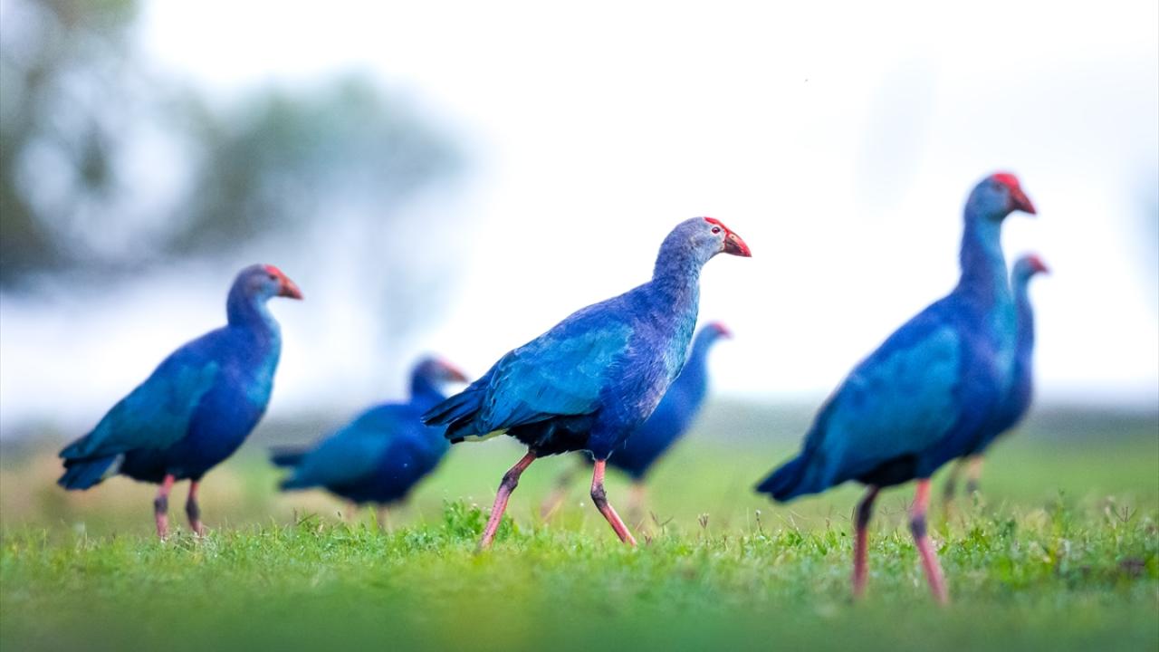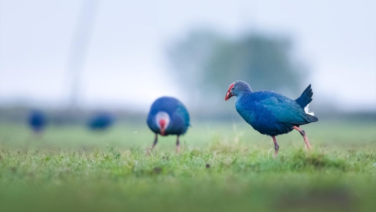 Delta içerisinde yer alan ve mavi tonlarındaki renkleri ile dikkat çeken saz horozları, günün ilk saatlerinde sazlıklardan çıkarak çayırlarda yemleniyor.