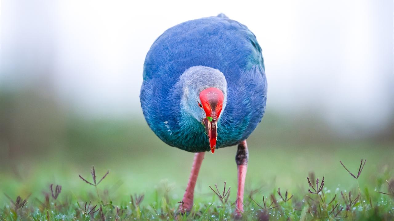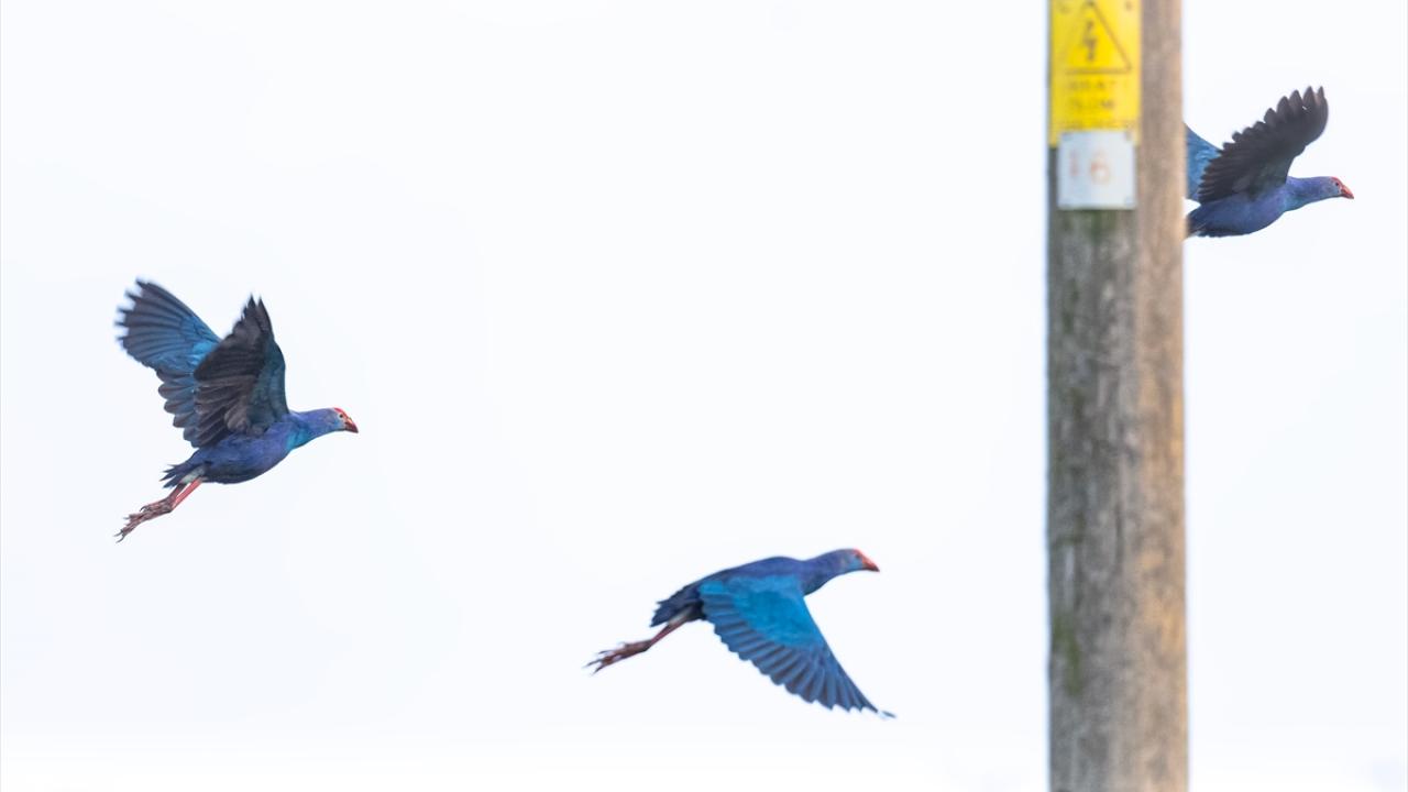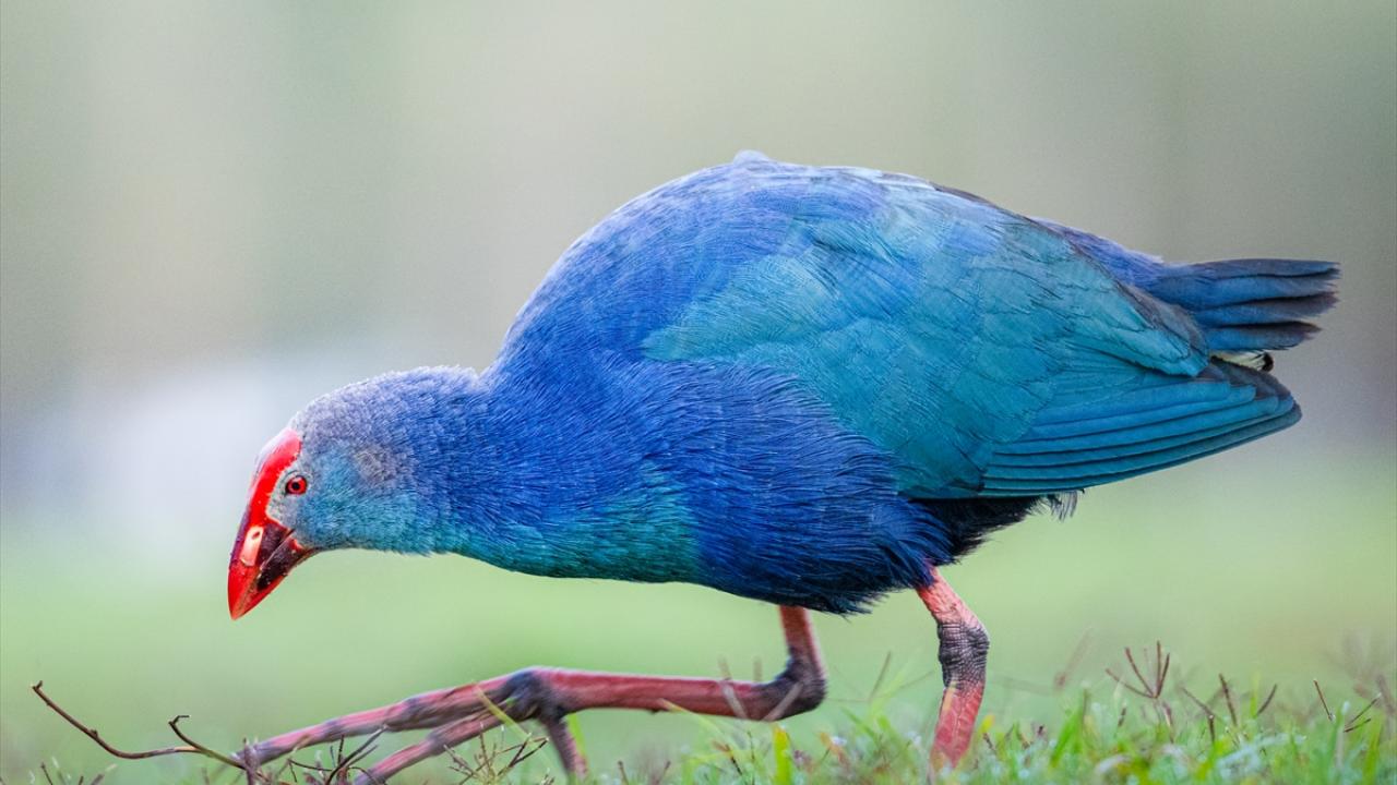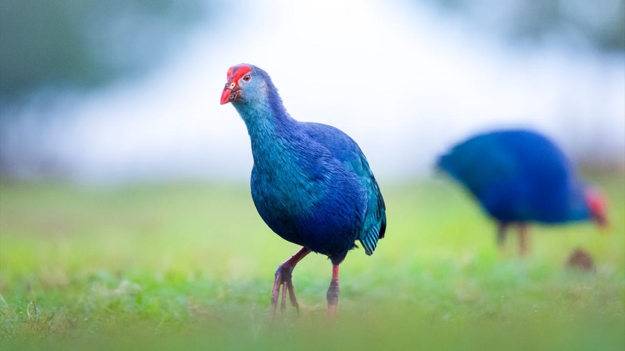 Delta içerisinde yer alan ve mavi tonlarındaki renkleri ile dikkat çeken saz horozları, günün ilk saatlerinde sazlıklardan çıkarak çayırlarda yemleniyor.