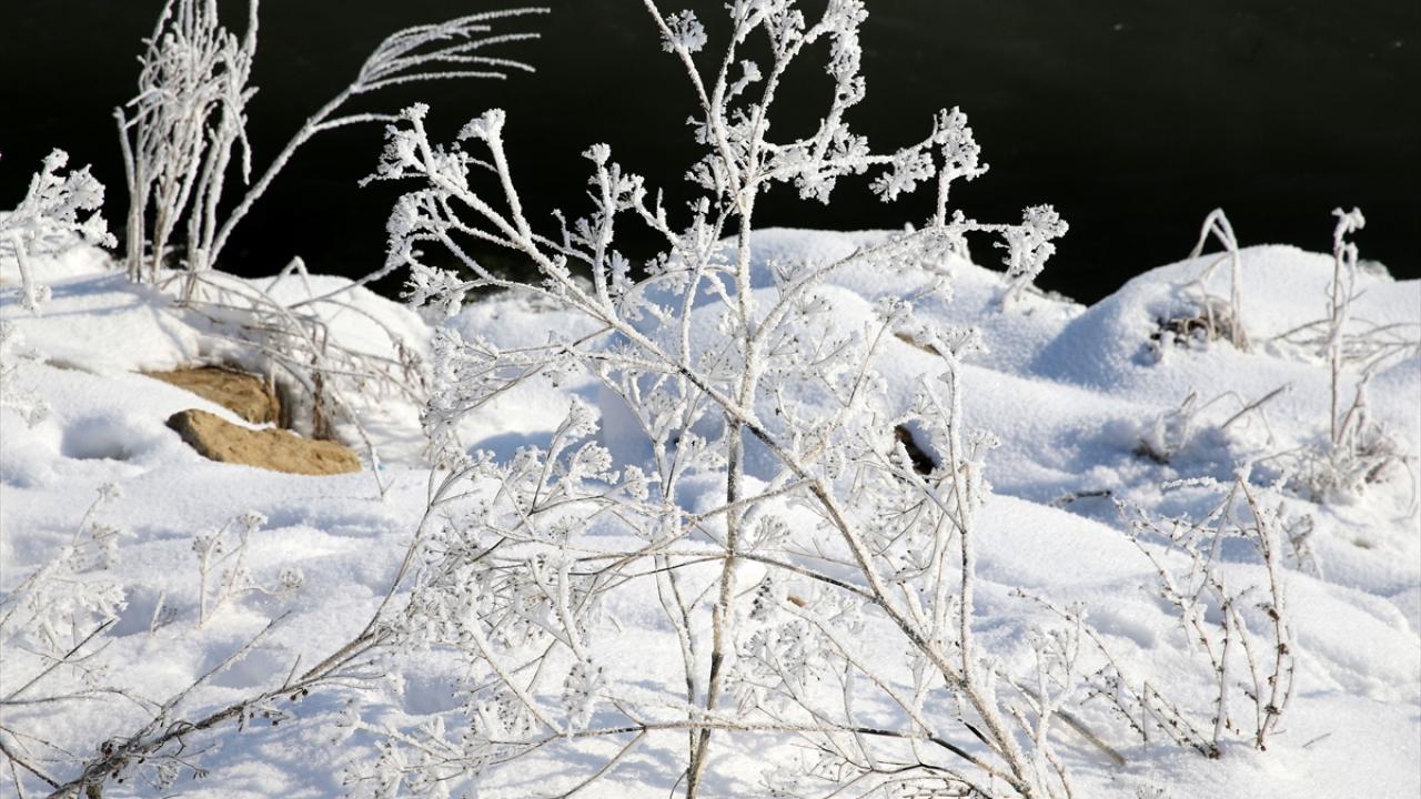 Nehrin kenarındaki otlarda da soğuk havanın etkisiyle kırağı oluştu.