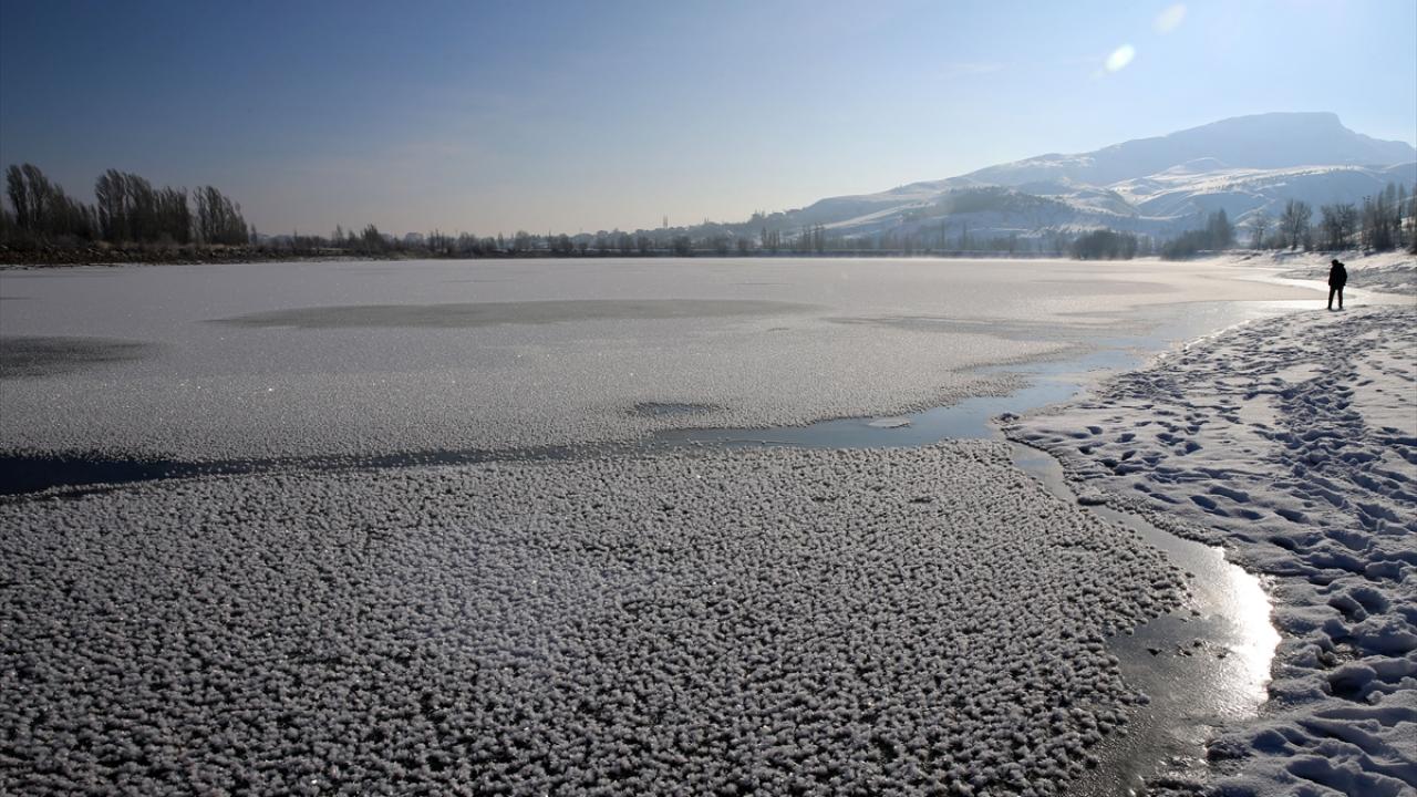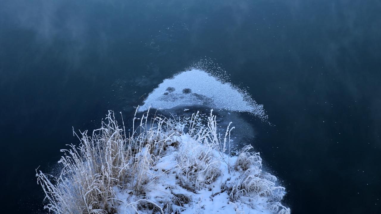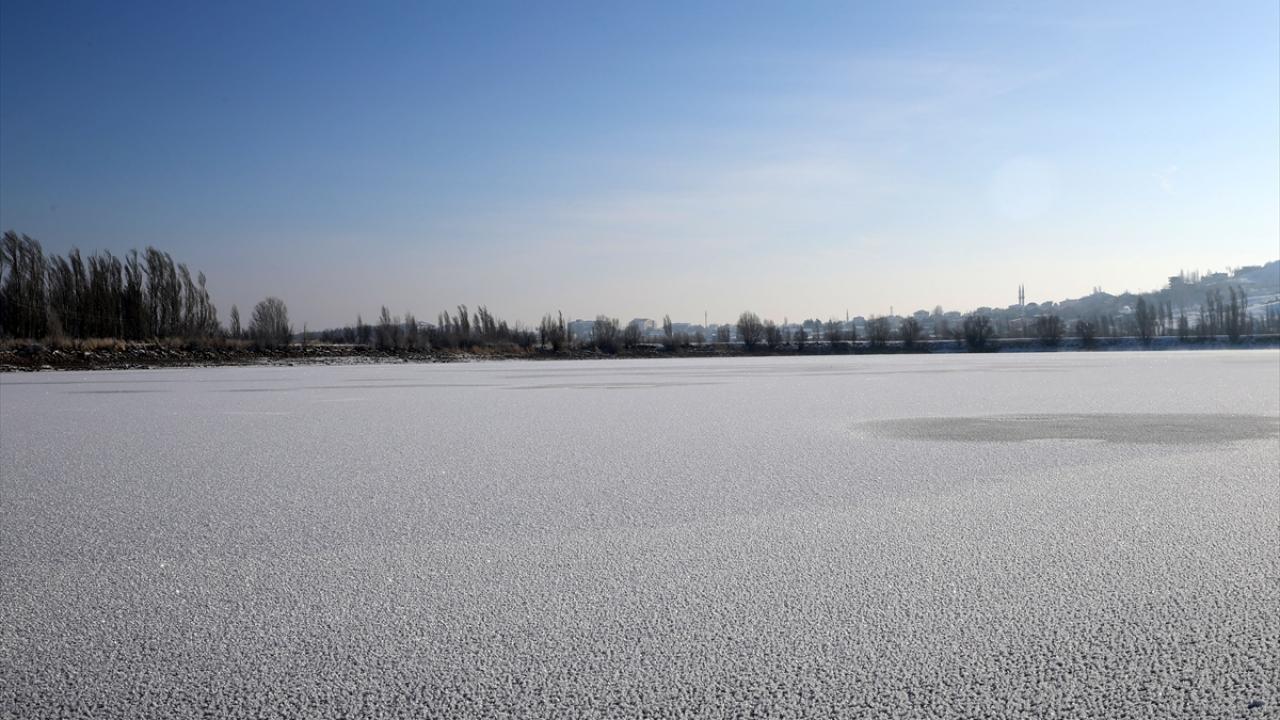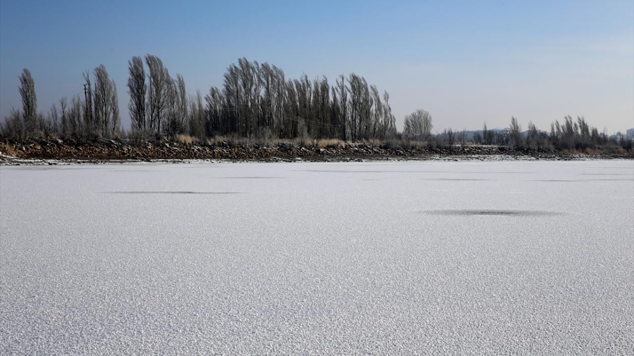 Karşıyaka Mahallesi`ndeki Serpincik Göleti de soğuk hava nedeniyle kısmen buzla kaplandı.