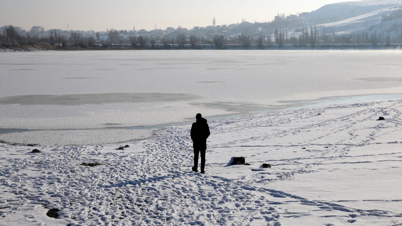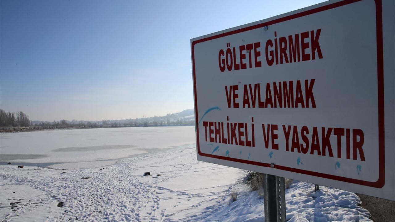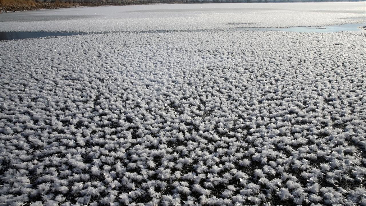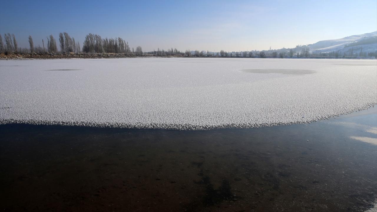 Karşıyaka Mahallesi`ndeki Serpincik Göleti de soğuk hava nedeniyle kısmen buzla kaplandı.