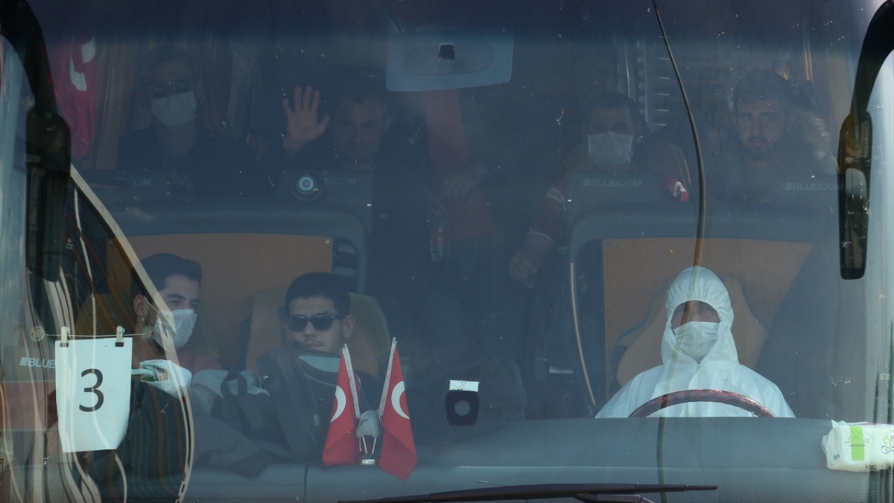 Geniş güvenlik önlemleri altında otobüslerden indirilen vatandaşlar, ateşleri ölçüldükten sonra yurtlara alındı.