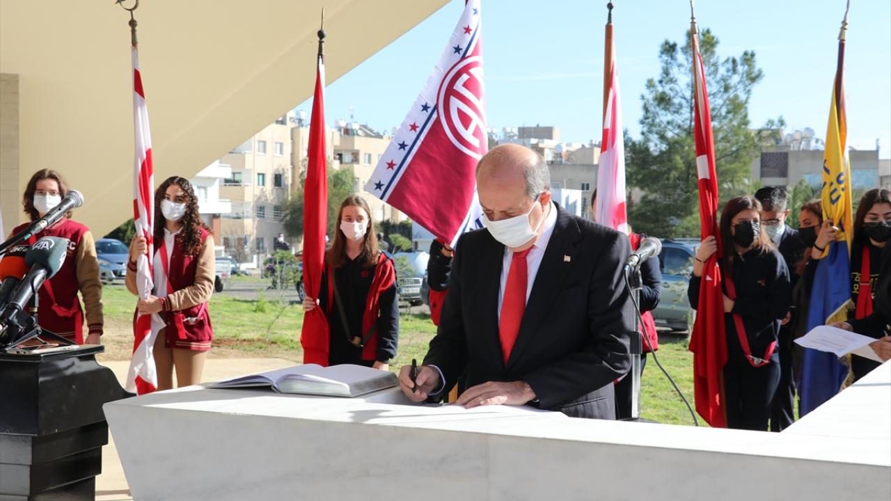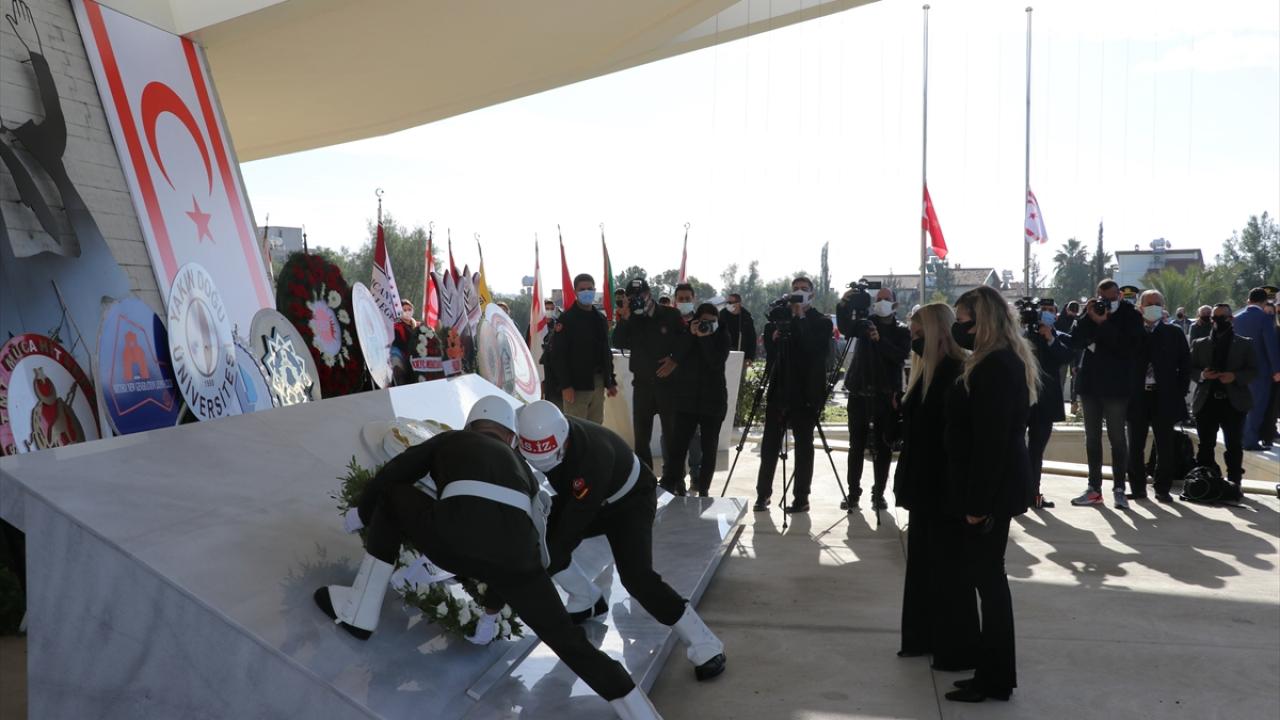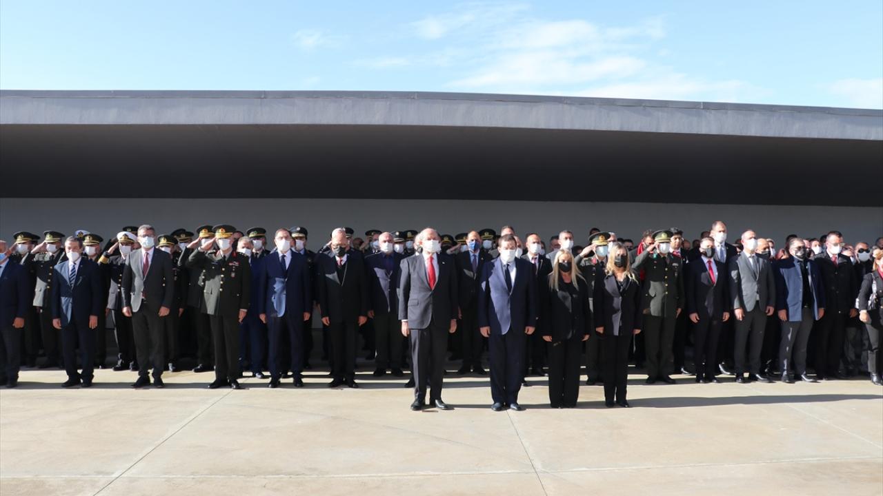 Cumhurbaşkanı Tatar ve Denktaş ailesinin çelenk bırakmasıyla başlayan tören, saygı duruşu ve İstiklal Marşı`nın okunmasıyla devam etti.