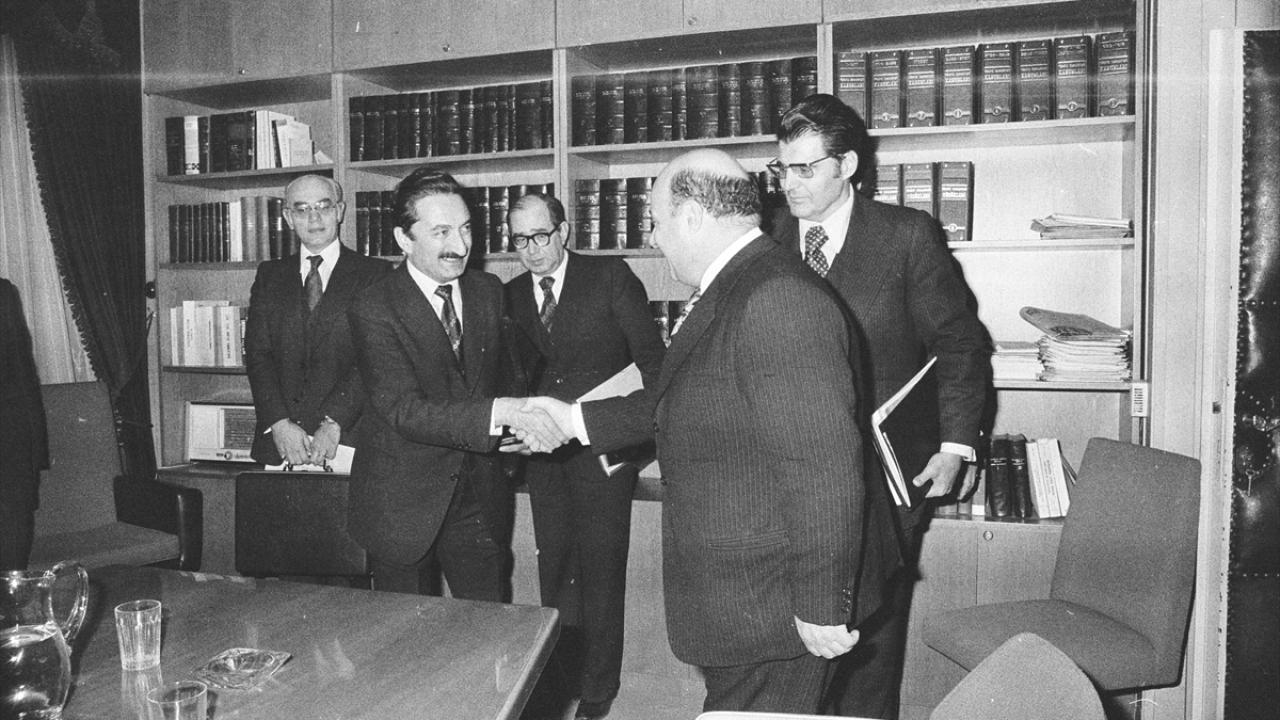 Dönemin Cumhurbaşkanı Celal Bayar (sol 2), 1958`de Çankaya Köşkü`nde Kıbrıs Türk Toplumu liderleri Rauf Denktaş (solda), Fazıl Küçük (sağ 2) ve Orhan Müderrisoğlu`nu kabul etmişti. (Arşiv)