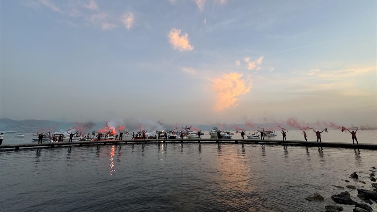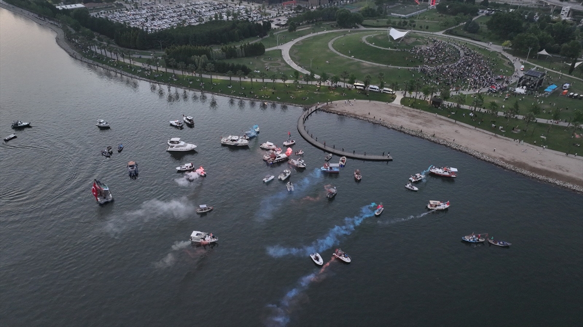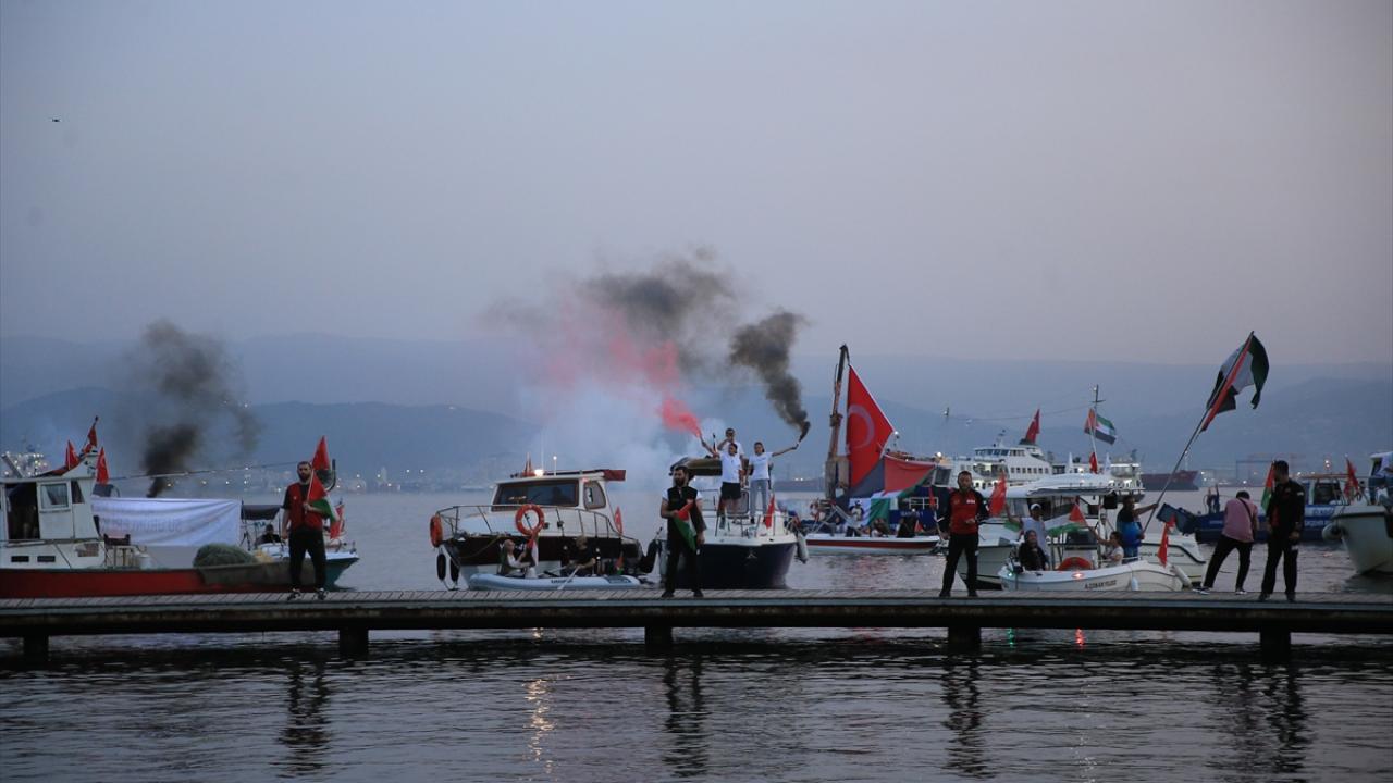 Öte yanan aralarında Kocaeli Büyükşehir Belediyesine ait yolcu vapurunun da bulunduğu 100`e yakın tekne ve deniz aracı, Türkiye ve Filistin bayrakları asarak Sekapark iskelesine geldi.
