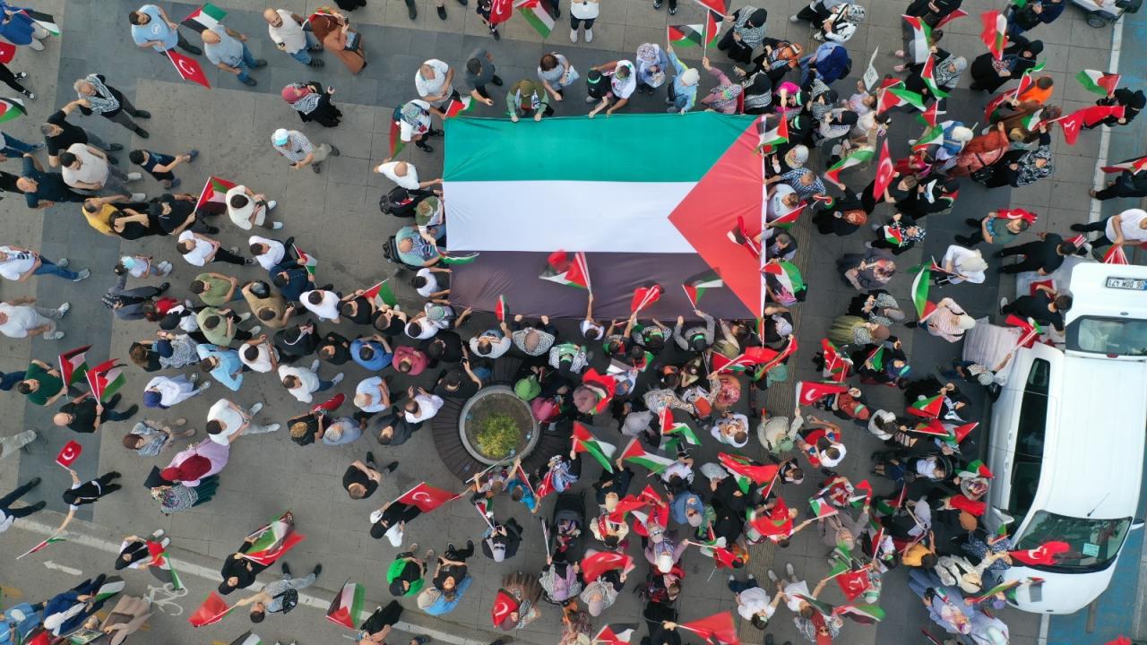 İzmit`te 3 farklı noktada toplanan Filistin destekçileri, Sekapark`a doğru yürüyüş başlattı. Sekapark`ın girişinde buluşan gruplar, buradan Uçurtma Tepesi`ne kadar "Büyük Gazze Yürüyüşü" düzenledi.