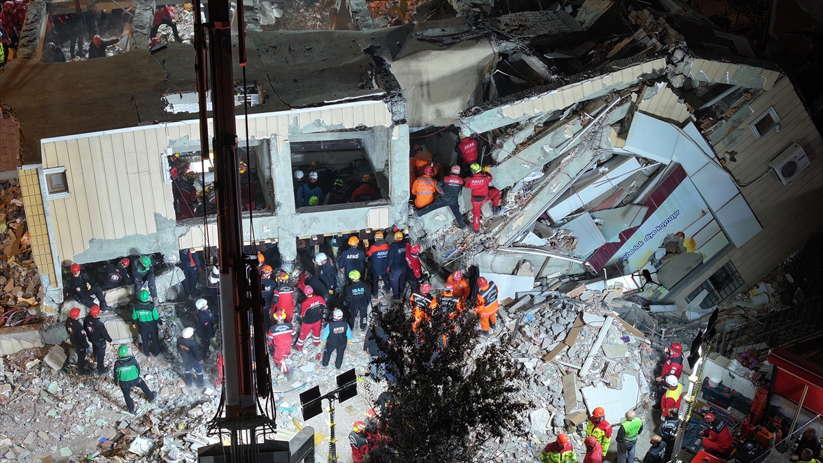 Yüzlerce kişiden oluşan arama kurtarma ekipleri, alandaki molozları kovalarla çıkarırken, beton bloklar vinç desteğiyle askıya alındı.