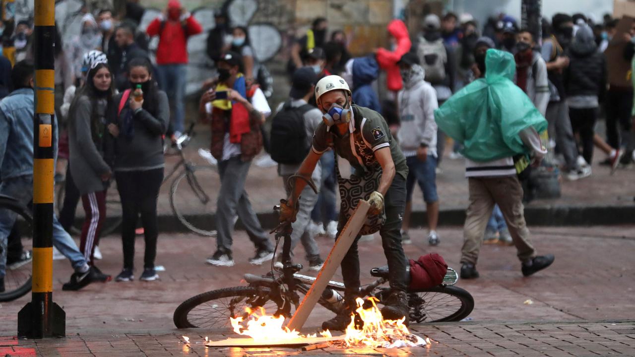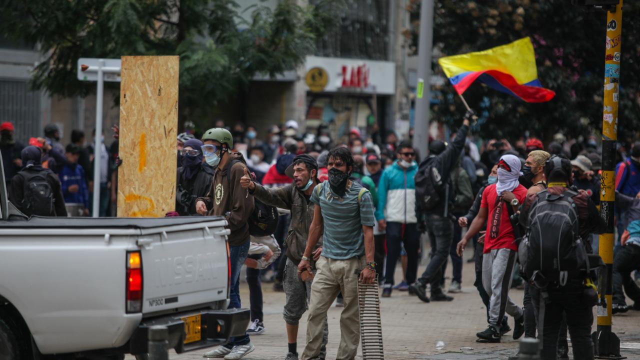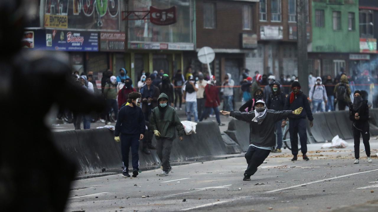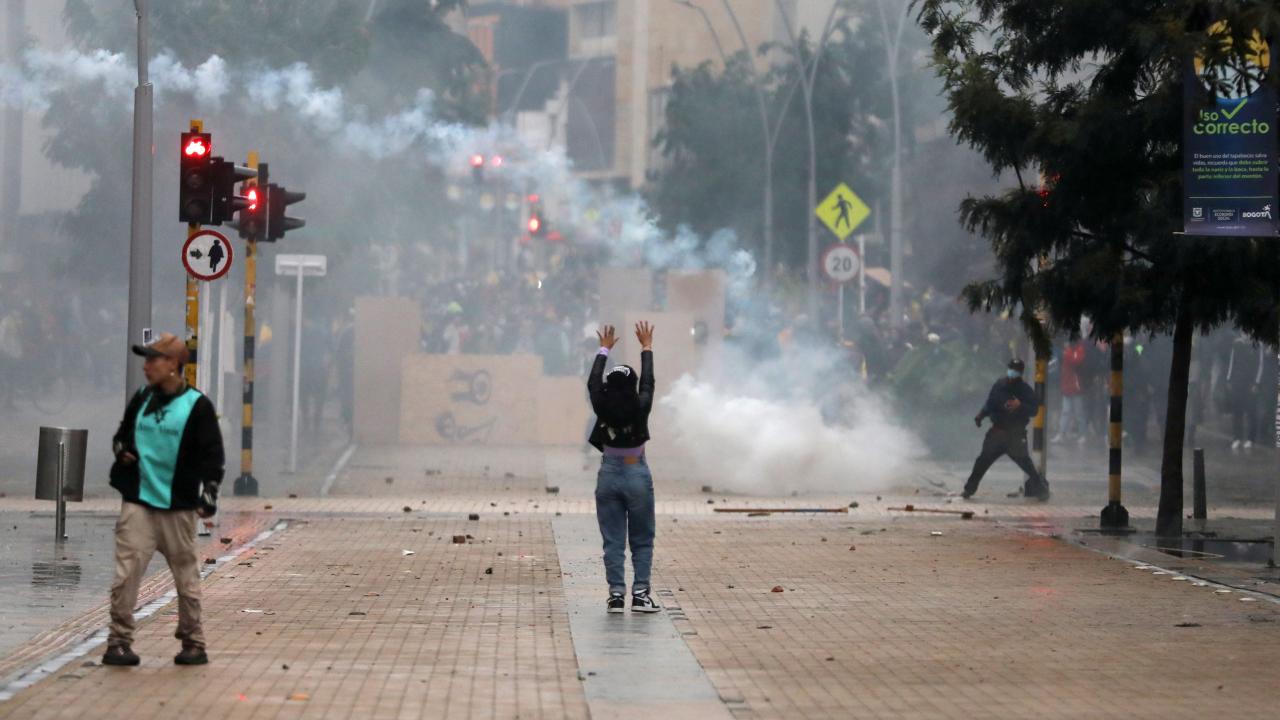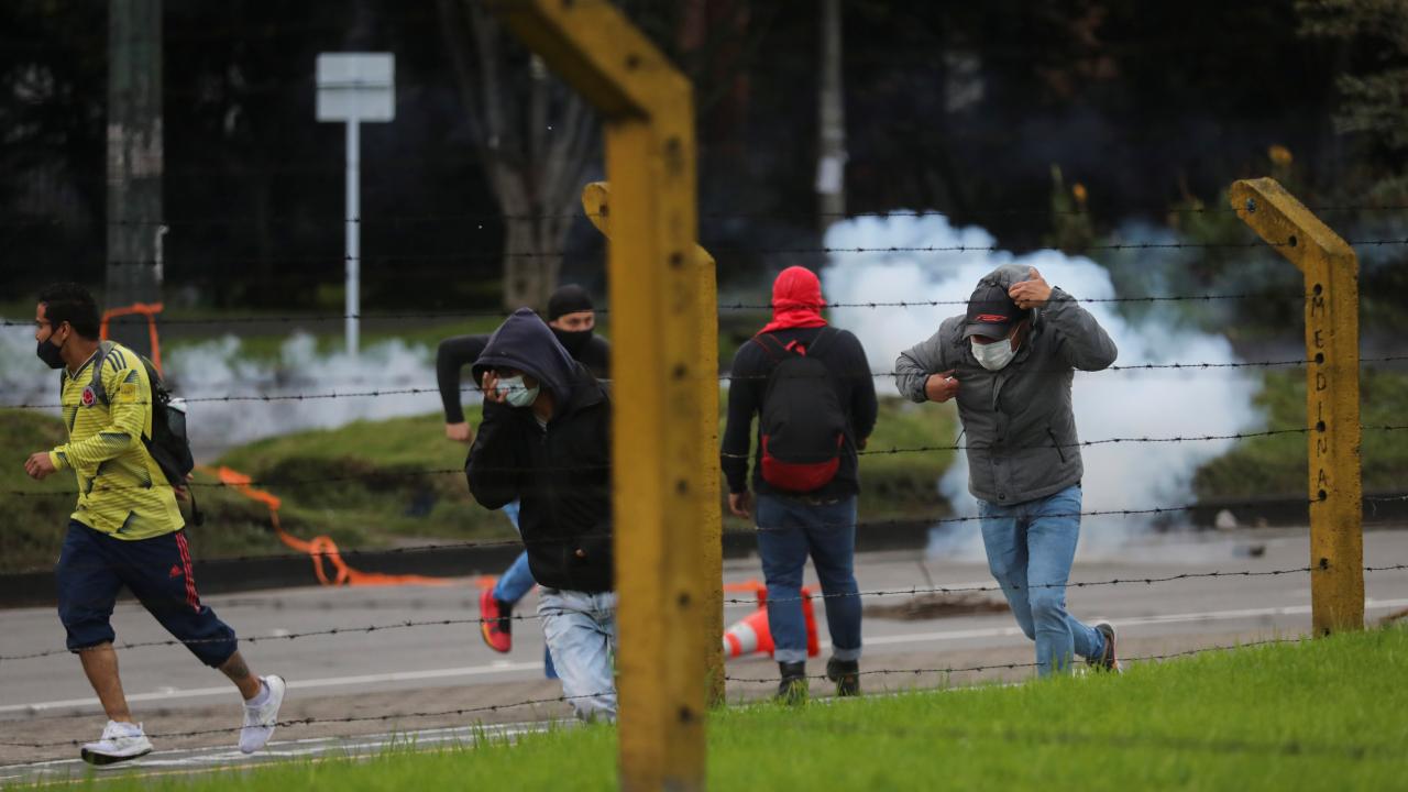 Protestoculardan bazılarının polise taş ve hava fişek fırlatması üzerine Kolombiya toplumsal olaylara müdahale birimi ESMAD mensubu polisler, göstericilere göz yaşartıcı gazla saldırdı.