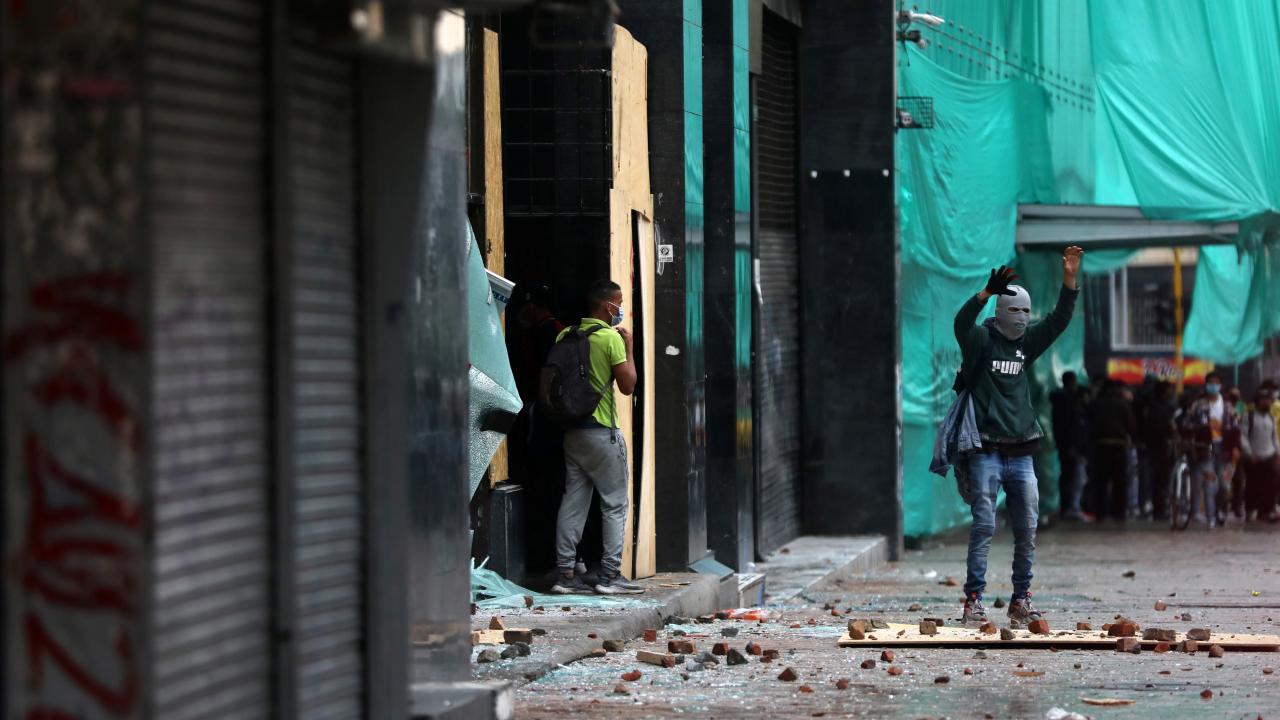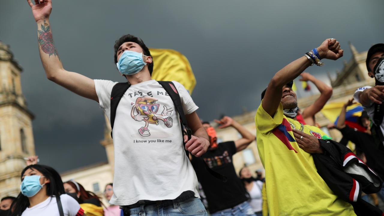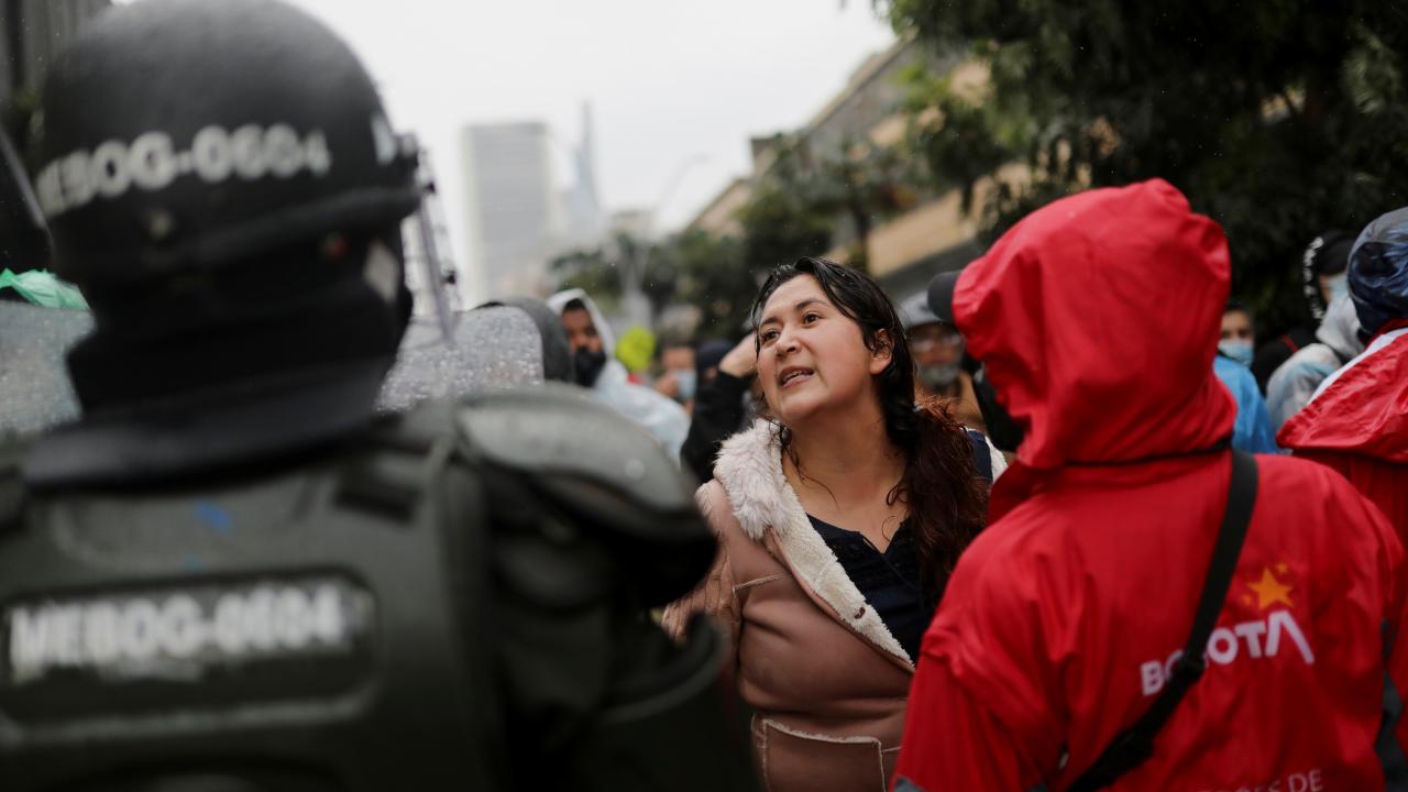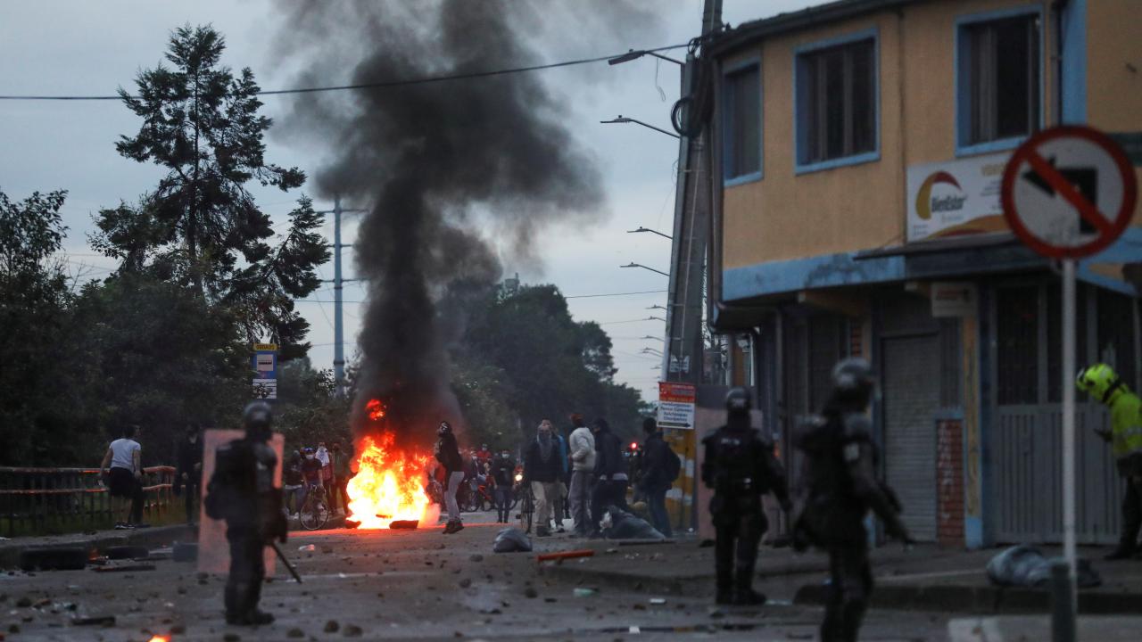 Protestoculardan bazılarının polise taş ve hava fişek fırlatması üzerine Kolombiya toplumsal olaylara müdahale birimi ESMAD mensubu polisler, göstericilere göz yaşartıcı gazla saldırdı.