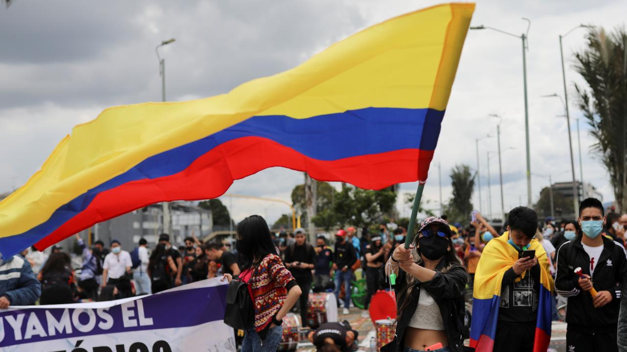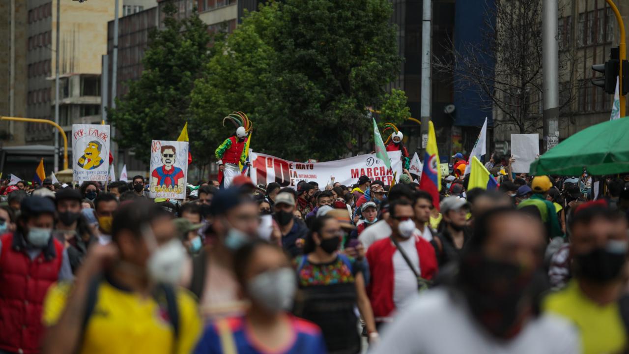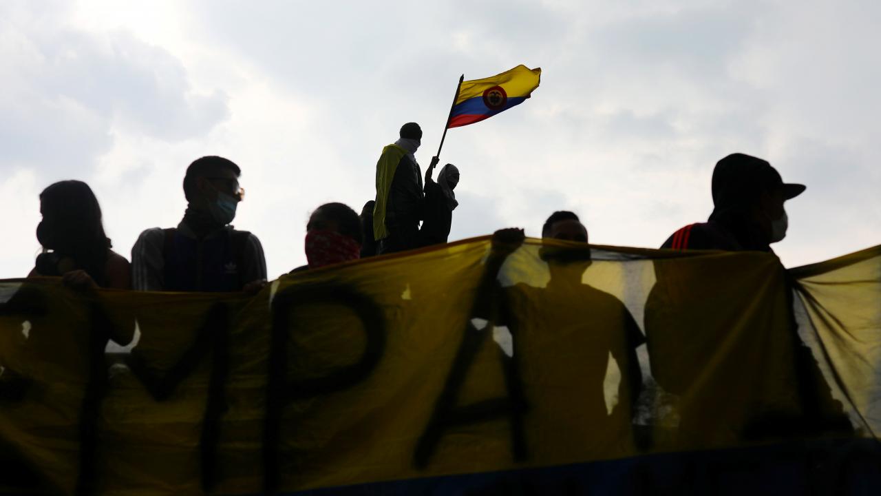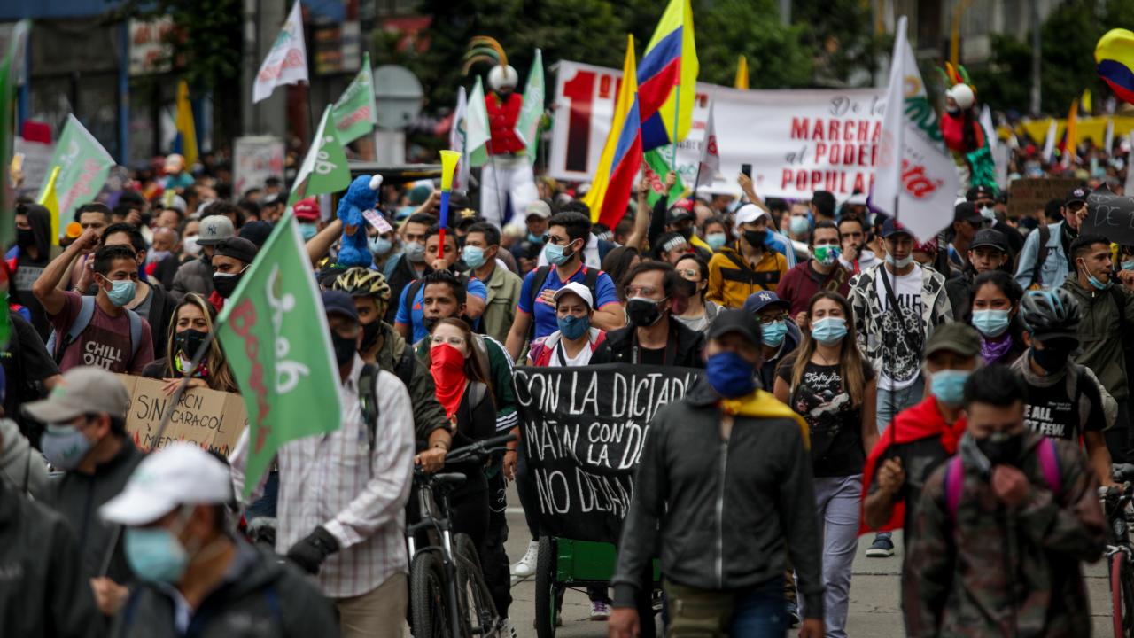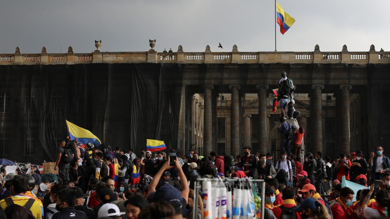 Protestoculardan bazılarının polise taş ve hava fişek fırlatması üzerine Kolombiya toplumsal olaylara müdahale birimi ESMAD mensubu polisler, göstericilere göz yaşartıcı gazla saldırdı.
