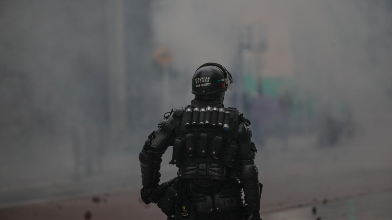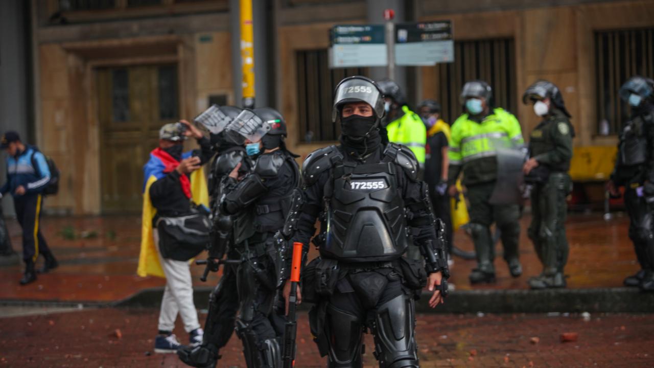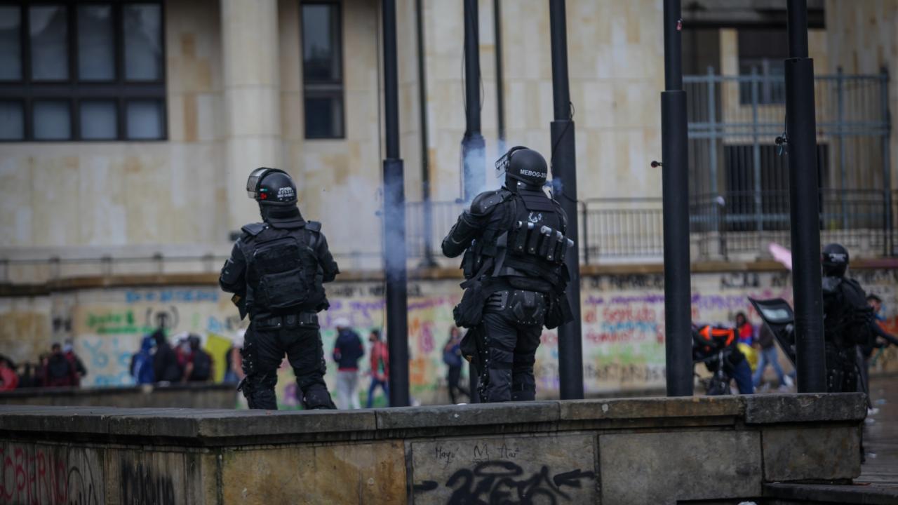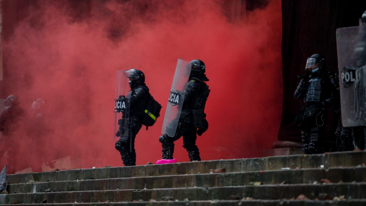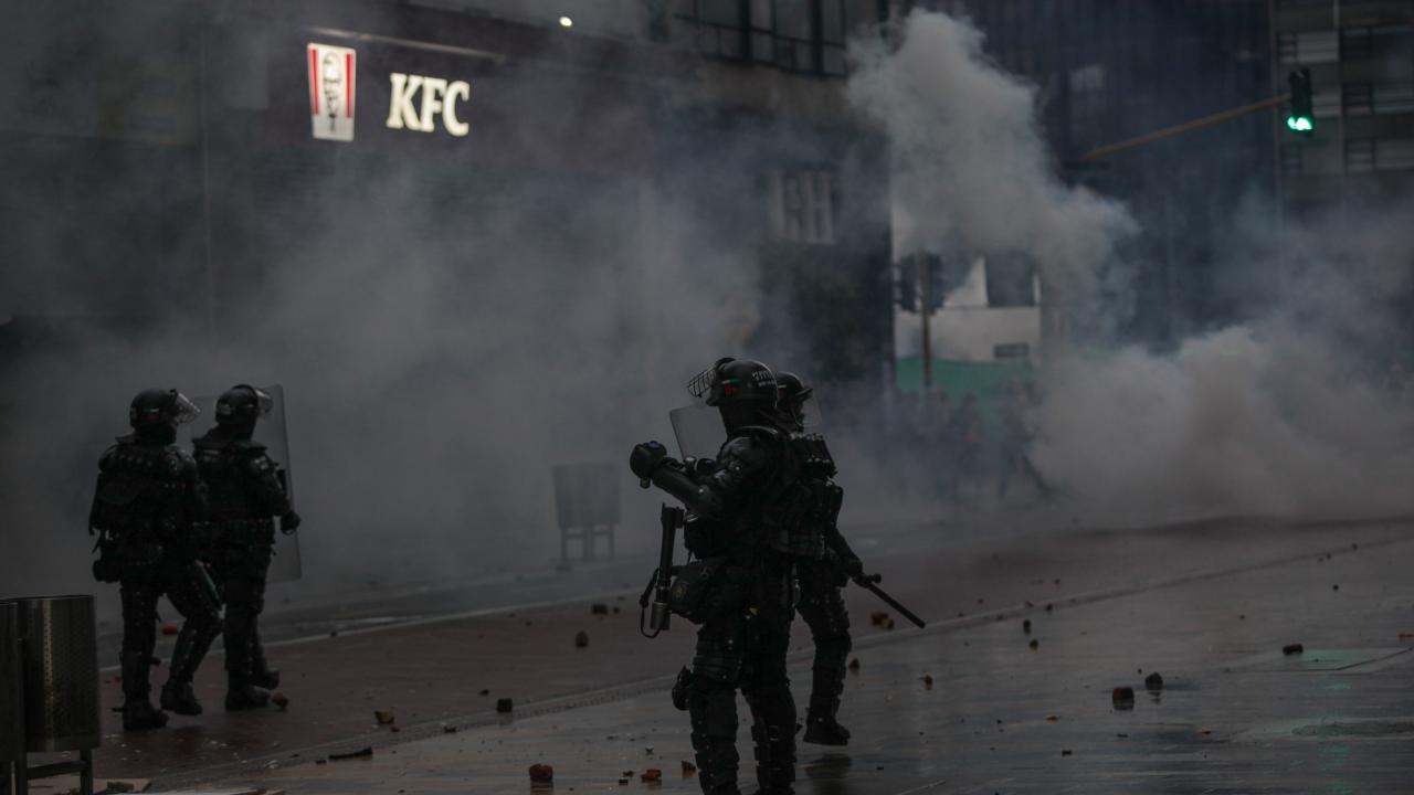 Göstericilerden bazı grupların Ulusal Kongre Binası`na taşlarla saldırması üzerine Kolombiya toplumsal olaylara müdahale birimi ESMAD mensubu polisler, göstericilere göz yaşartıcı gaz ve su sıkarak müdahale etti.