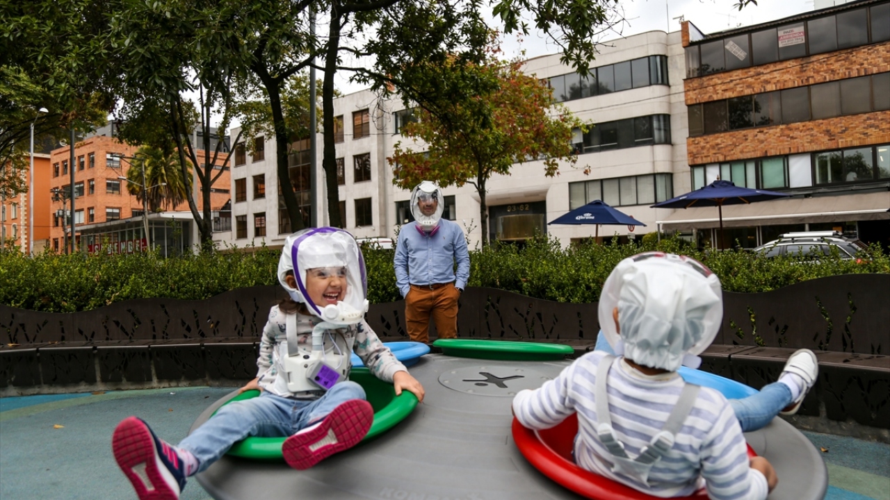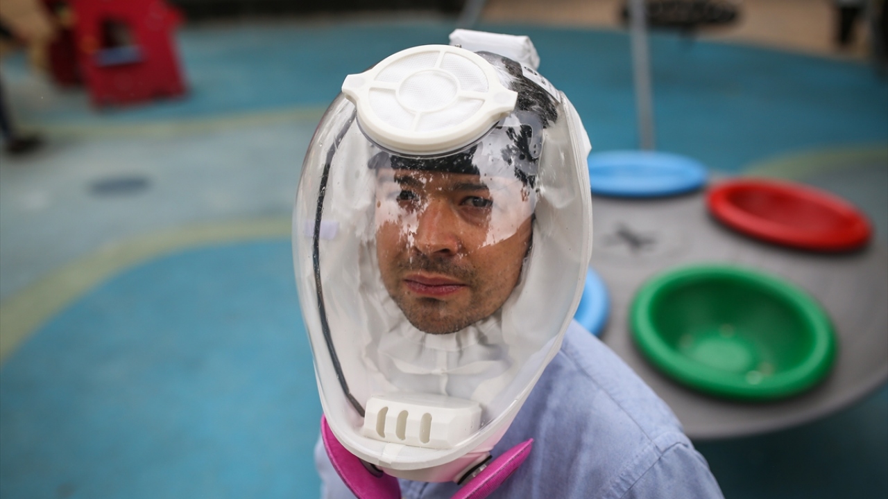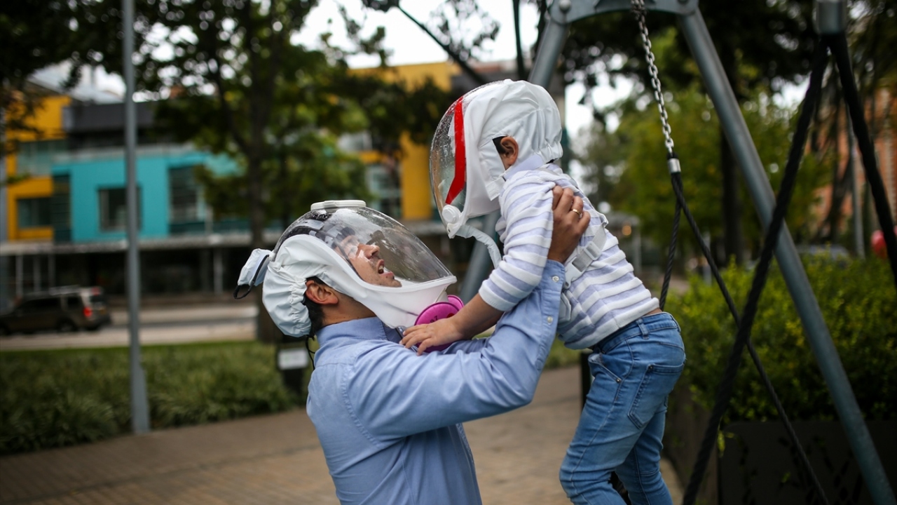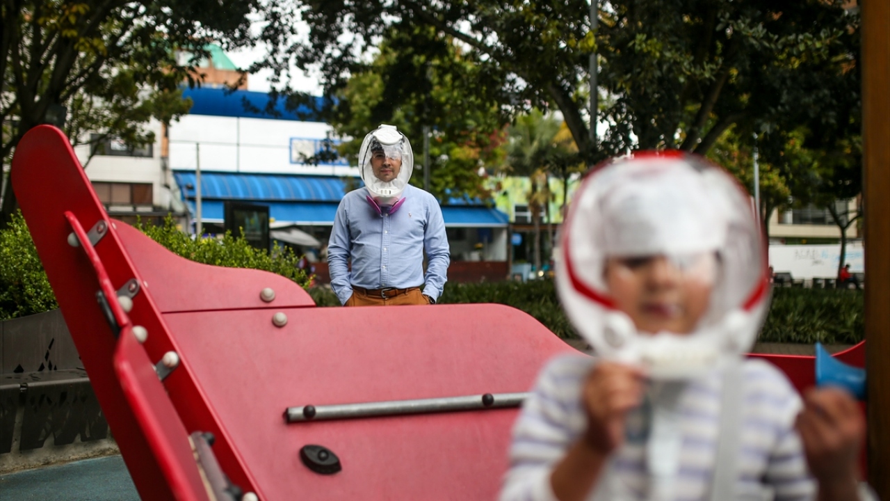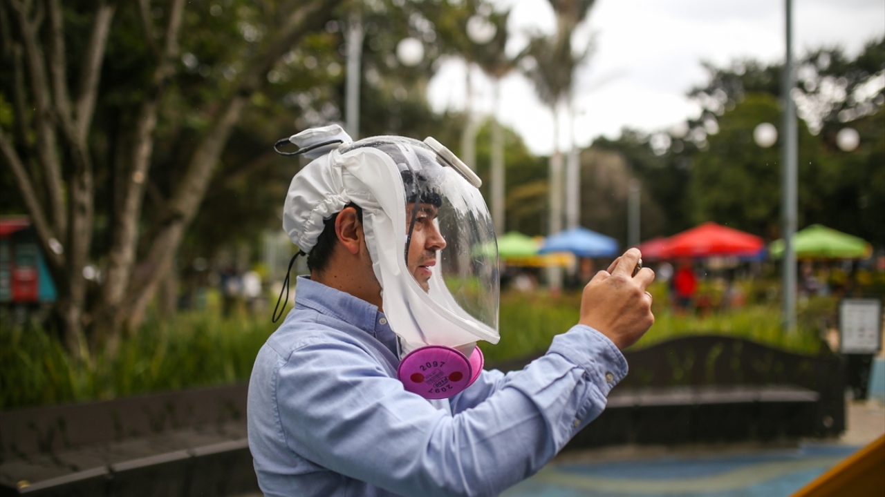 Kolombiya'nın başkenti Bogota'da, mühendis girişimciler yeni tip koronavirüs (COVID-19) ile mücadele kapsamında, yüzü bir balon şeklinde kaplayarak nefes almayı kolaylaştıracak yeni bir kask ürettiler.