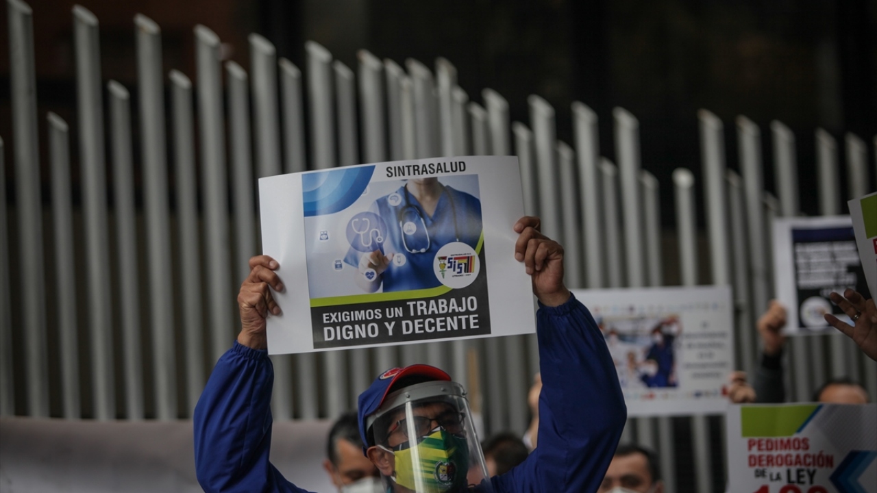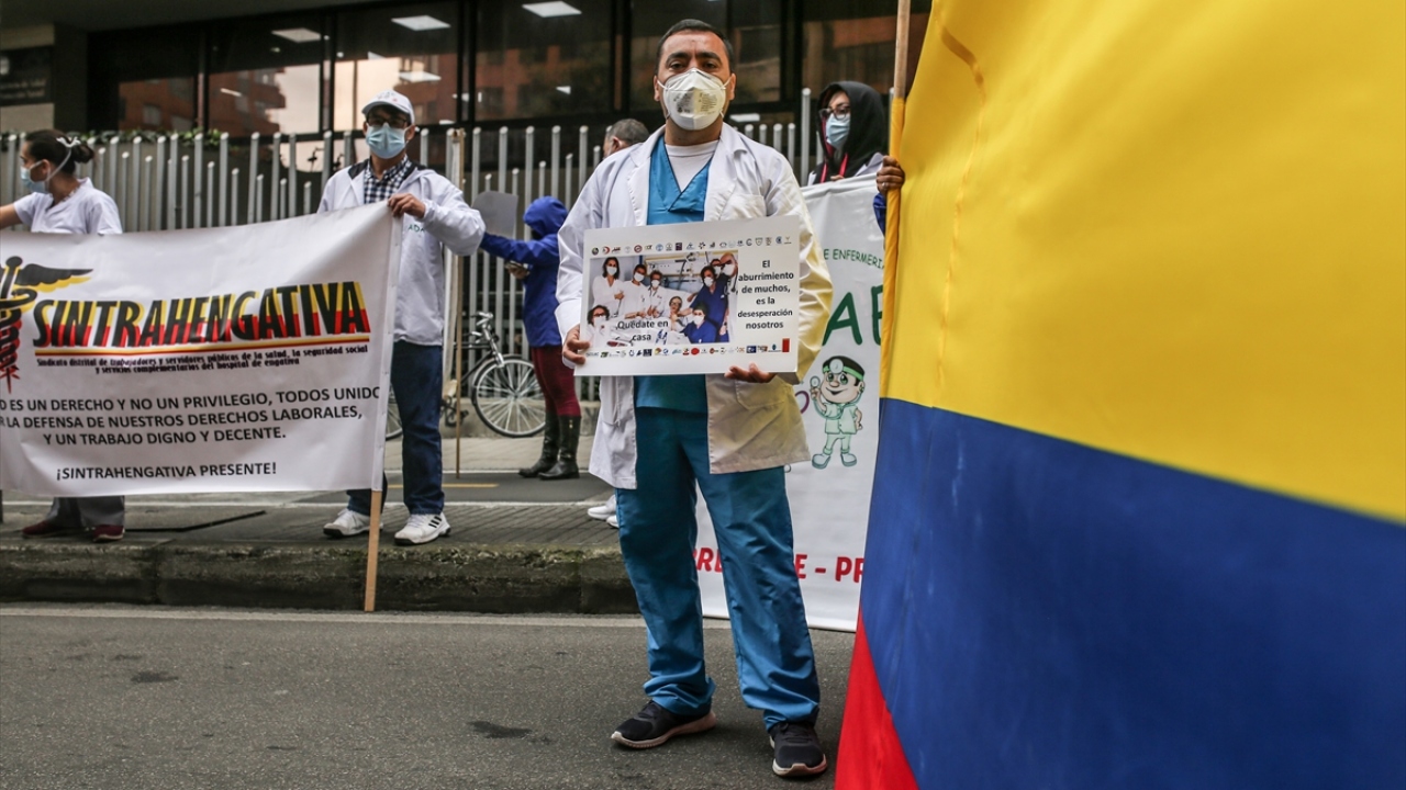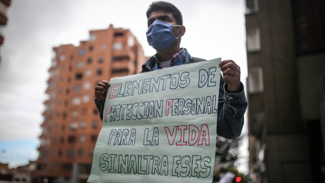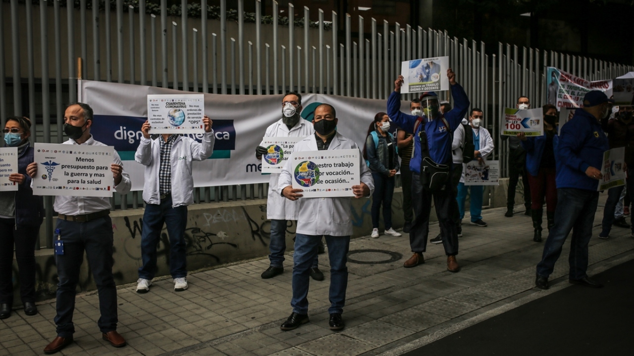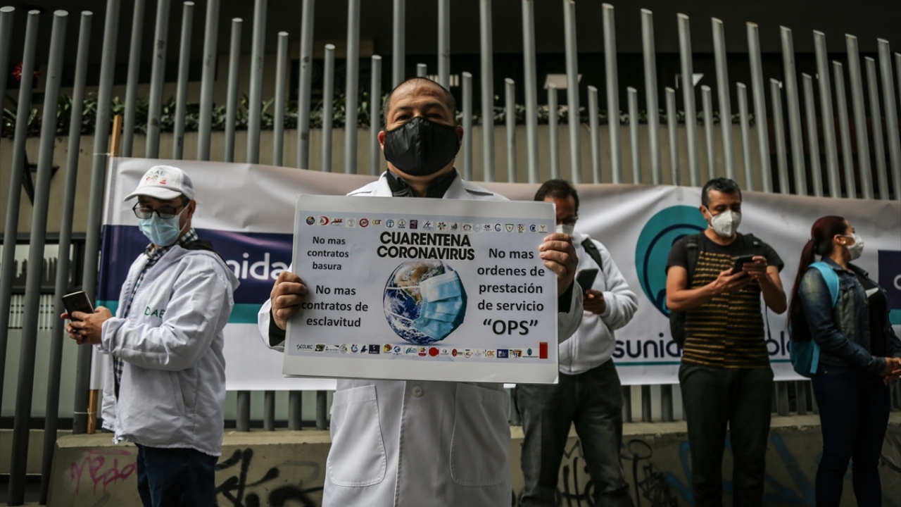 Kolombiya'nın başkenti Bogota'da, yeni tip koronavirüs (Covid-19) salgını ile mücadele yoğun olarak devam ederken, sağlık çalışanları, daha fazla koruyucu ekipman ve güvenli çalışma koşulları talep ederek maaşlardaki gecikmeleri protesto etti.