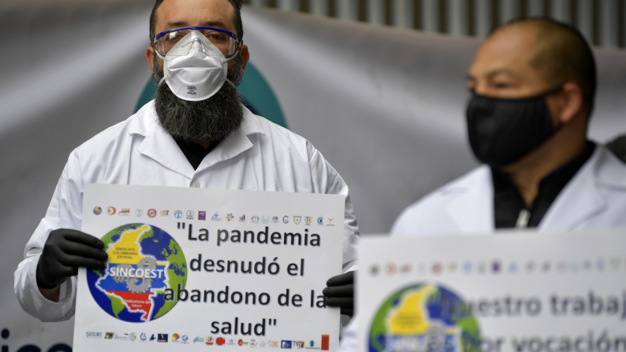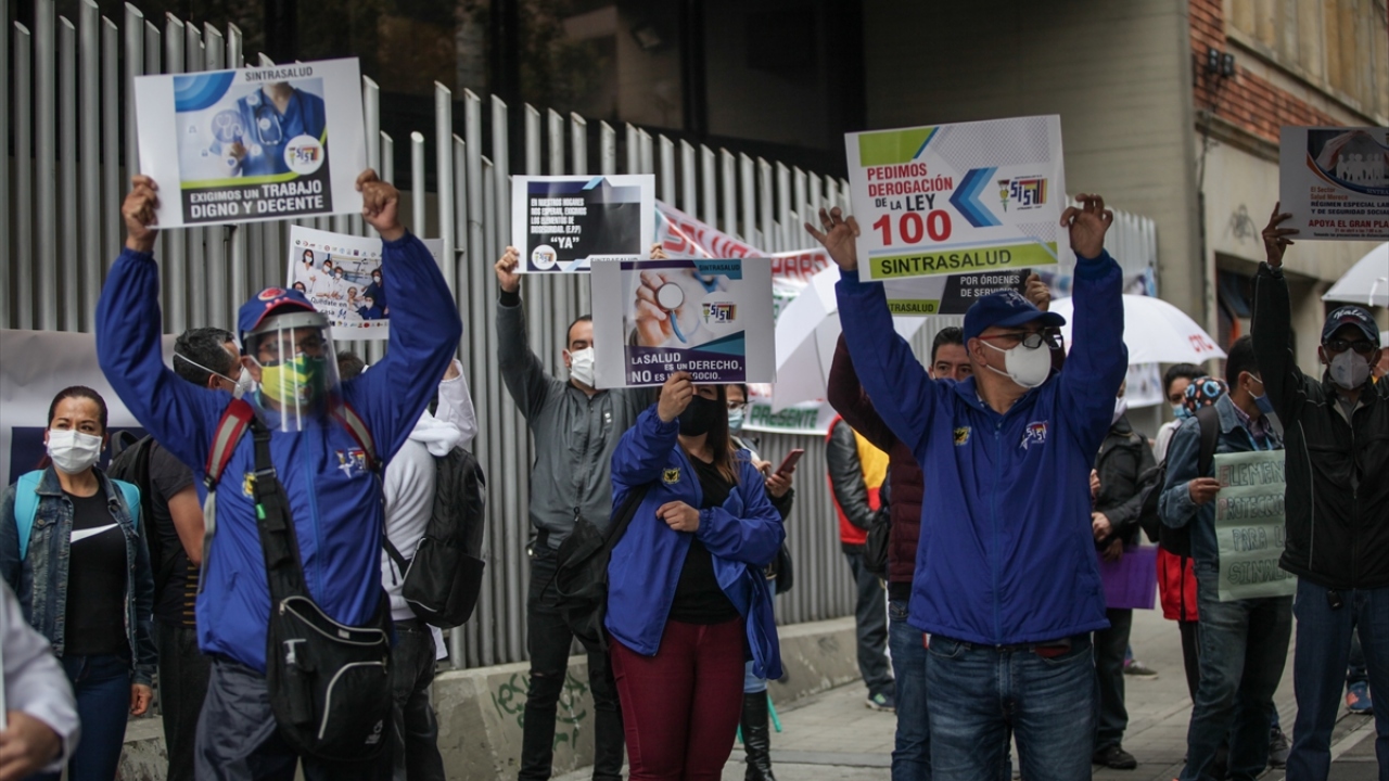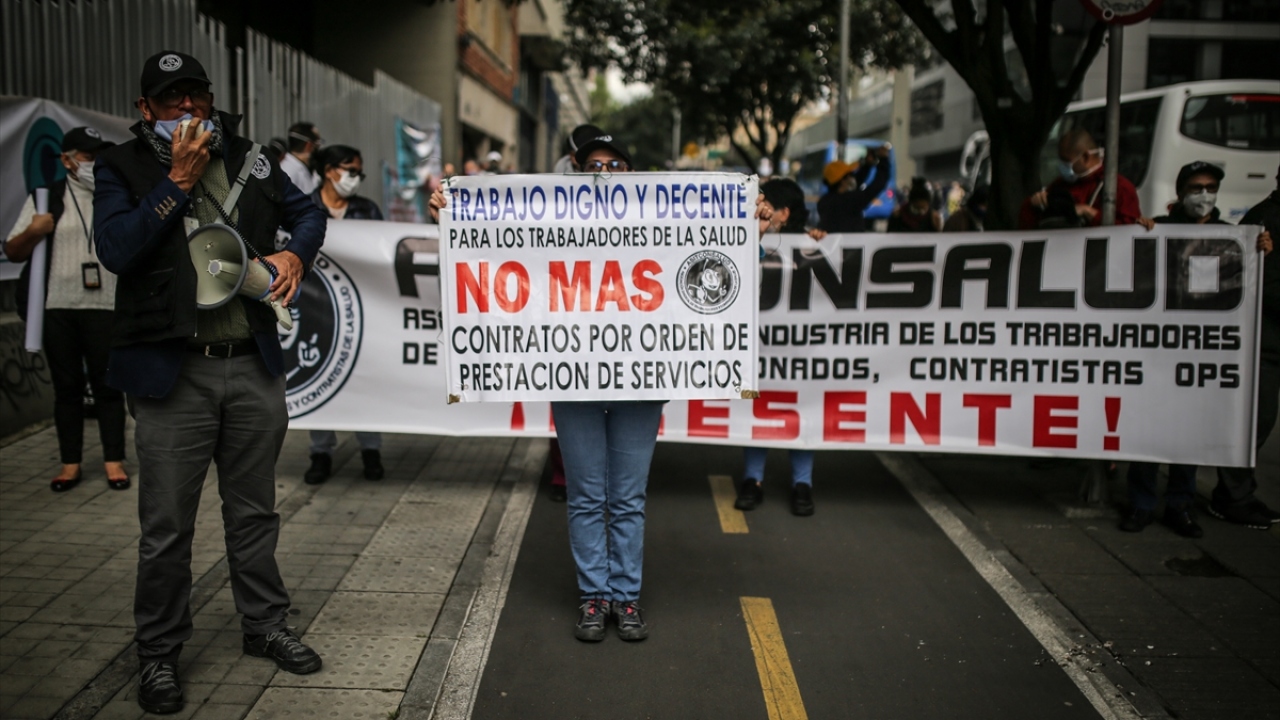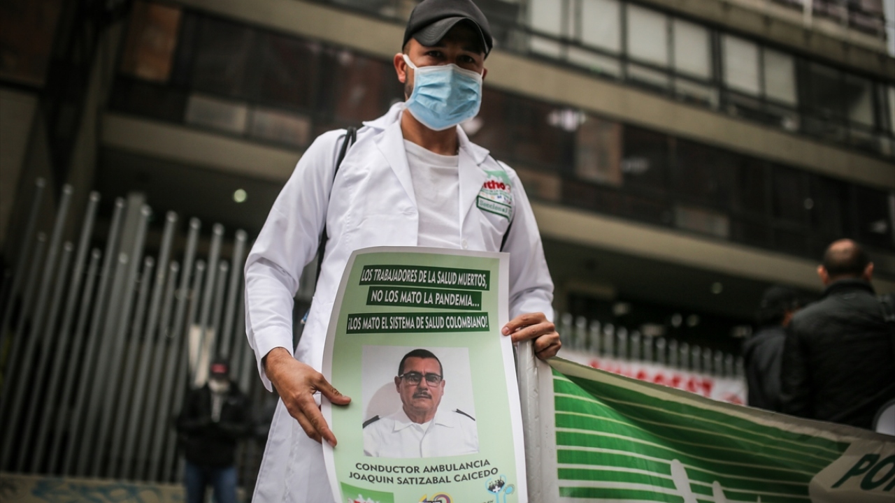 Kolombiya'nın başkenti Bogota'da, yeni tip koronavirüs (Covid-19) salgını ile mücadele yoğun olarak devam ederken, sağlık çalışanları, daha fazla koruyucu ekipman ve güvenli çalışma koşulları talep ederek maaşlardaki gecikmeleri protesto etti.
