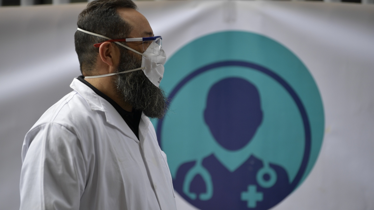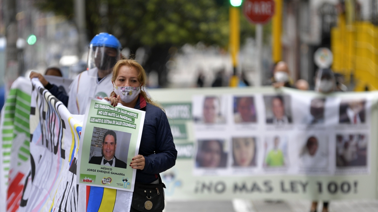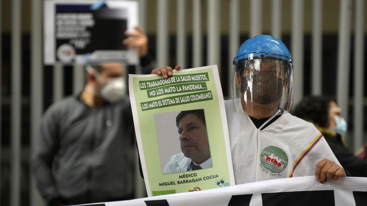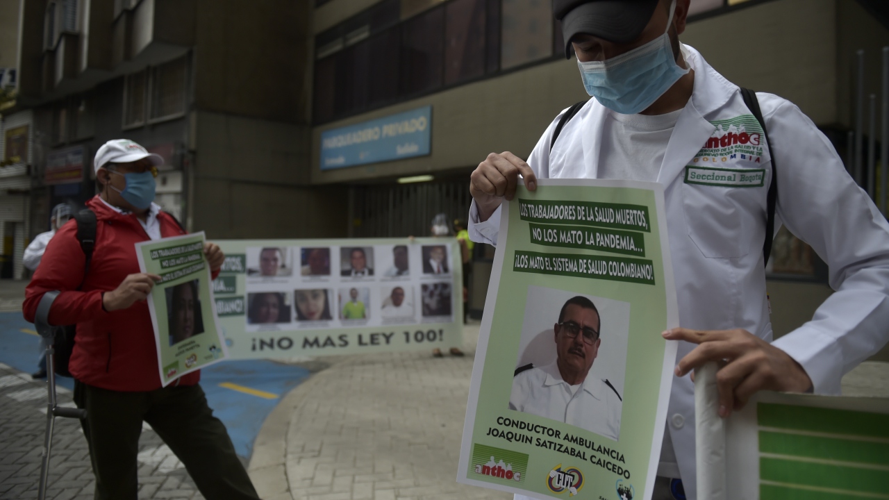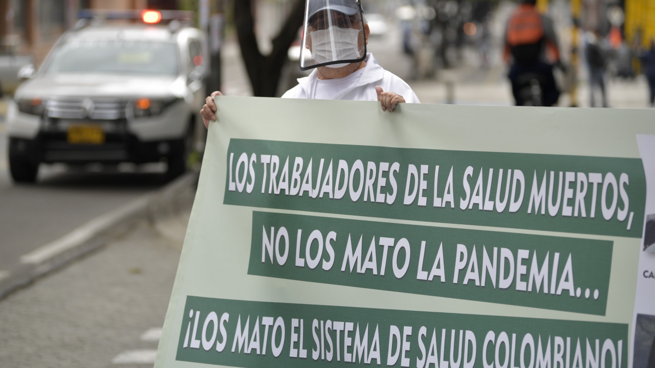 Kolombiya'nın başkenti Bogota'da, yeni tip koronavirüs (Covid-19) salgını ile mücadele yoğun olarak devam ederken, sağlık çalışanları, daha fazla koruyucu ekipman ve güvenli çalışma koşulları talep ederek maaşlardaki gecikmeleri protesto etti.