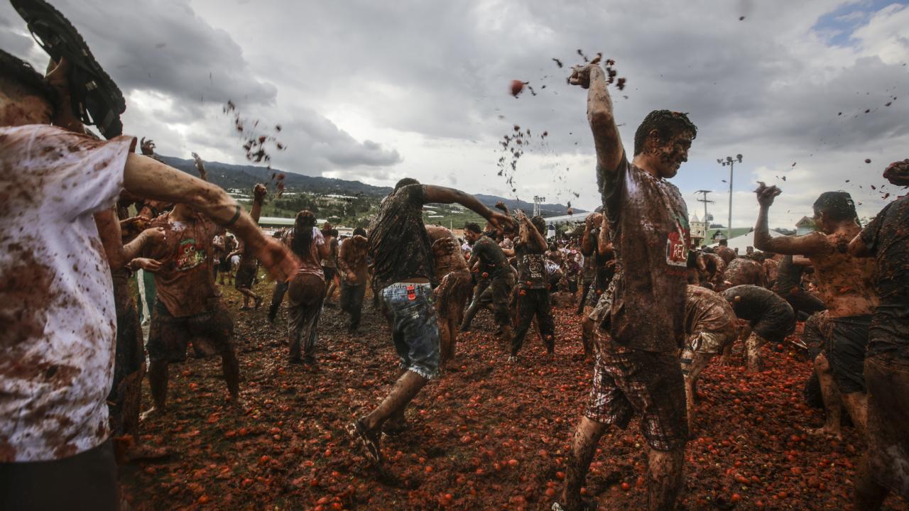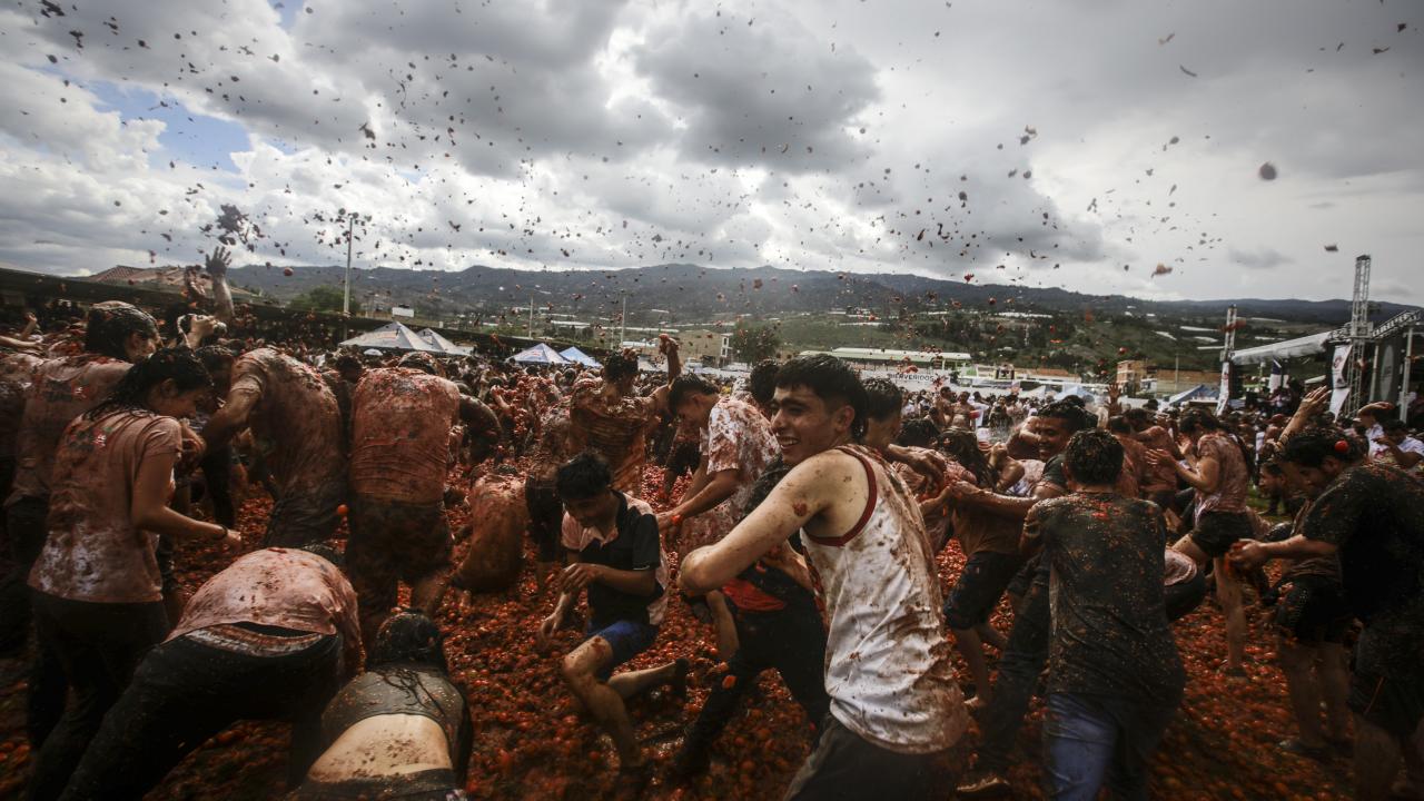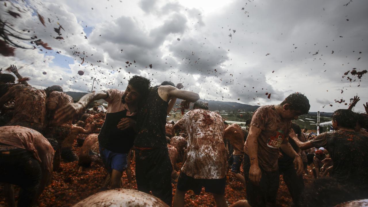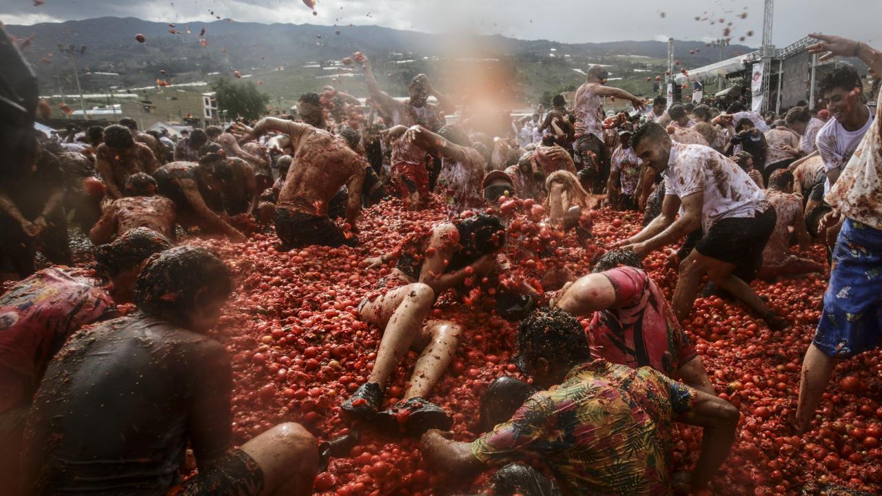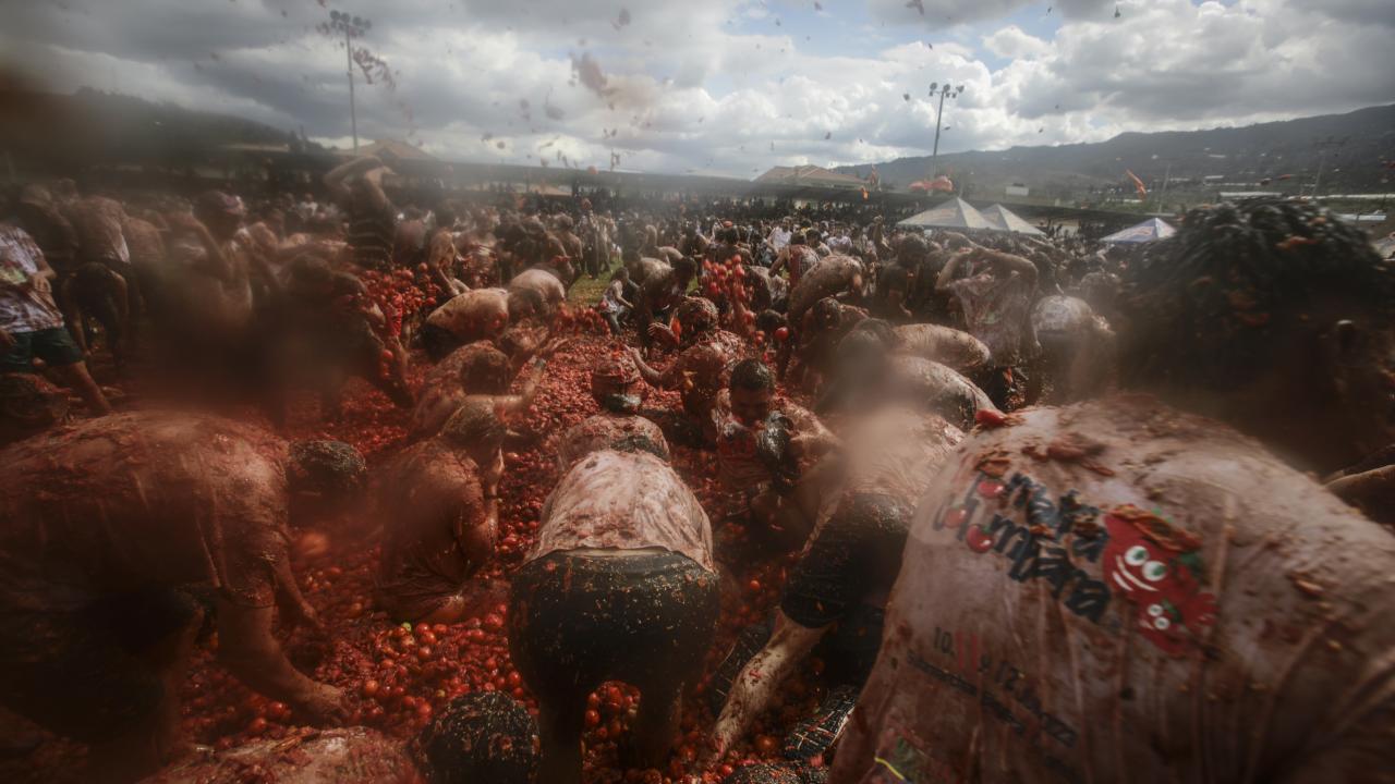 Boyaca yönetim bölgesine bağlı Stumarchan kentinde, bu yıl 14`üncüsü organize edilen festival kapsamında bir araya gelen yüzlerce kişi 40 ton domatesi birbirlerine fırlattı.