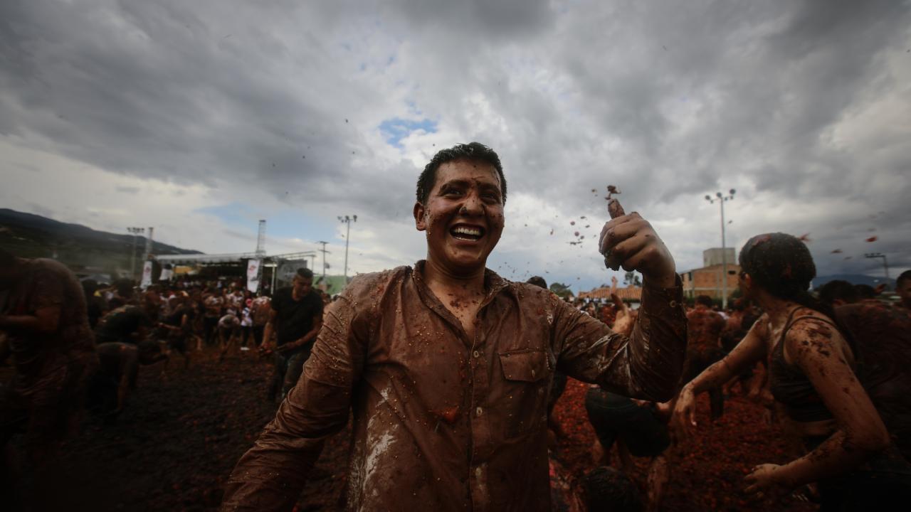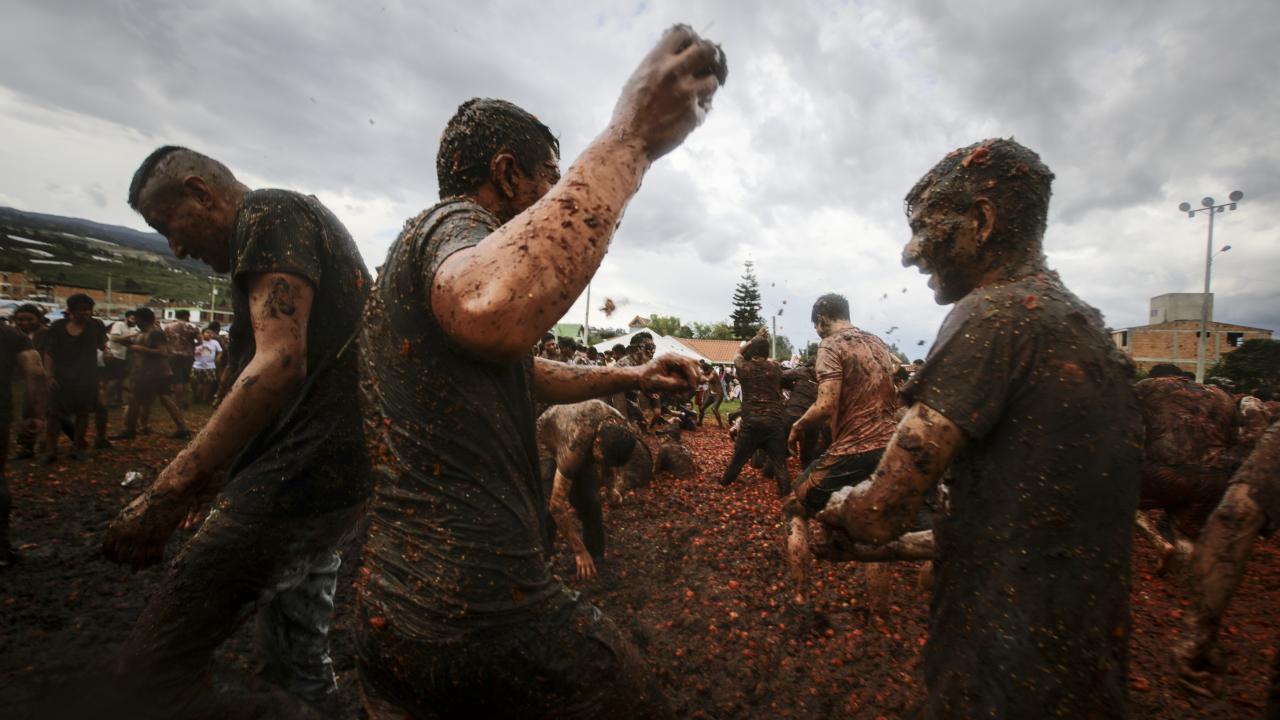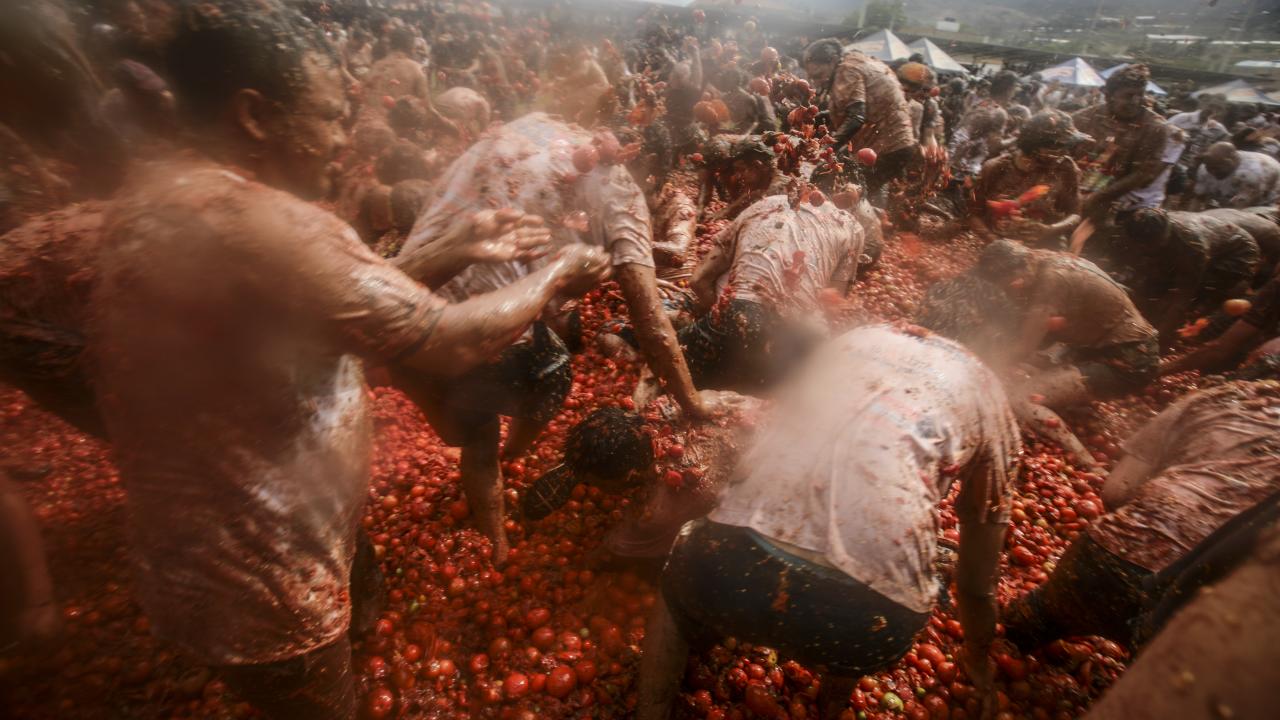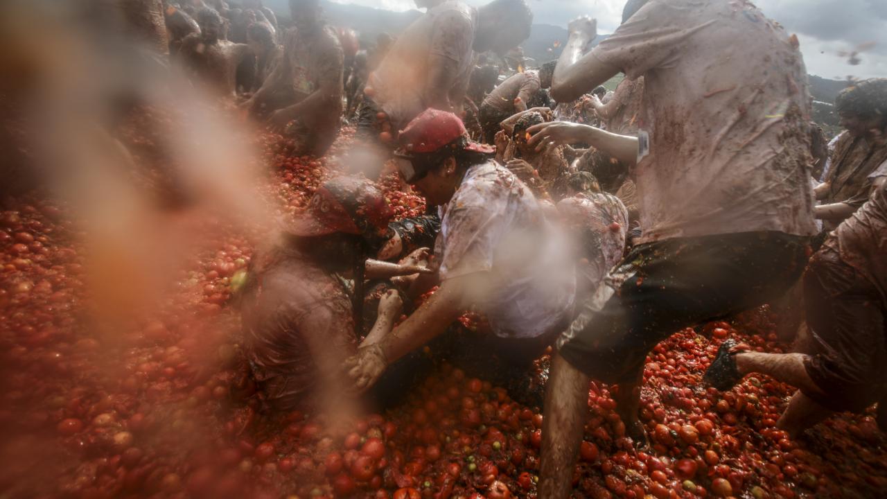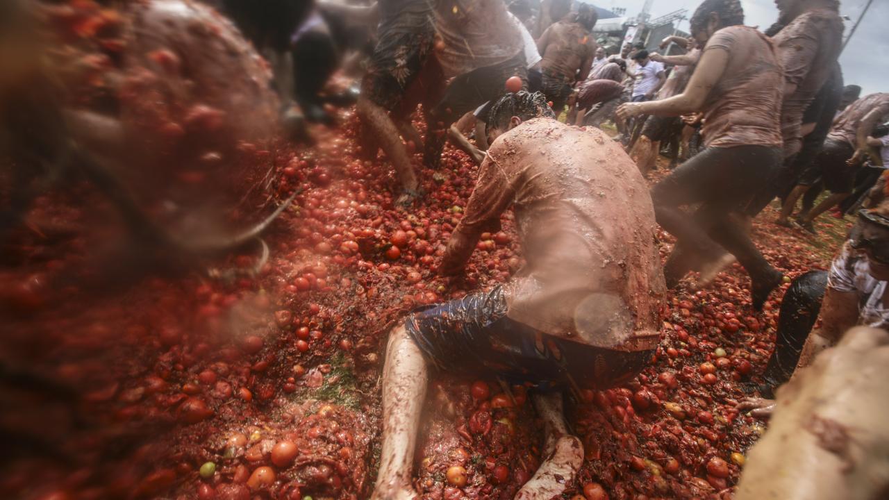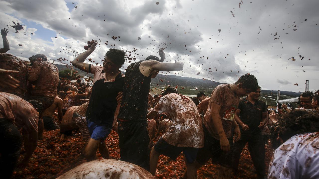 Boyaca yönetim bölgesine bağlı Stumarchan kentinde, bu yıl 14`üncüsü organize edilen festival kapsamında bir araya gelen yüzlerce kişi 40 ton domatesi birbirlerine fırlattı.